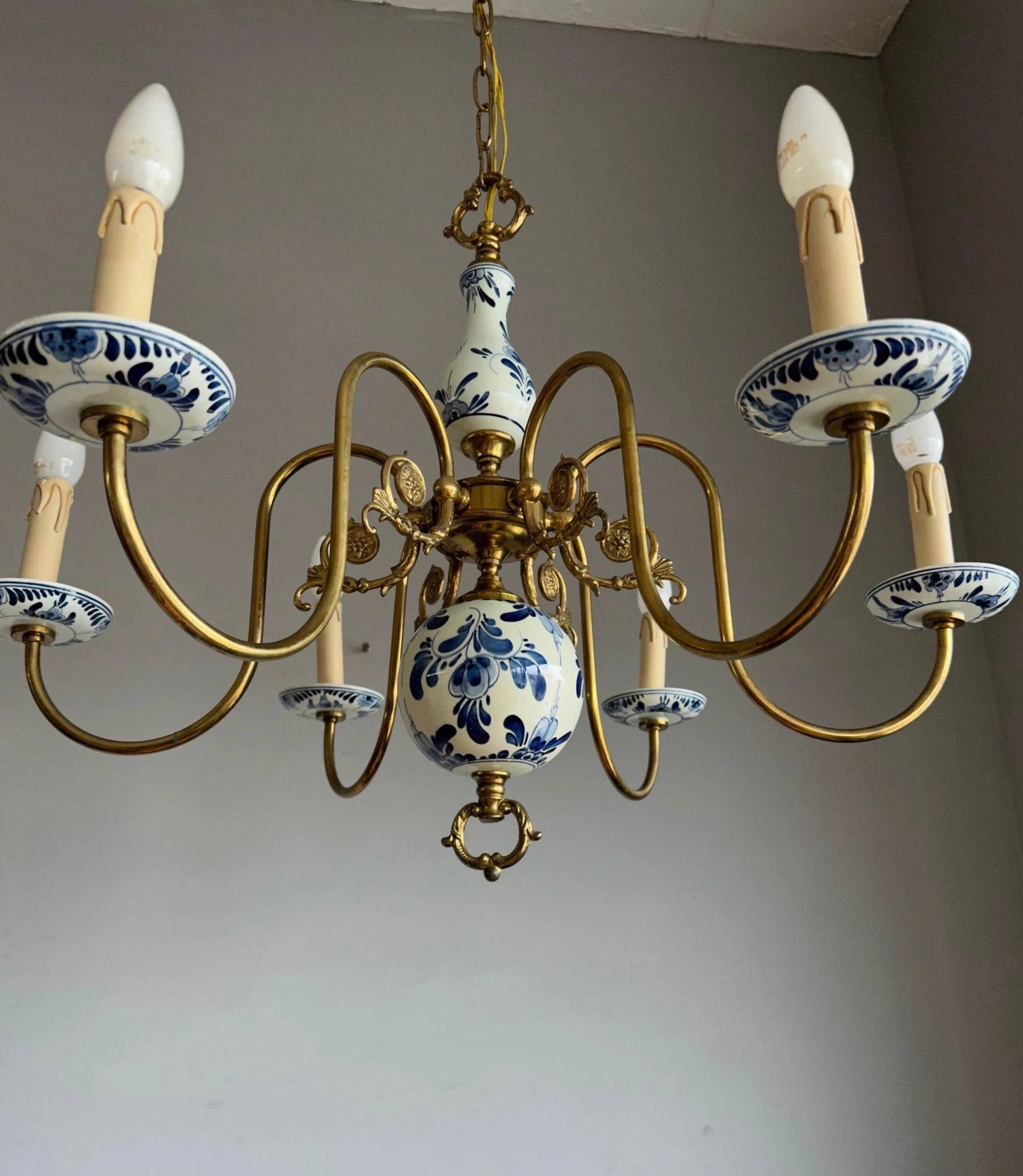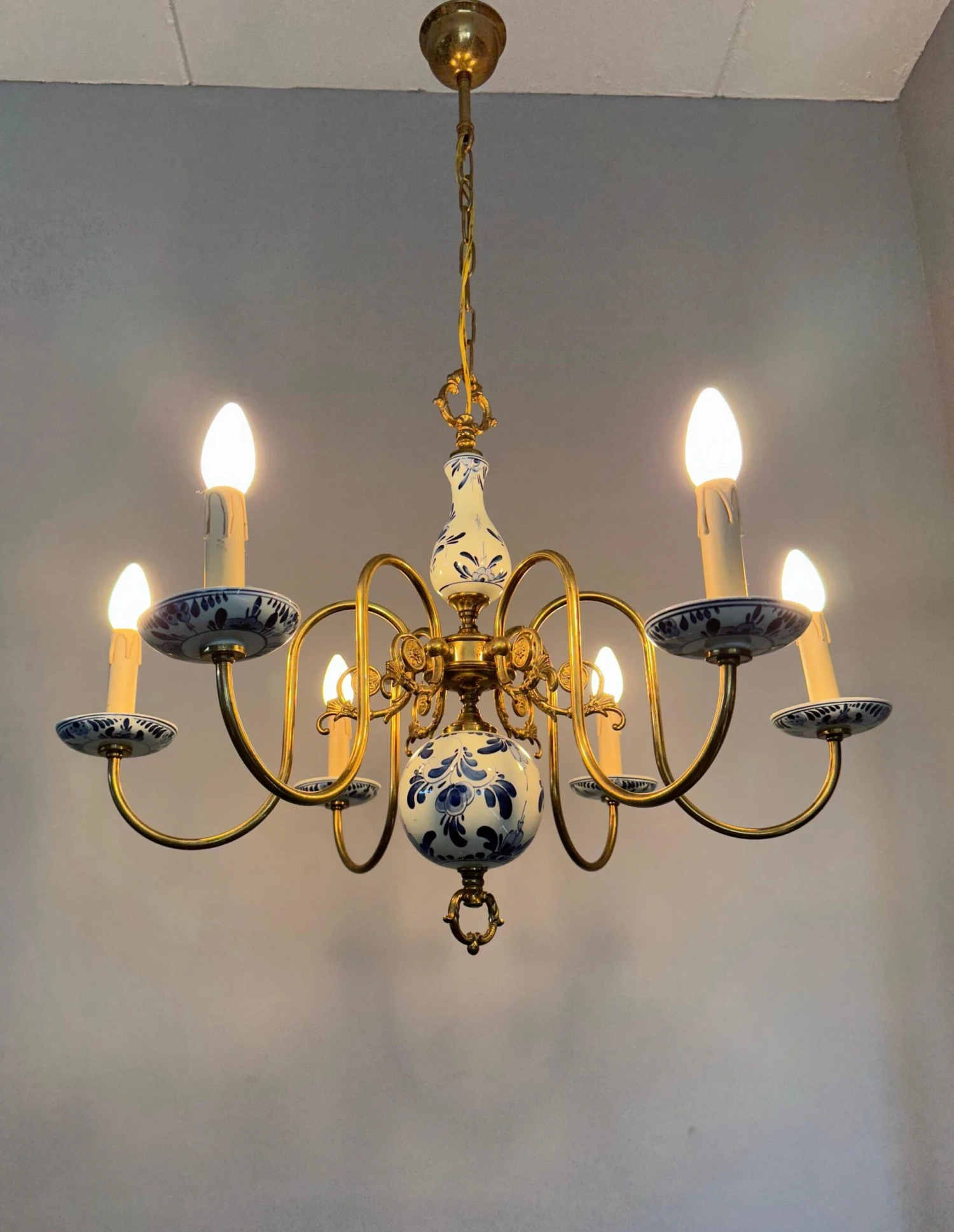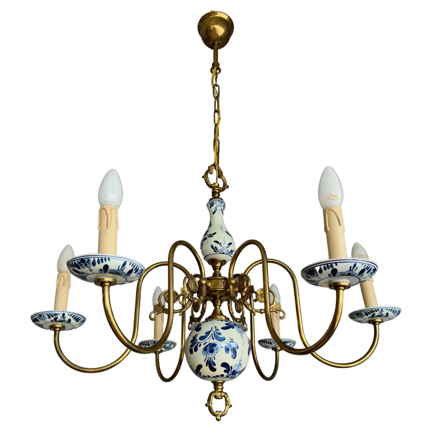 This decorative and top quality made pendant could be perfect for you. Both on and off this great workmanship fixture can create just the right atmosphere in your kitchen, dining or living room. However, it would also look the business in the middle of a large entrance. The shape, the details, the stunning materials and the very good condition make this a wonderful piece to come home to and it will light up both your days and evenings. The beautifully curved brass arms combined with the perfectly hand-painted delftware elements make this typical Dutch chandelier stand out from anything you ever saw. It is rewired for safe and immediate usage in the USA as well and if you like this pure, vintage and highly decorative light fixture as much as we do then you will love our price. Especially, when taking into account that perfect packing and worldwide delivery from our store to your door in just 4 to 6 days are complimentary.