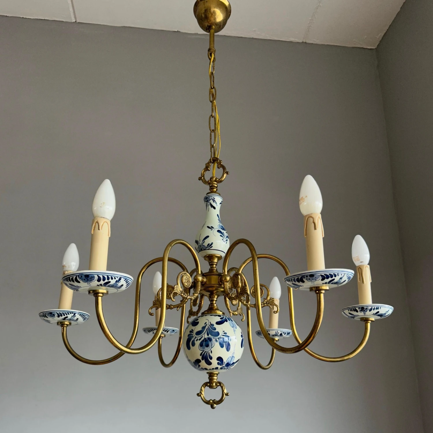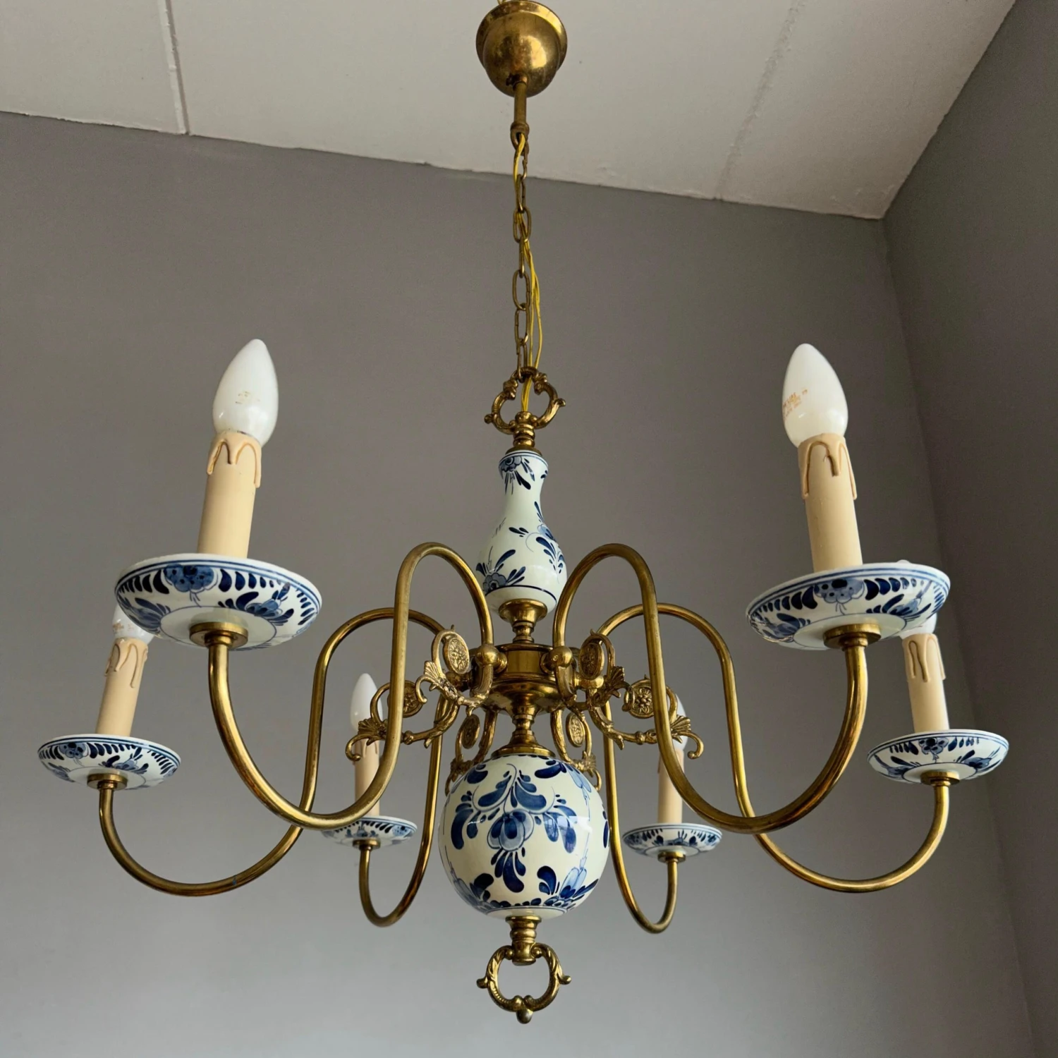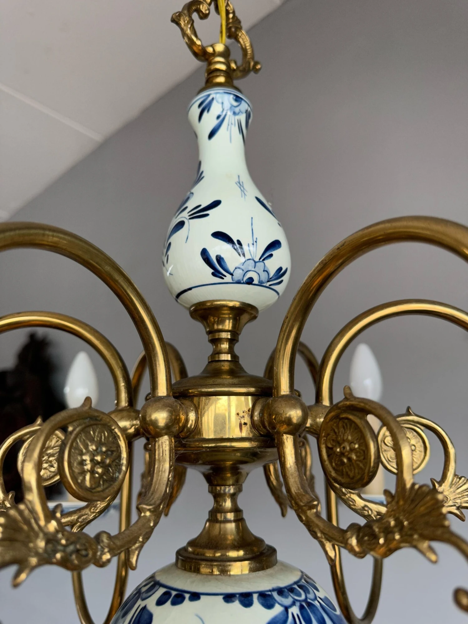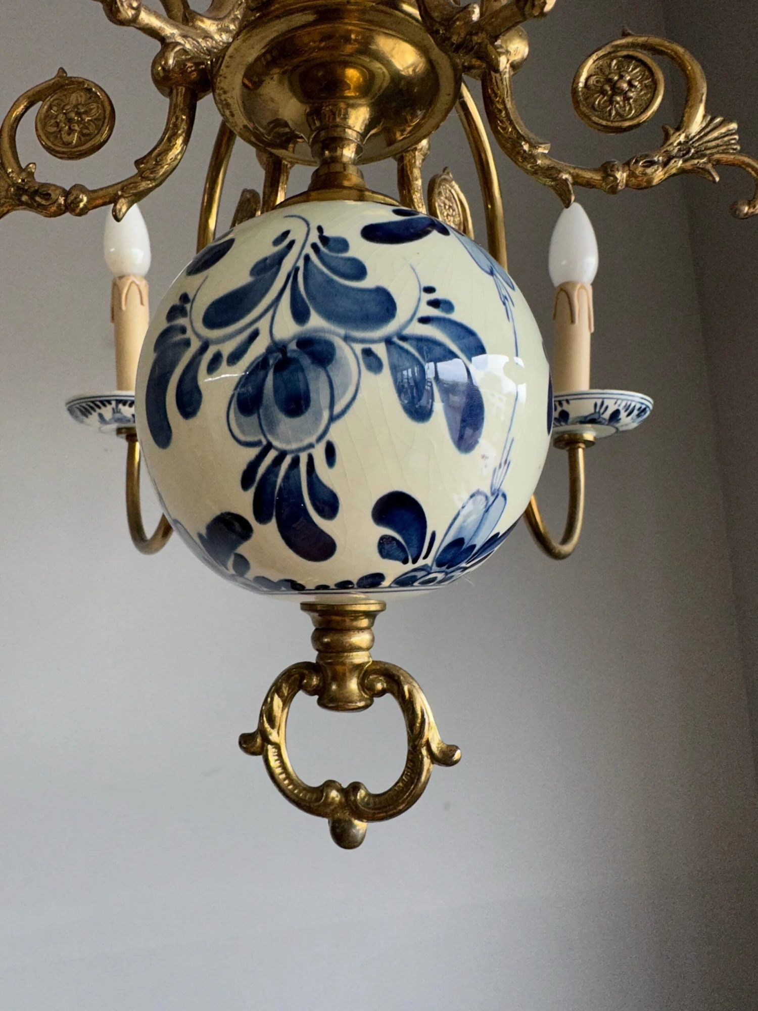 This decorative and top quality made pendant could be perfect for you. Both on and off this great workmanship fixture can create just the right atmosphere in your kitchen, dining or living room. However, it would also look the business in the middle of a large entrance. The shape, the details, the stunning materials and the very good condition make this a wonderful piece to come home to and it will light up both your days and evenings. The beautifully curved brass arms combined with the perfectly hand-painted delftware elements make this typical Dutch chandelier stand out from anything you ever saw. It is rewired for safe and immediate usage in the USA as well and if you like this pure, vintage and highly decorative light fixture as much as we do then you will love our price. Especially, when taking into account that perfect packing and worldwide delivery from our store to your door in just 4 to 6 days are complimentary.