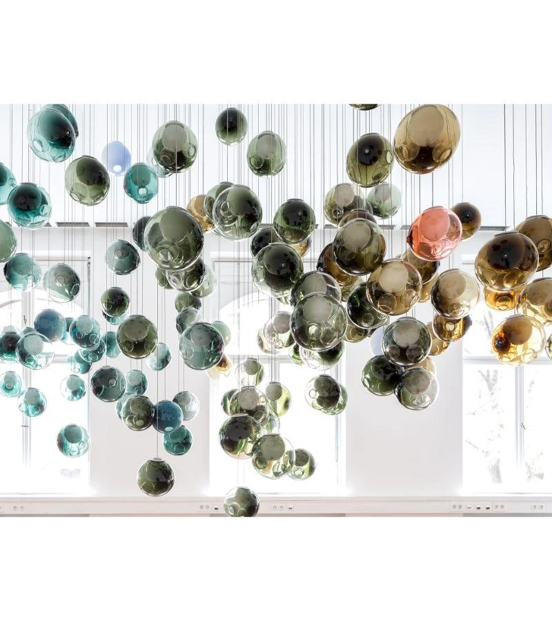 Individual 28 pendants result from a complex glass blowing technique whereby air pressure is intermittently introduced into and then removed from a glass matrix which is intermittently heated and then rapidly cooled. The result is a distorted spherical shape with a composed collection of imploded inner