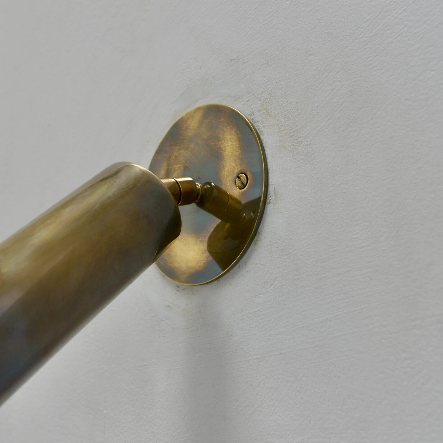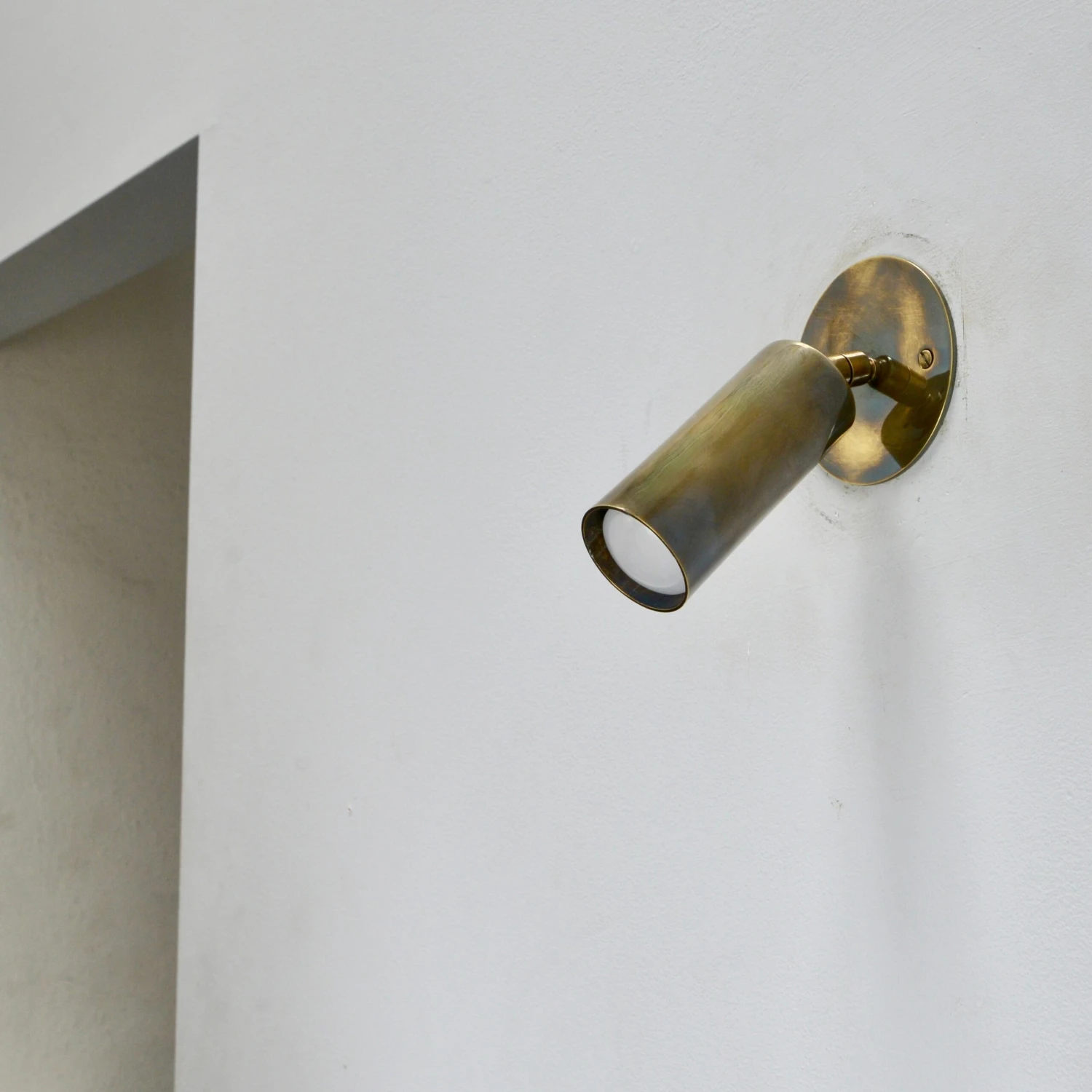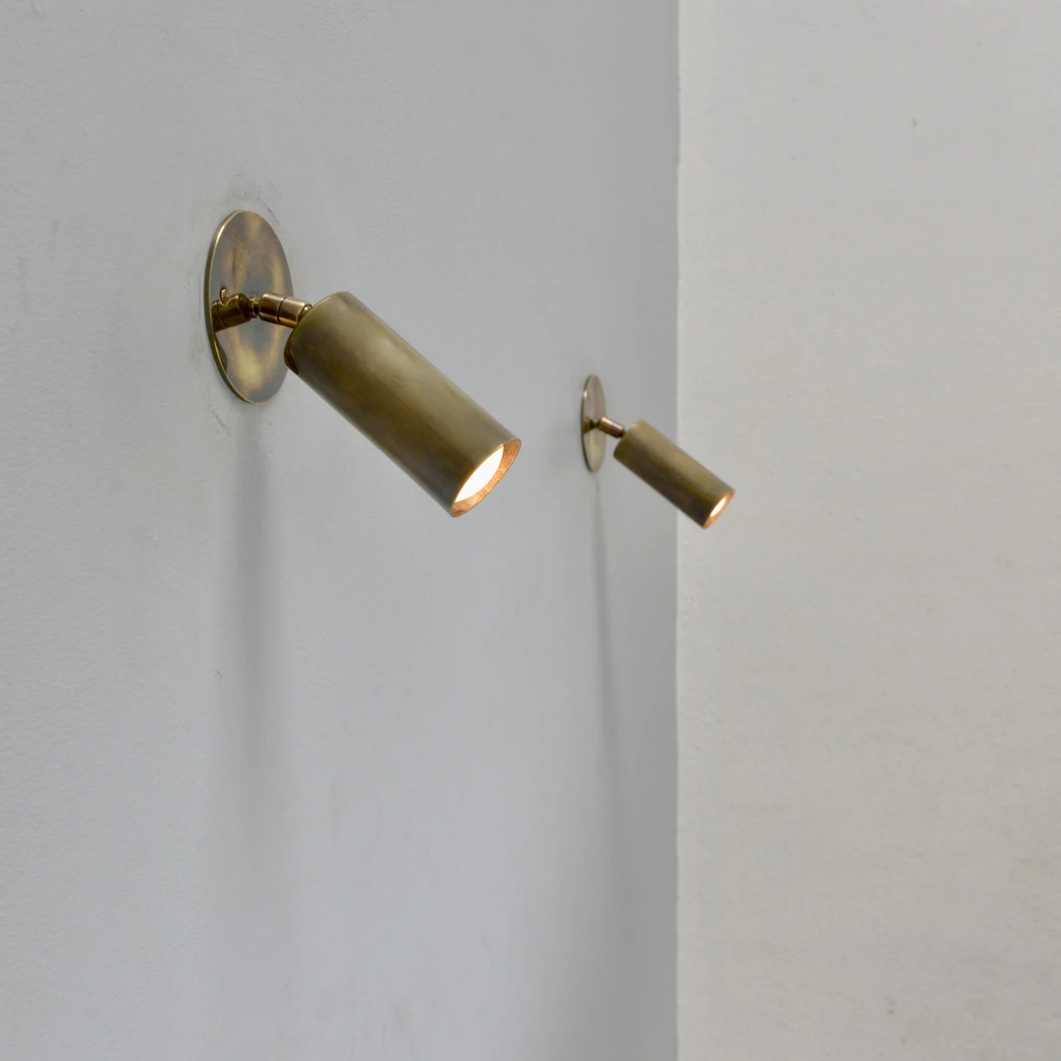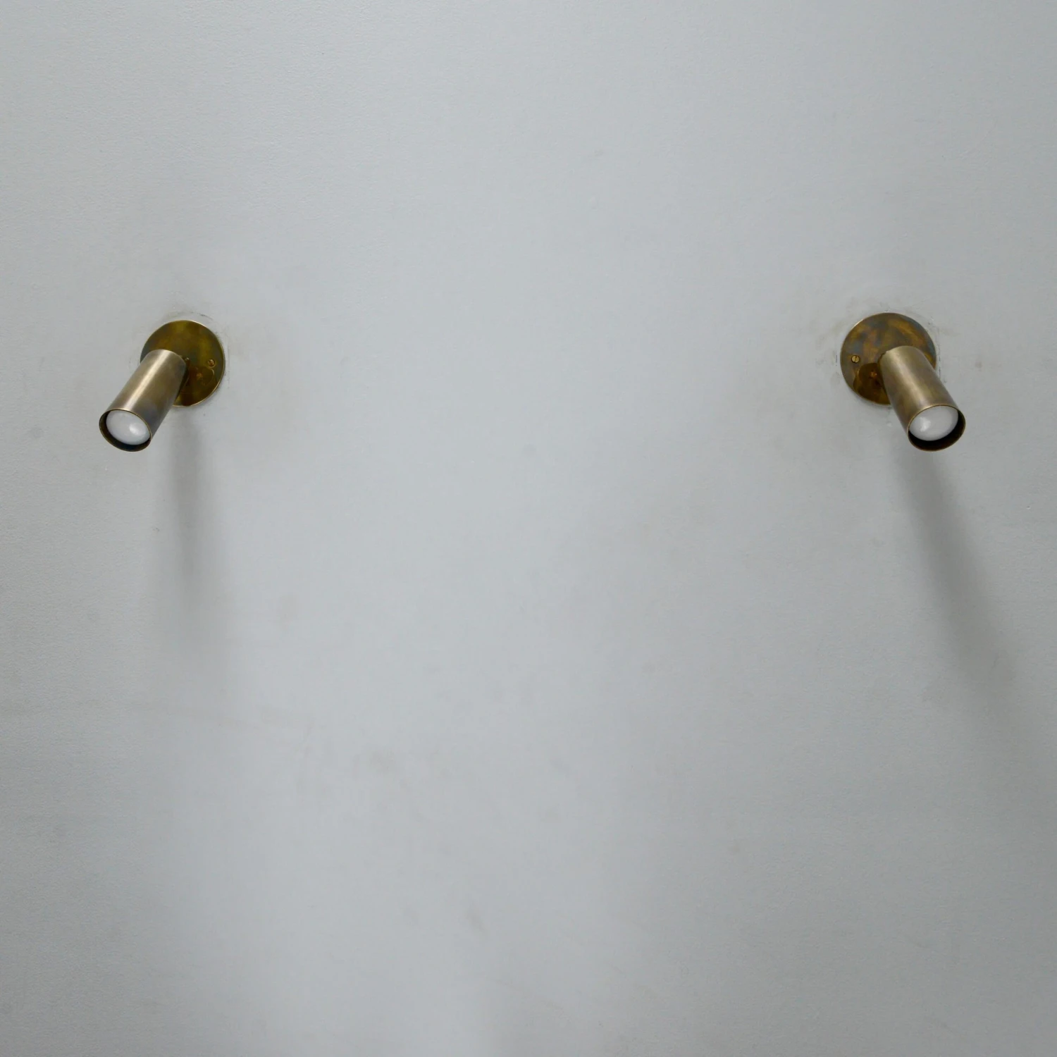 A pair of midcentury Italian mono spot sconces from the 1950s. These sconces have a lightly patinated brass finish. They are restored with 1 E26 medium based socket per sconce, for use in the USA. They can also be wired for use anywhere in the world. Lightbulbs included with order. Sold and priced in pairs. Measurements: