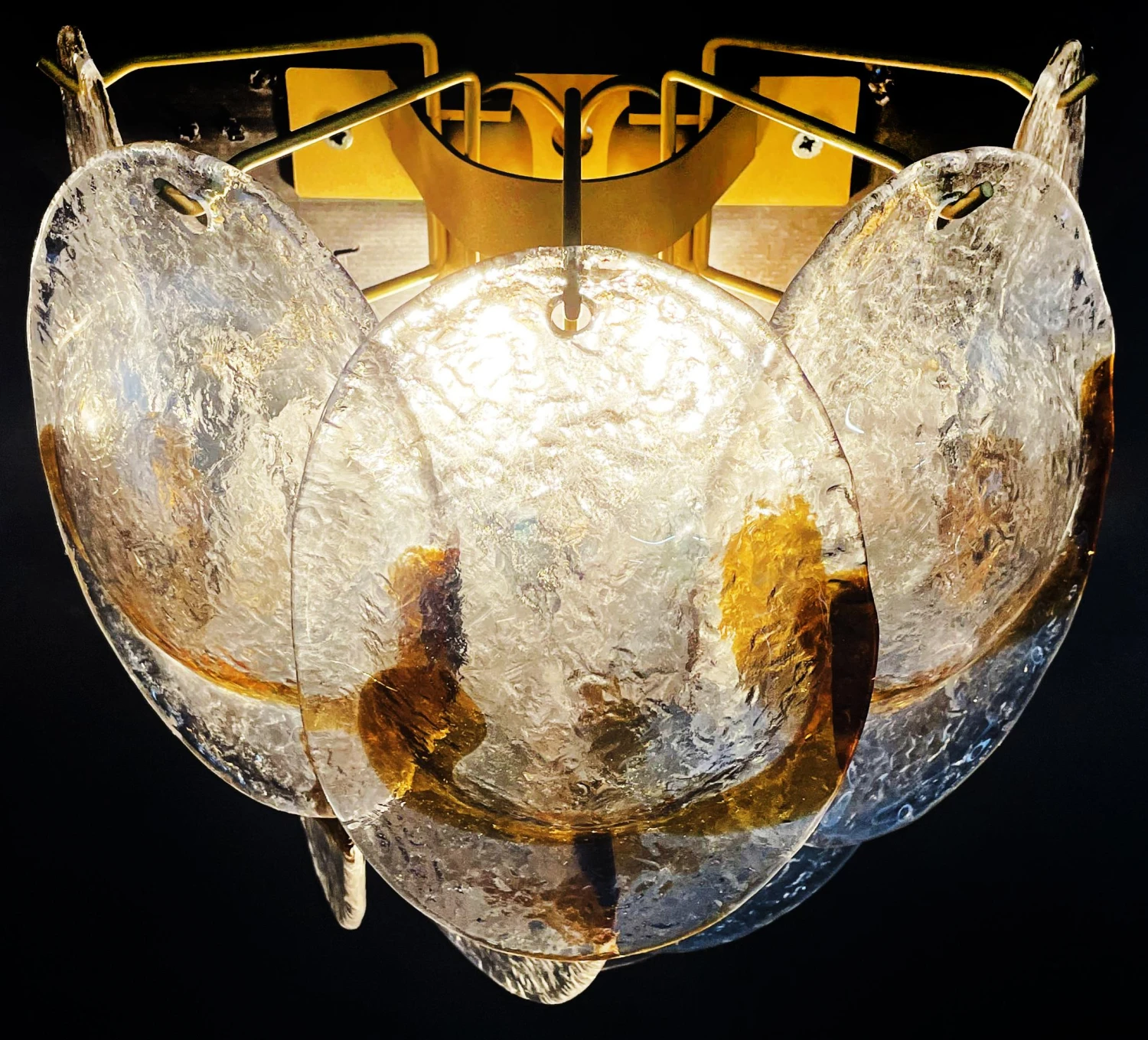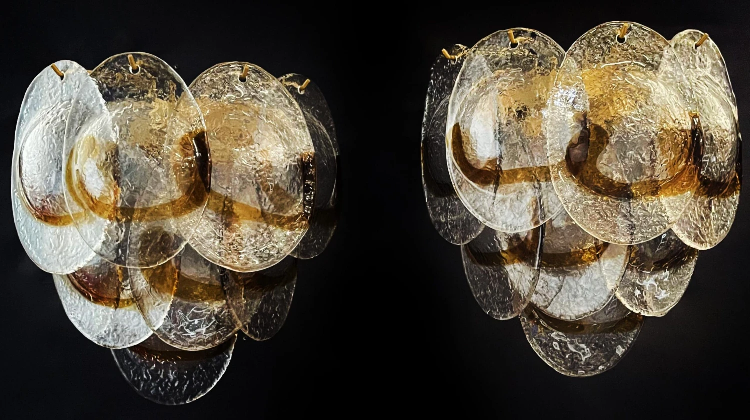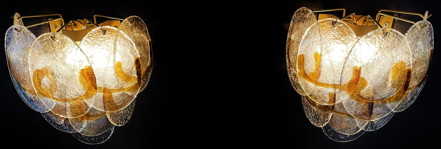Pair of Italian vintage Murano wall lights made by 10 glass leaves for each applique in golden painted metal frame. The originality of this item is given by the glass, wonderful works of art transparent and amber, called shells « conchiglie ». Murano blown glass in a traditional way.