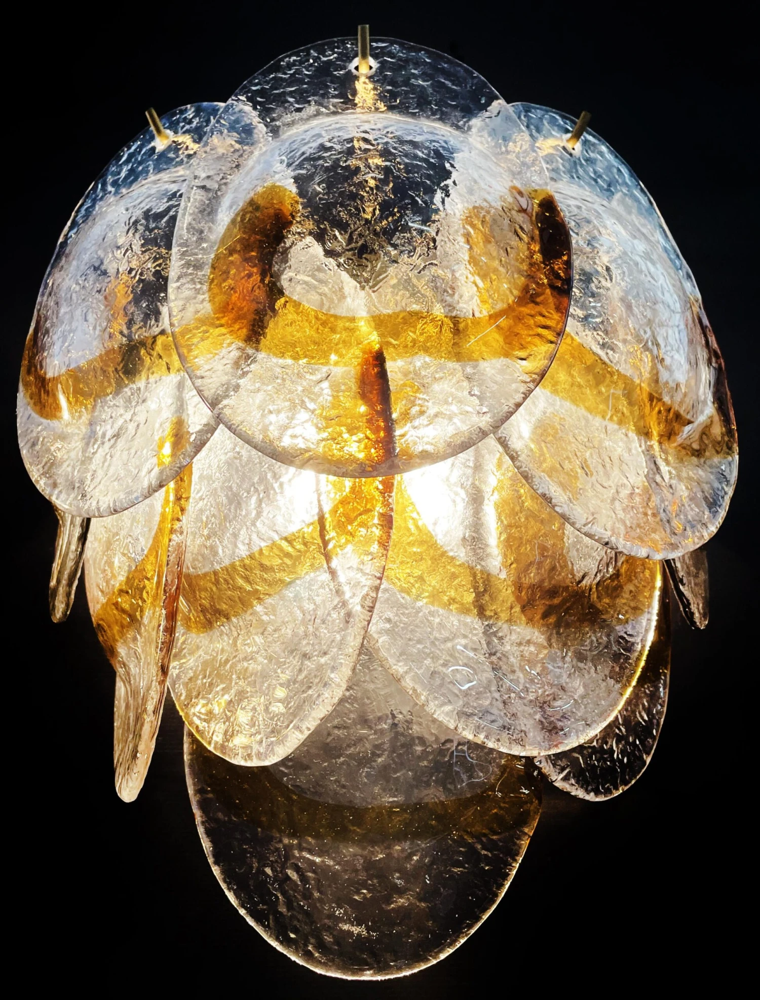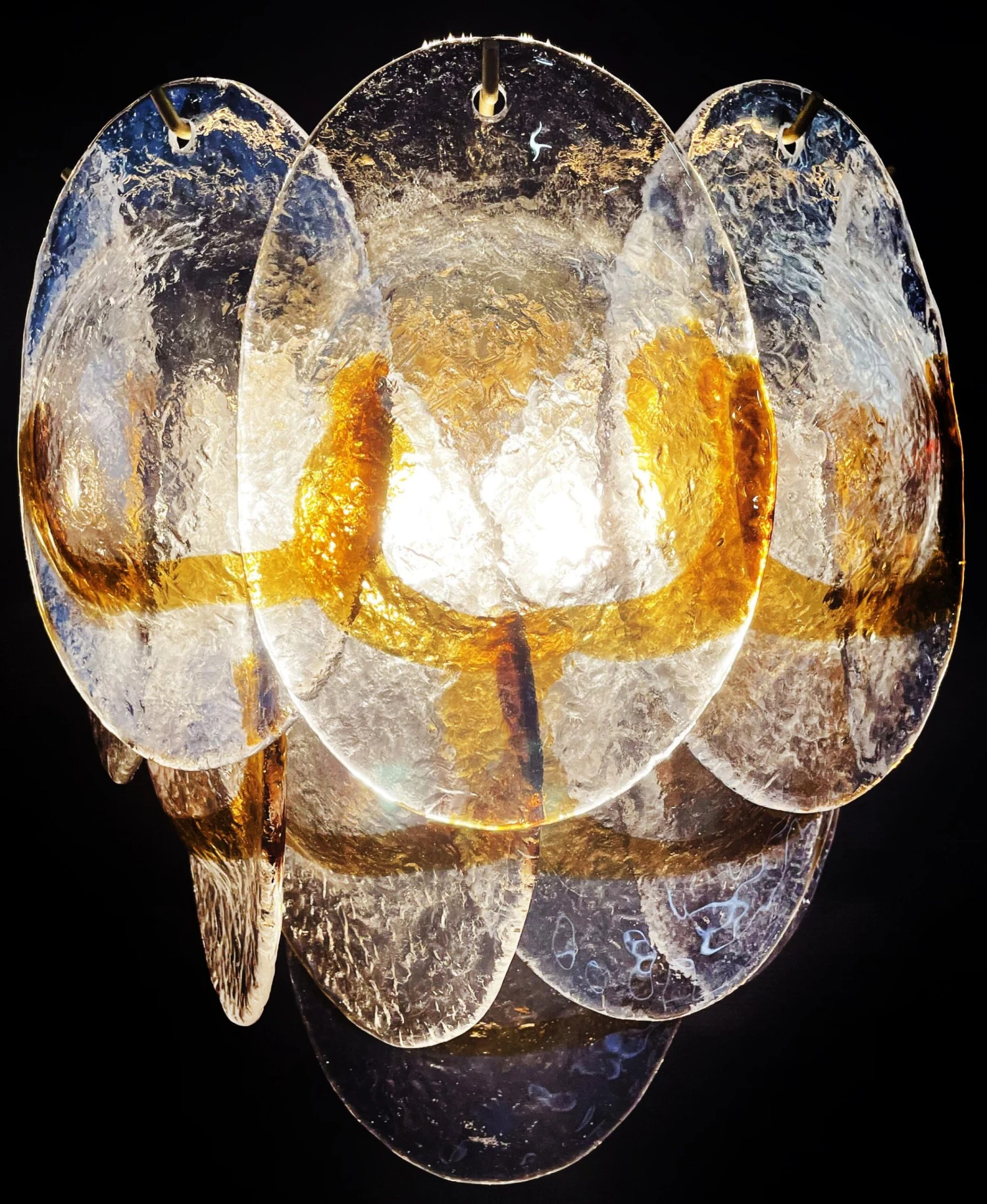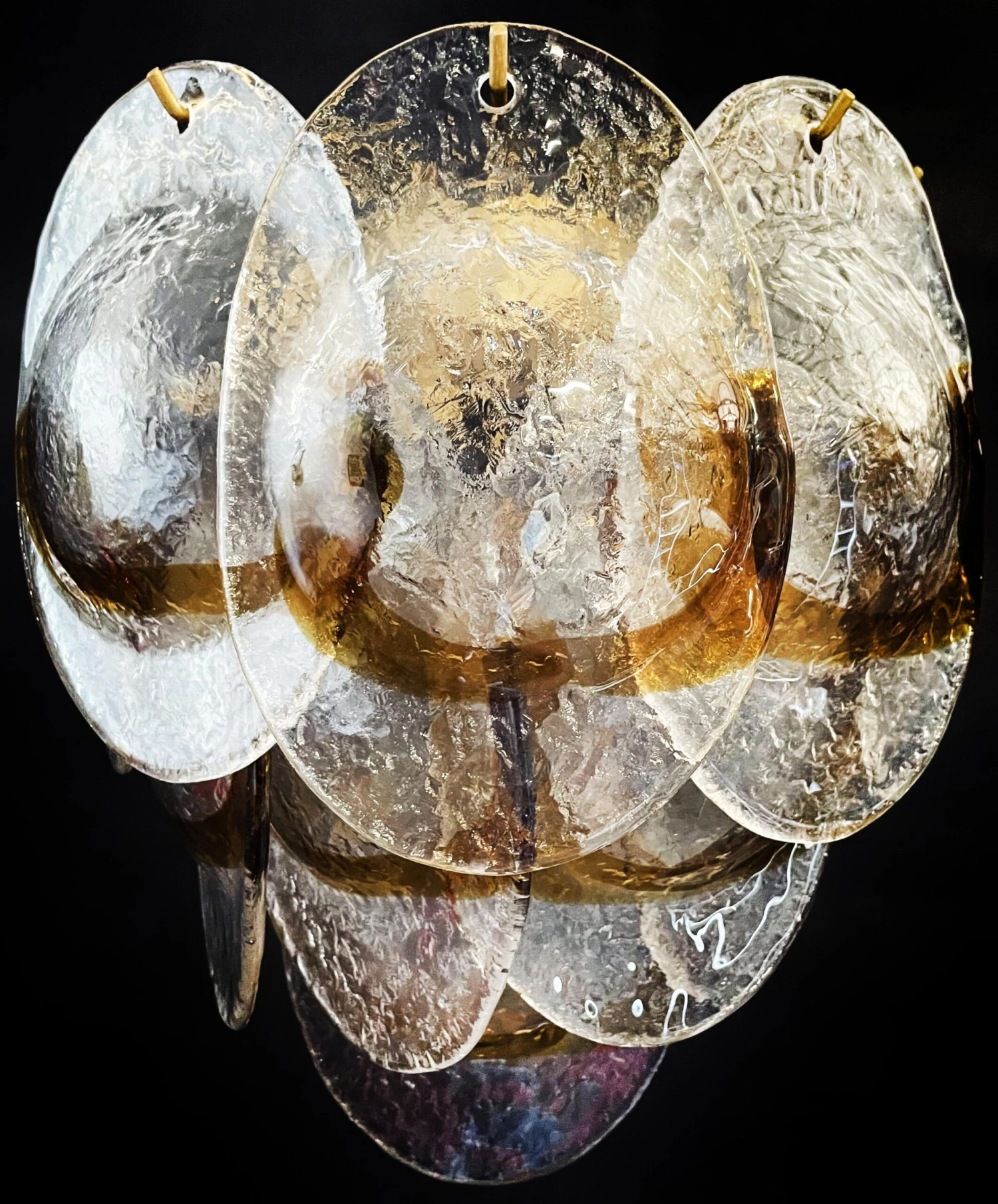Pair of Italian vintage Murano wall lights made by 10 glass leaves for each applique in golden painted metal frame. The originality of this item is given by the glass, wonderful works of art transparent and amber, called shells « conchiglie ». Murano blown glass in a traditional way.