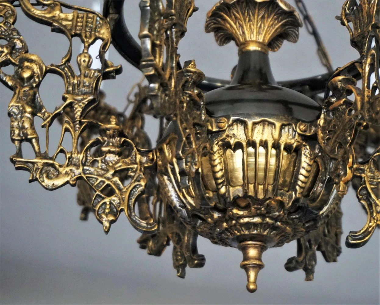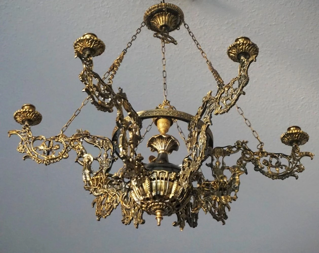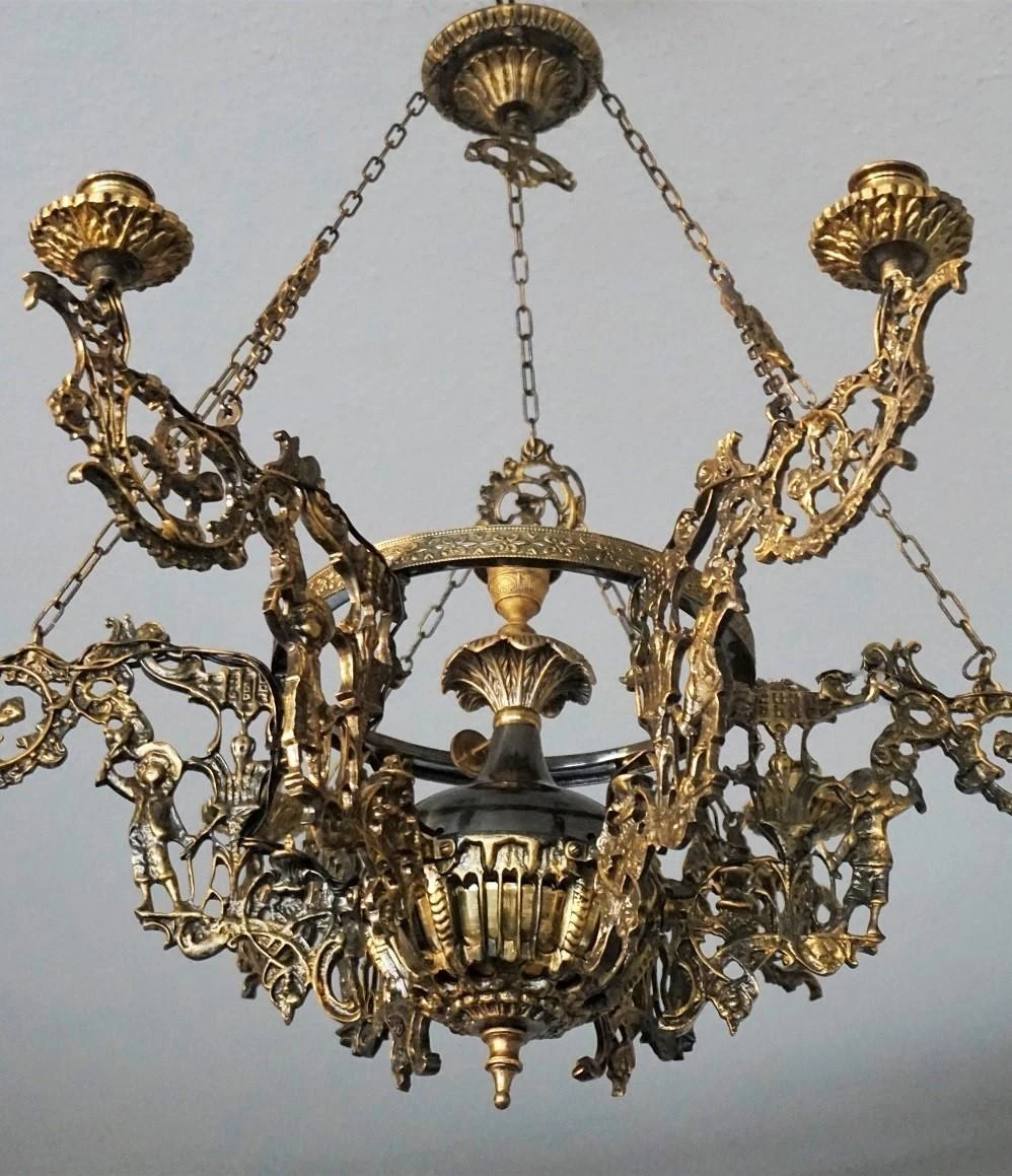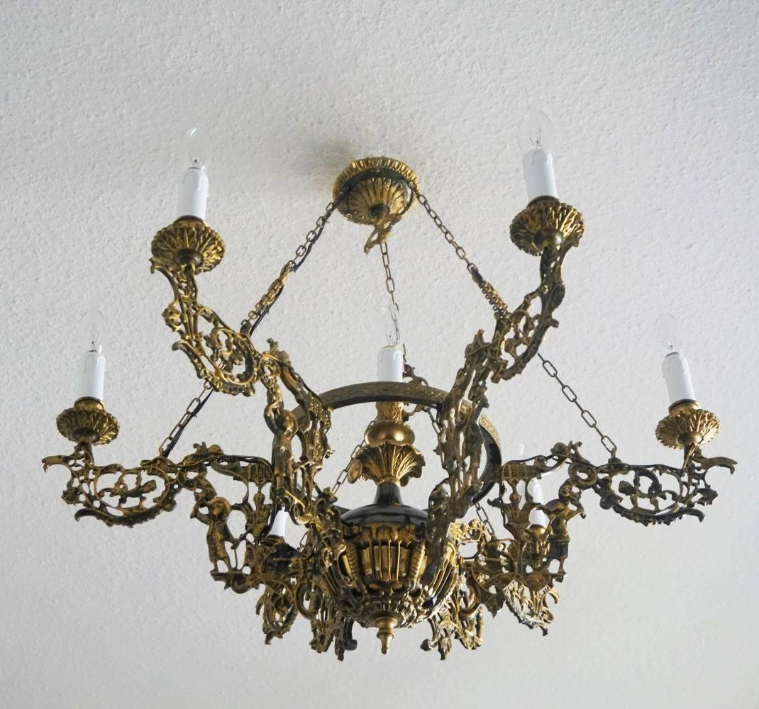 Large Art Nouveau solid patinated bronze and parcel brass six-arm candle chandelier, richly ornate with six lateral candle holders and one in the center, France, 1920-1929.