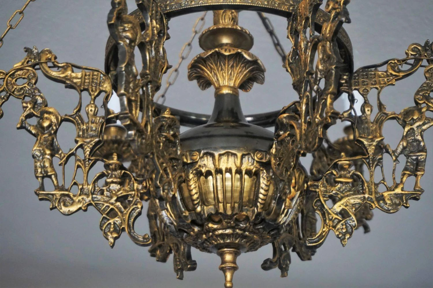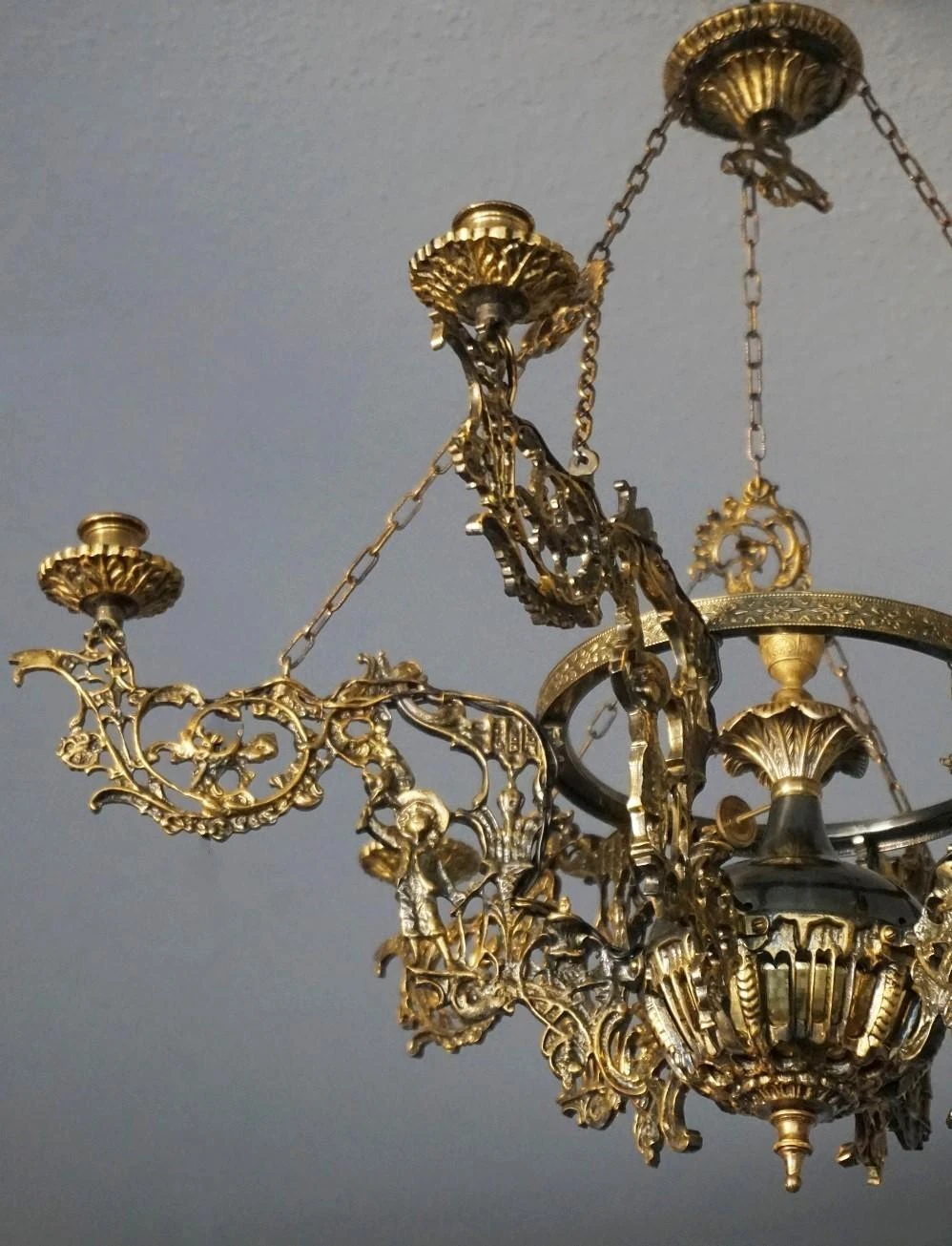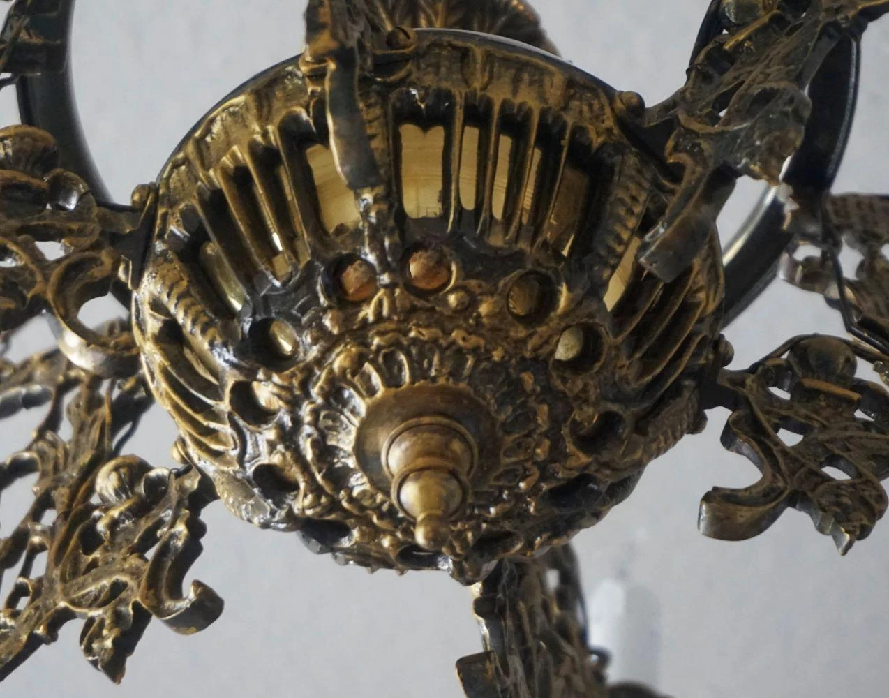 Large Art Nouveau solid patinated bronze and parcel brass six-arm candle chandelier, richly ornate with six lateral candle holders and one in the center, France, 1920-1929.