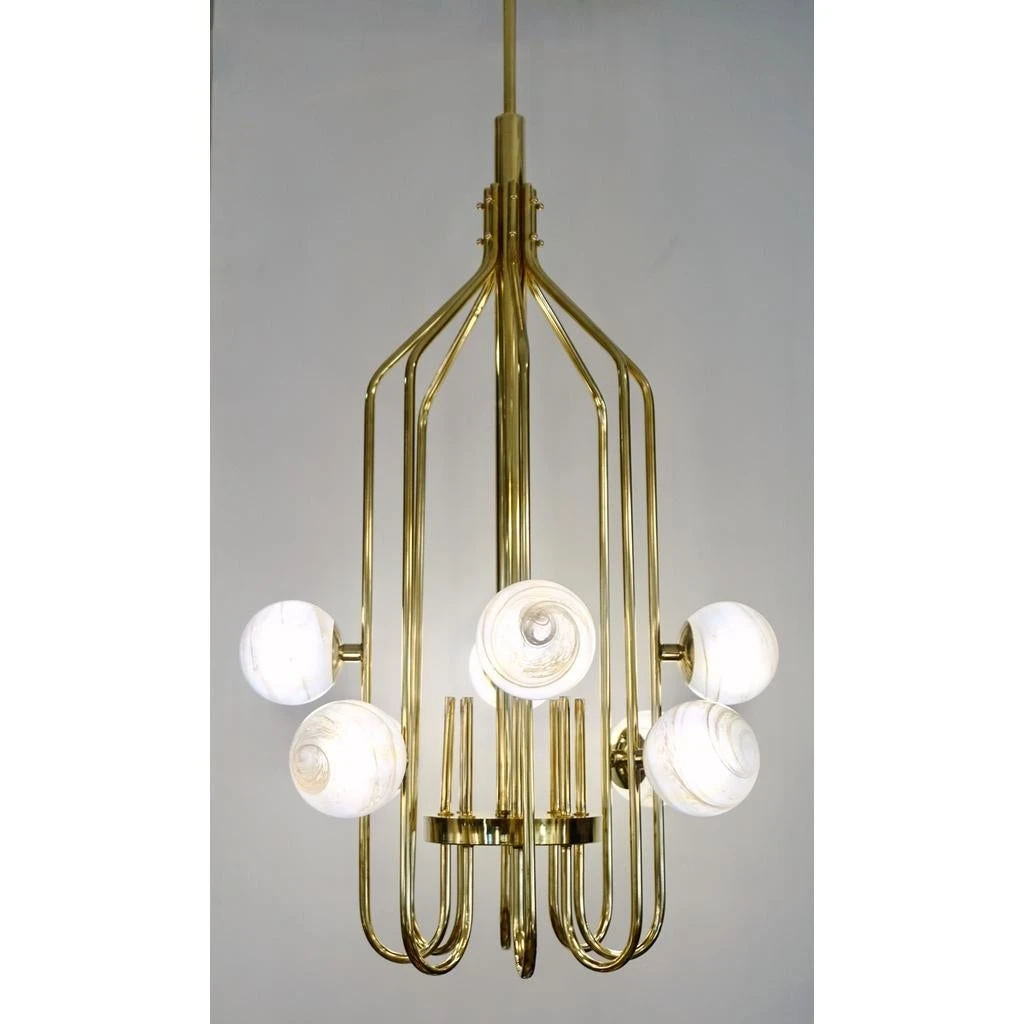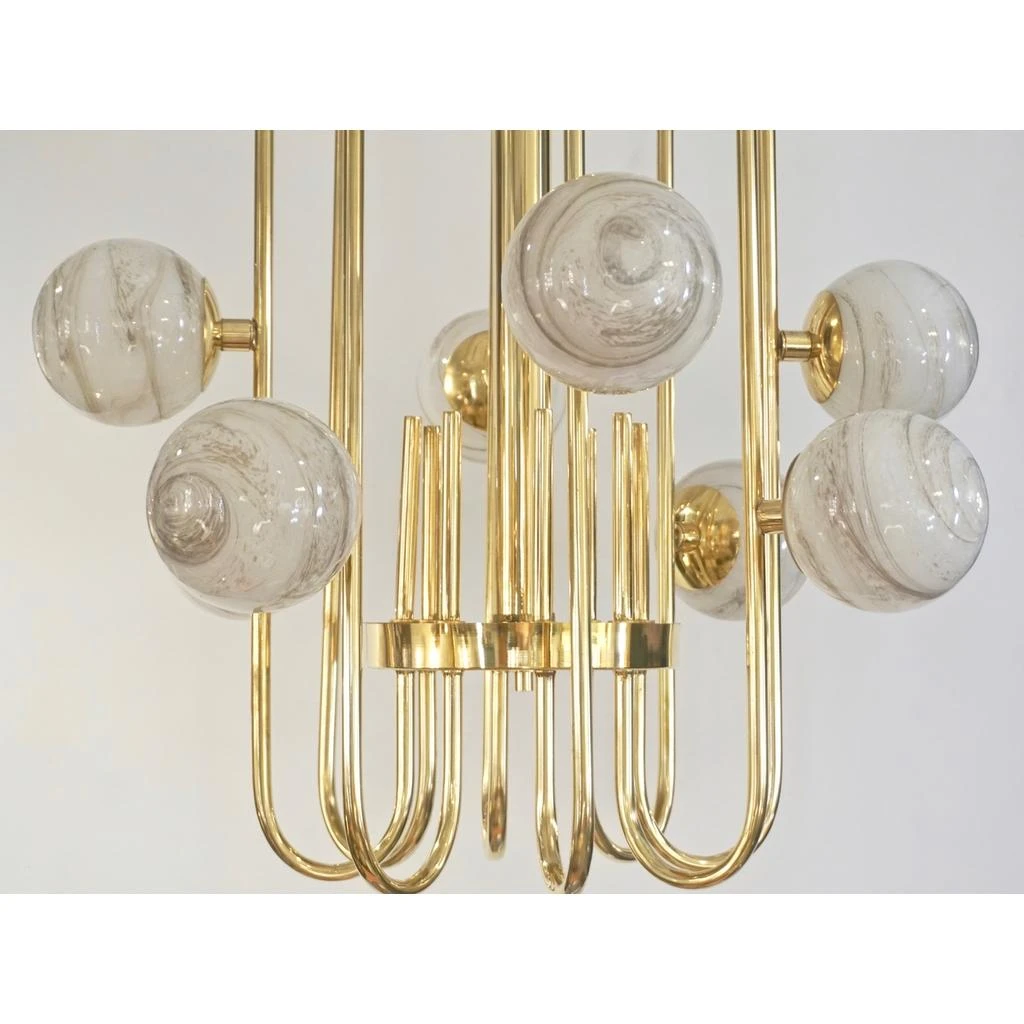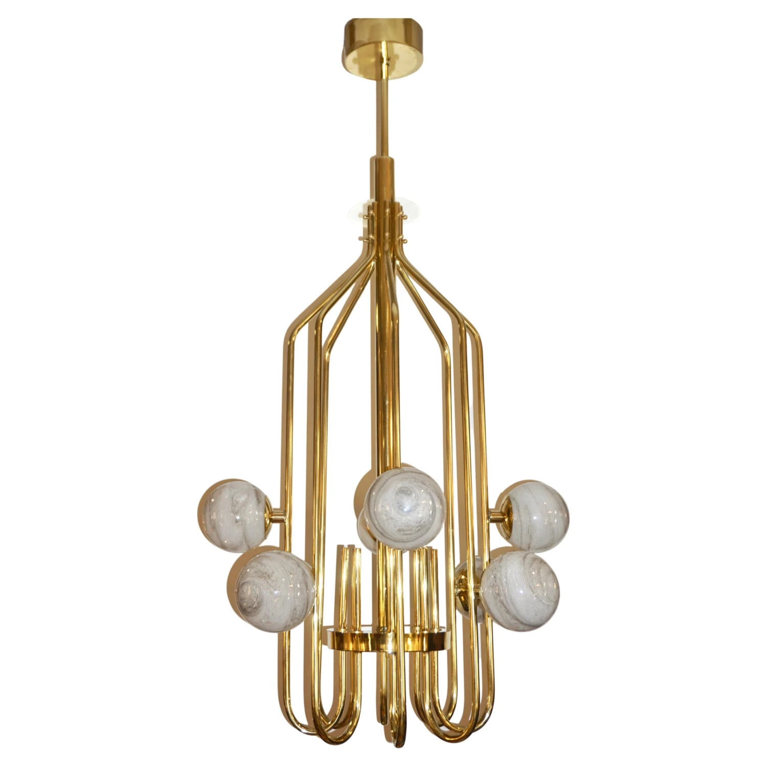 A contemporary innovative custom modern chandelier, entirely handcrafted in Italy. The handmade geometric cylinder brass structure, resembling a sleek birdcage, has a very organic curvilinear shape decorated with 8 round globes in an innovative Murano glass to resemble alabaster, with the benefit to be lighter and to remain over time of the same variegated translucent ivory white color. On display at our NYDC Showroom.