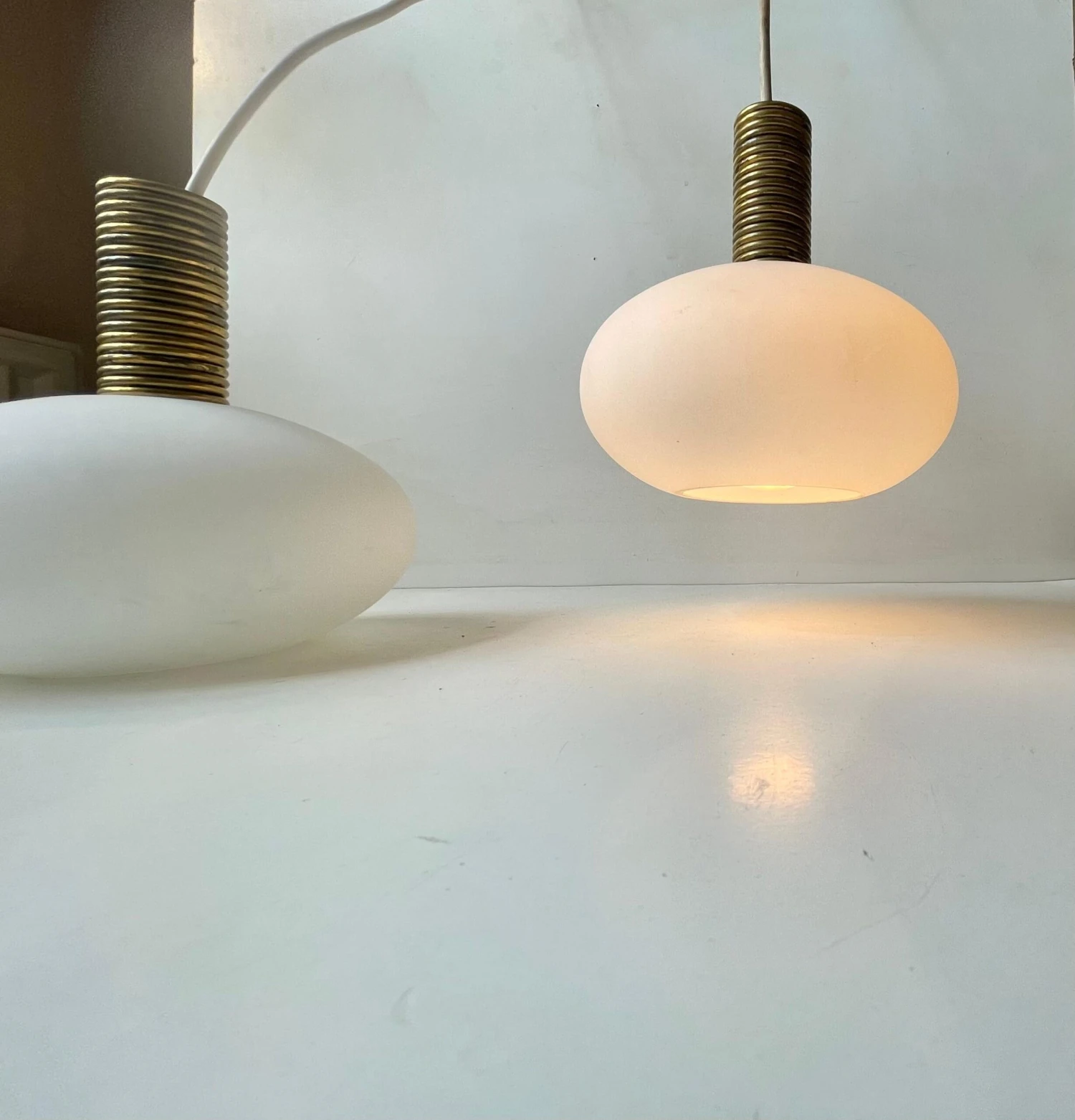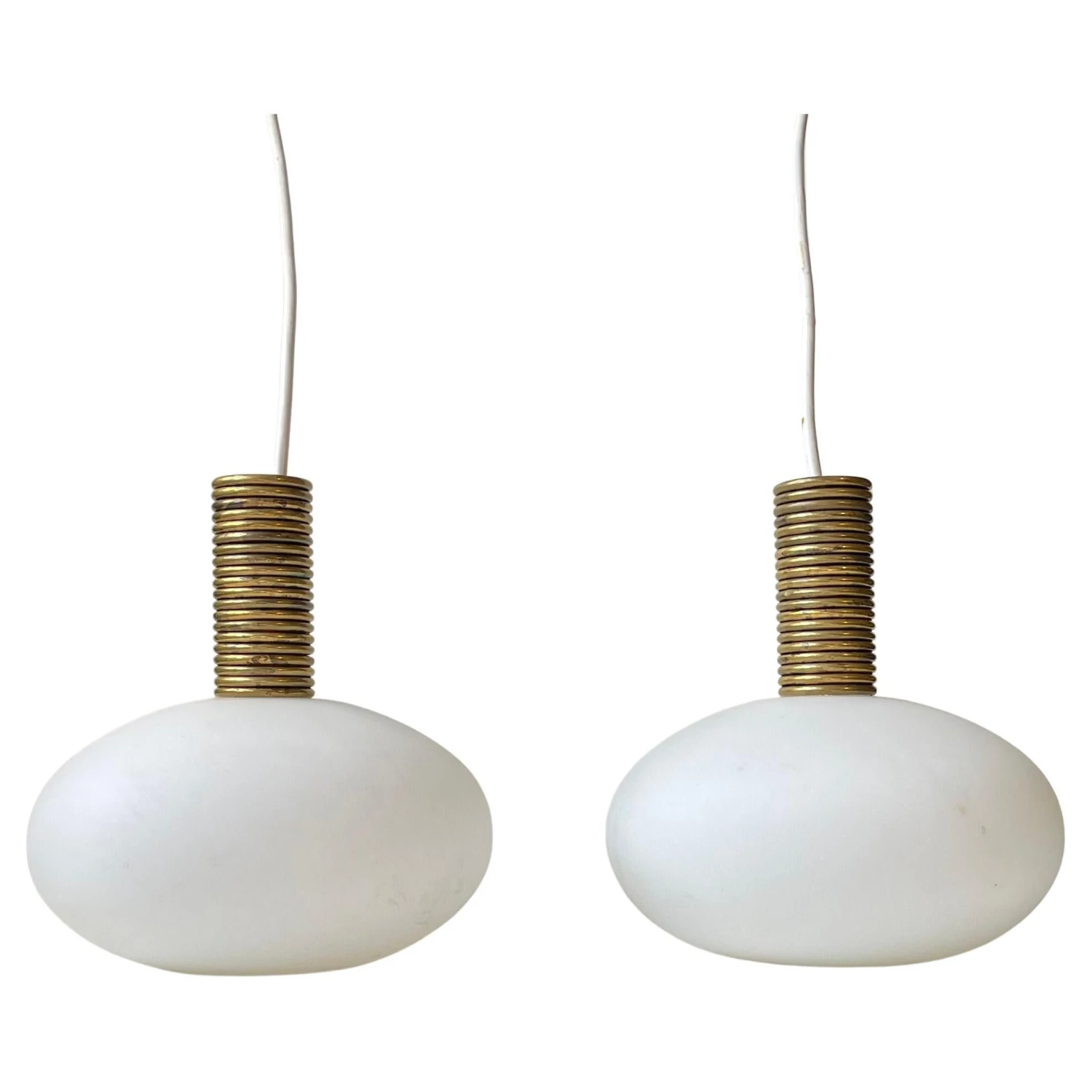 - Condition:Rewired: 3 meters of new white cord has been installed in each of them. Wellkept, clean and intact conditions. Patination present to the brass tops – consistent with age.