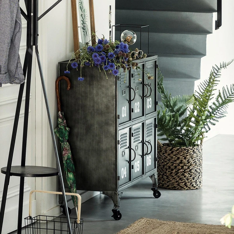 Meuble Sevin de marque Atmosphera. La tendance est aux meubles en métal qui décorent tout en offrant des espaces de rangement. Assorti au meuble 4 portes Sevin. Meuble sur roulettes, type casier, 6 portes numérotées. A monter soi-même.