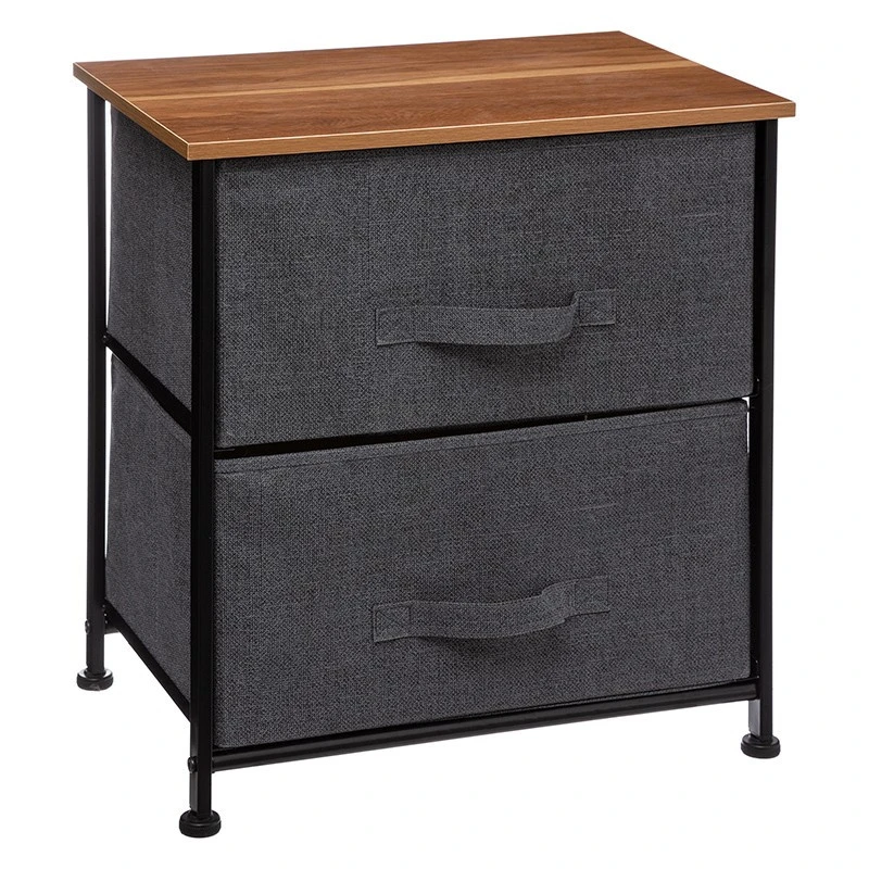 Chevet à 2 tiroirs en tissu gris foncé, plateau en fibres de bois et structure en métal noir.