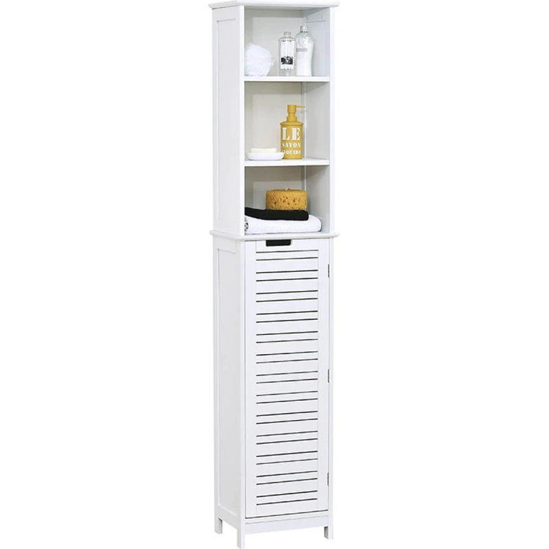 Cette colonne salle de bain blanche à la fois pratique et aux derniÚres tendances apportera des espaces de rangement supplémentaires dans votre salle de bain. 1 porte avec 2 étagÚres intérieures. 3 niches. Découpe-poignées trÚs design. En panneaux épais de fibres de bois (MDF), 15 mm.