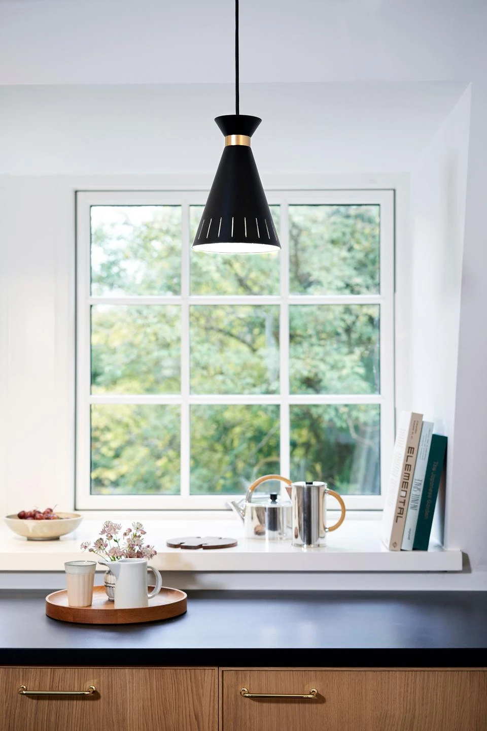 A classic pendant with charm, finesse and an elegant, solid brass ring, designed in the 1950s by the internationally renowned lighting designer, Svend Aage Holm-Sørensen. The rigorous expression means that the Cone pendant can hang beautifully alone or as part of a group, above the dining table or kitchen worktop, or in a dark corner of the living room. In addition to direct lighting, Cone’s iconic light grooves along the edge of the metal shade provide an indirect graphic lighting effect, which lends character to the design.