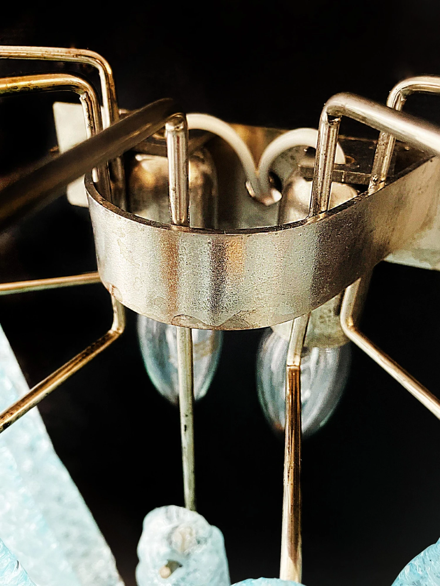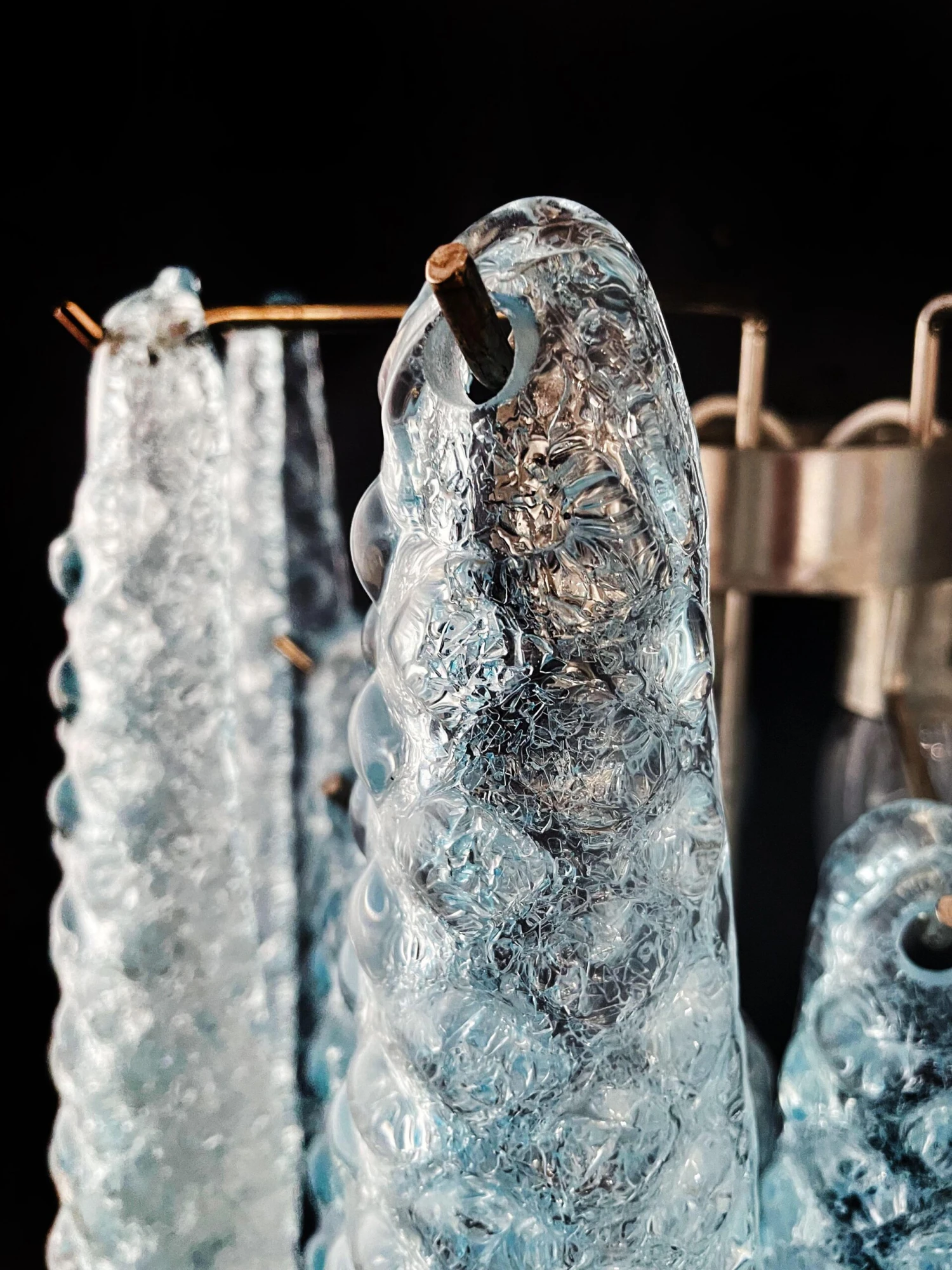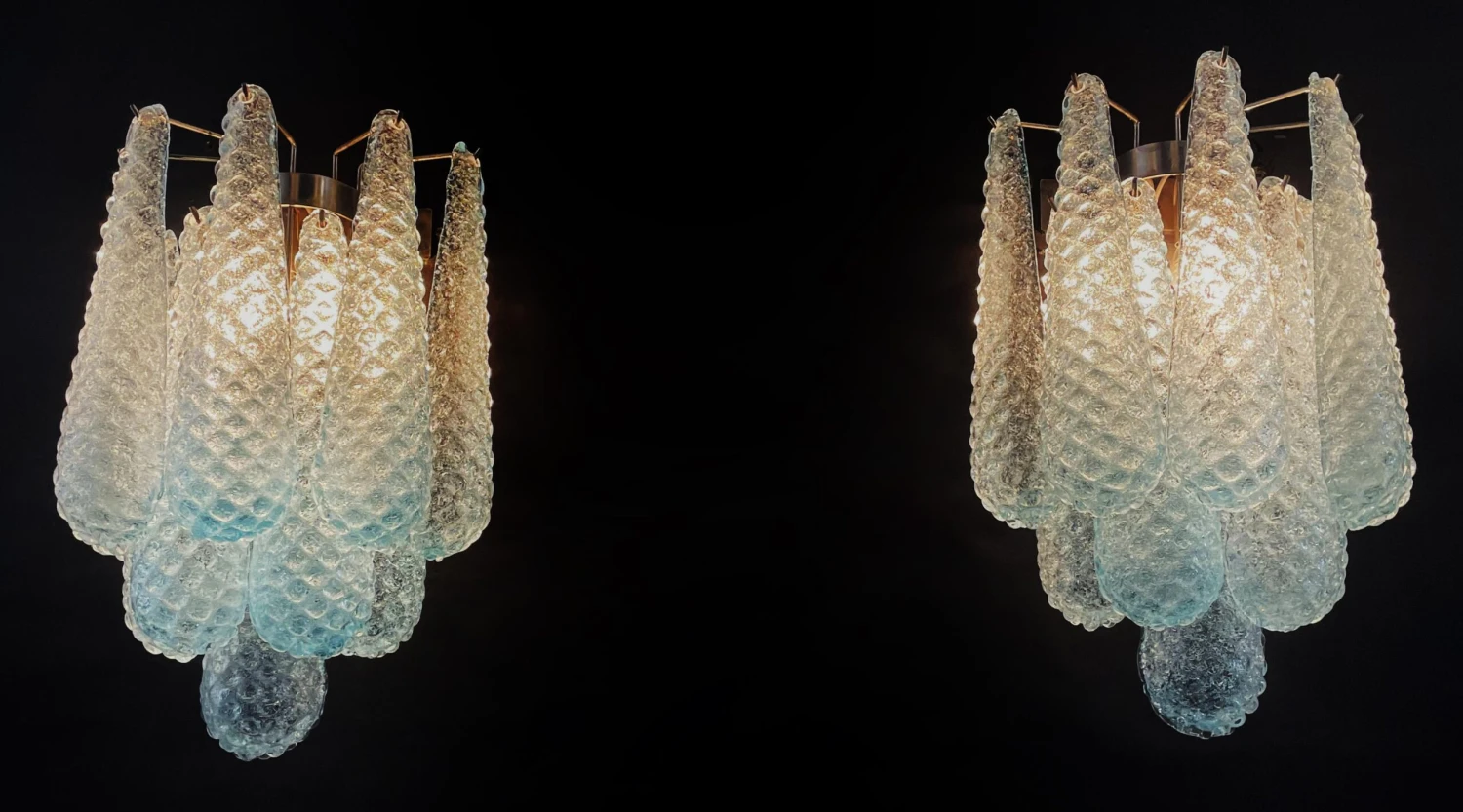 Fantastic pair of vintage Murano wall sconce made by 10 blue glass petals (transparent crystal, smooth outside, with crystal powder and then rough inside) in a chrome frame.