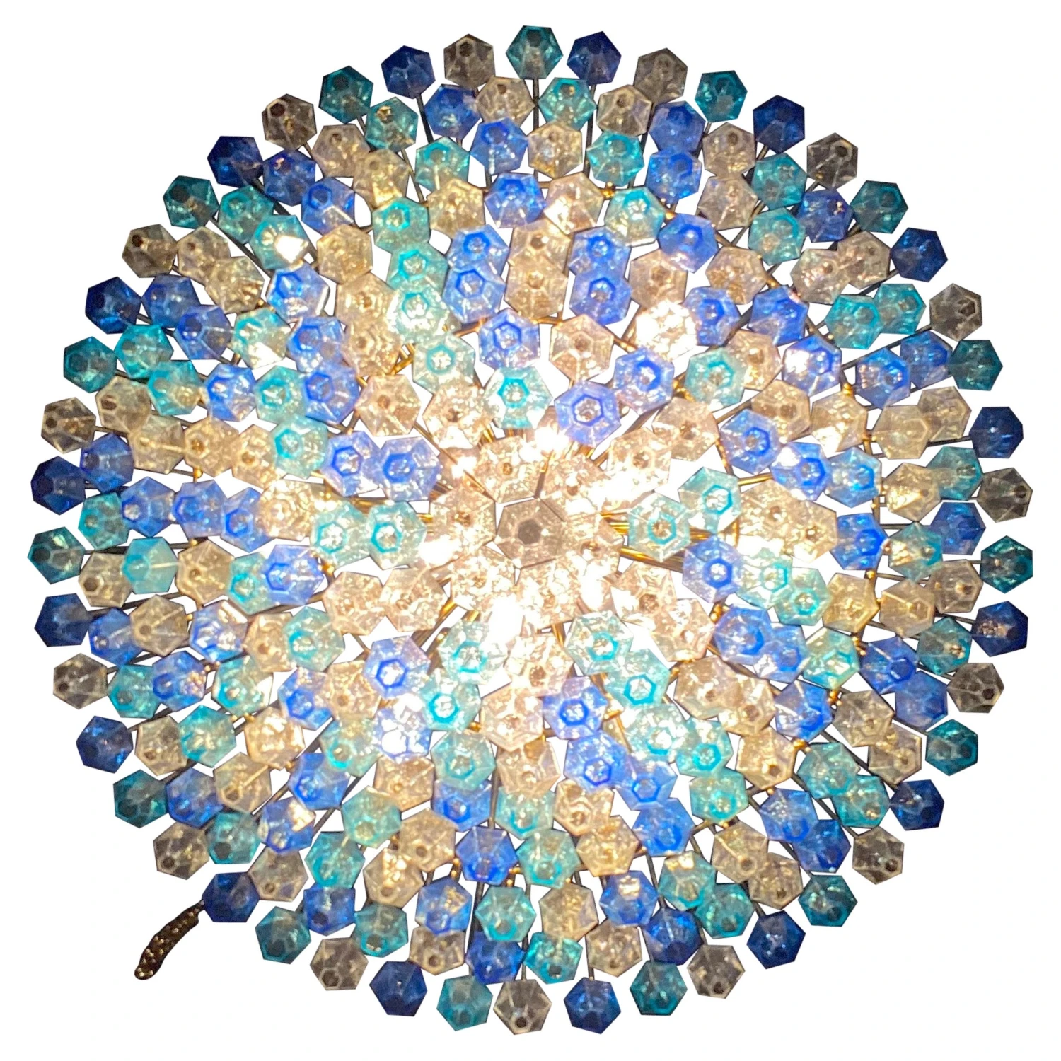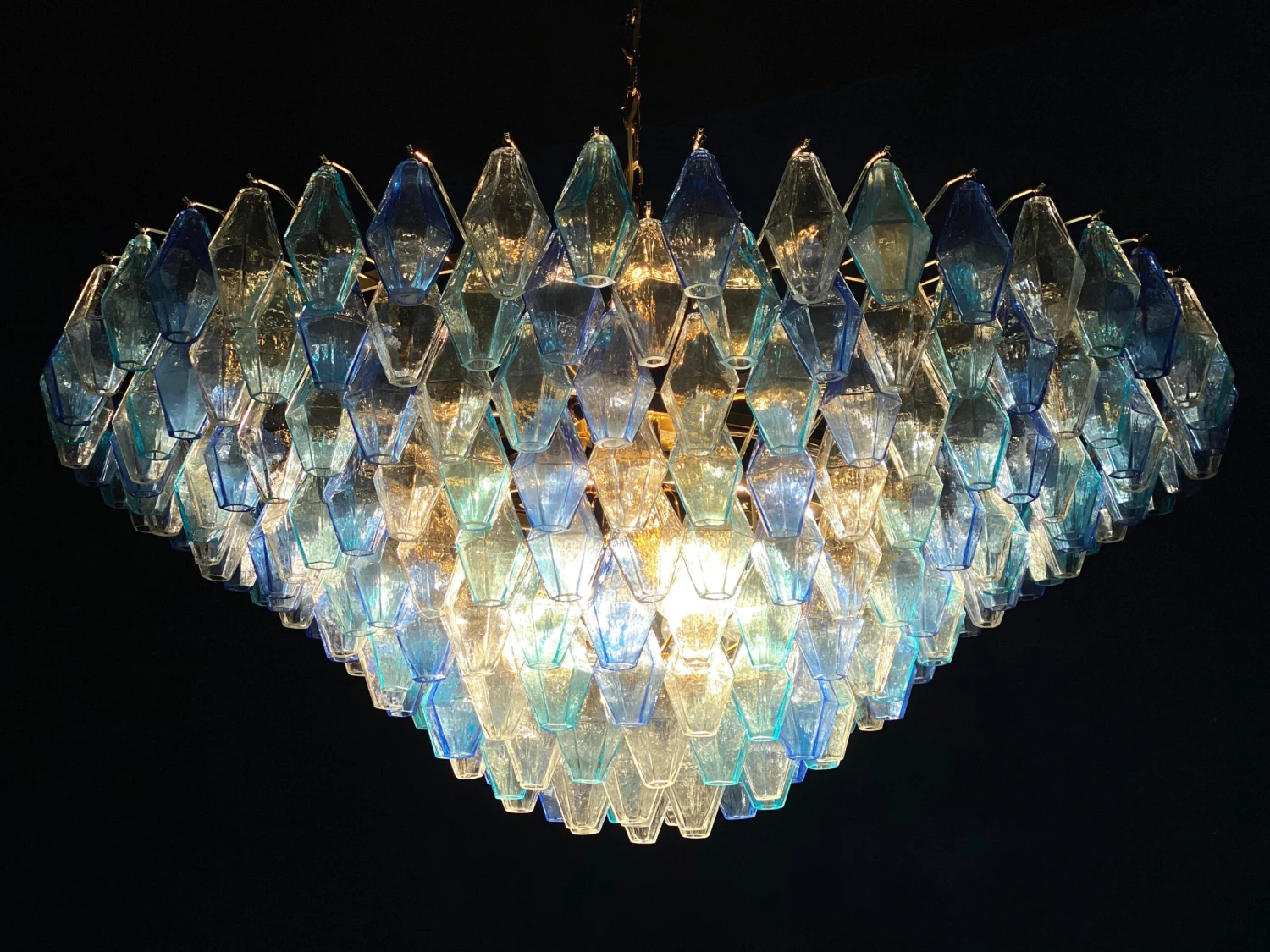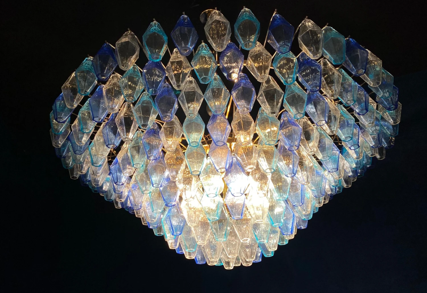 This huge striking chandelier consists of 253 hand blown Ice, heavenly and blue colored « Poliedri » made of Murano glass.