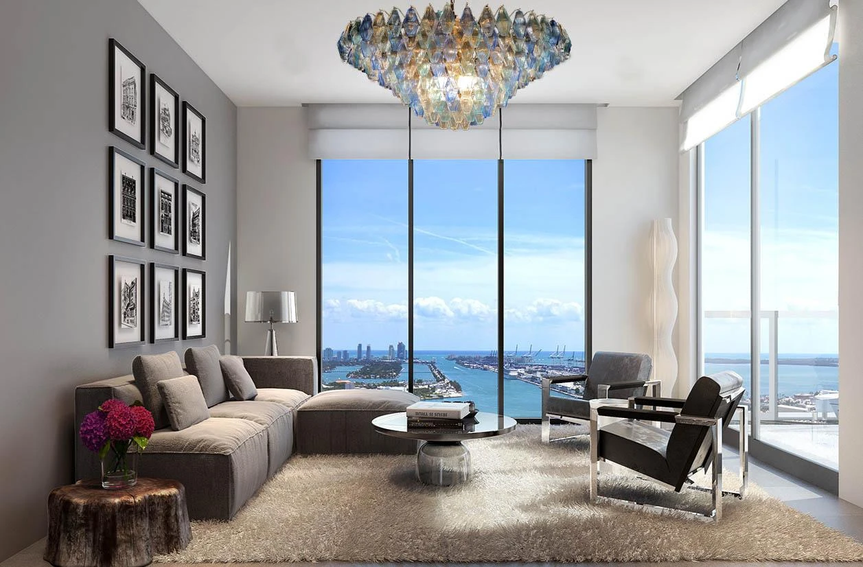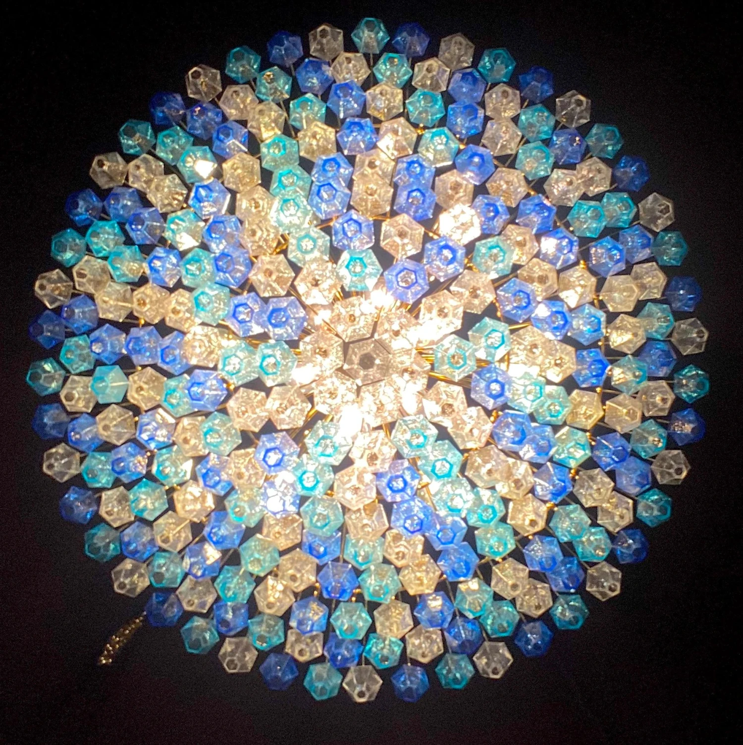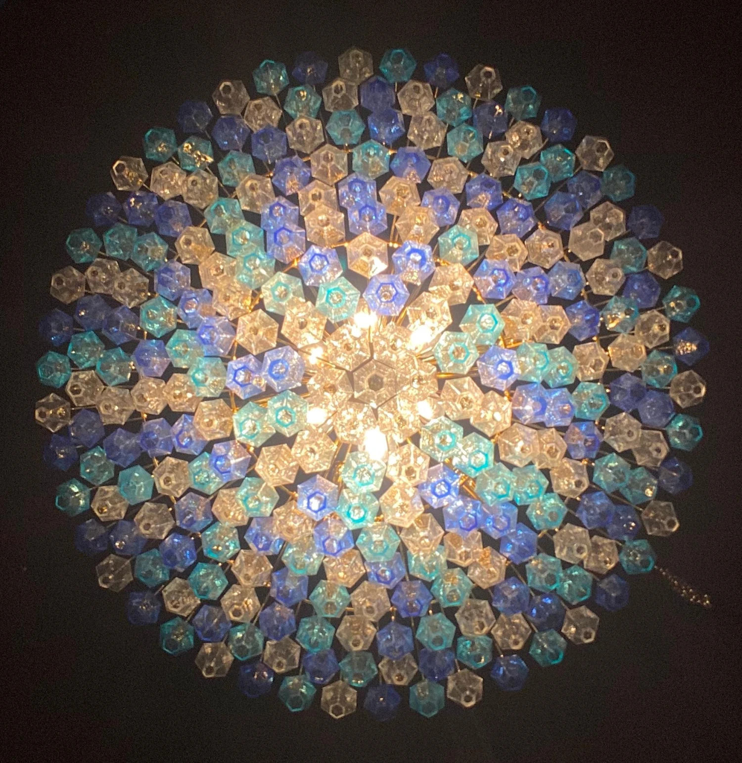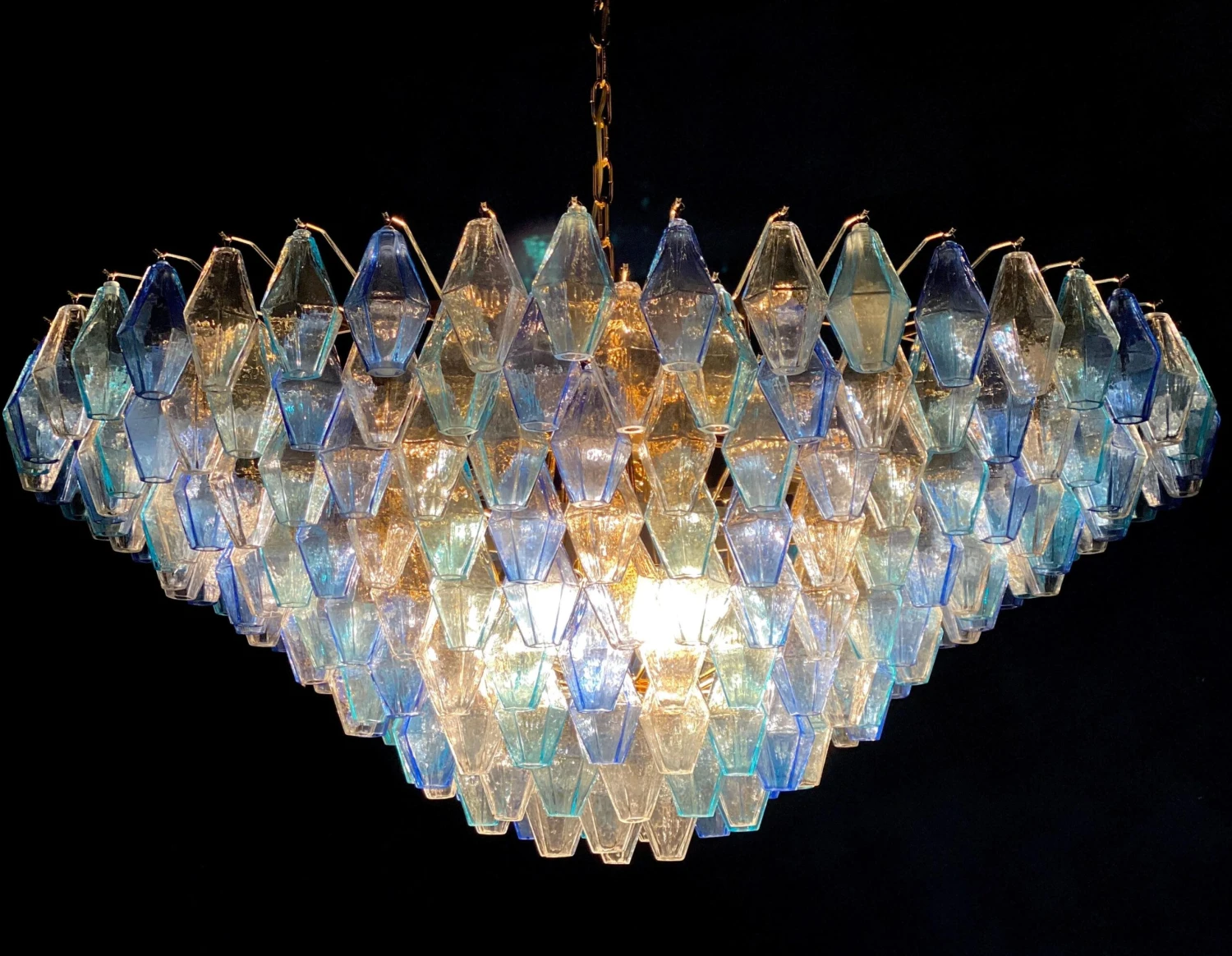 This huge striking chandelier consists of 253 hand blown Ice, heavenly and blue colored « Poliedri » made of Murano glass.