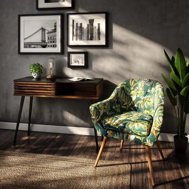 Fauteuil Ă motifs exotiques de la marque Atmosphera. Pieds en bois Ă monter soi mĂȘme.Â