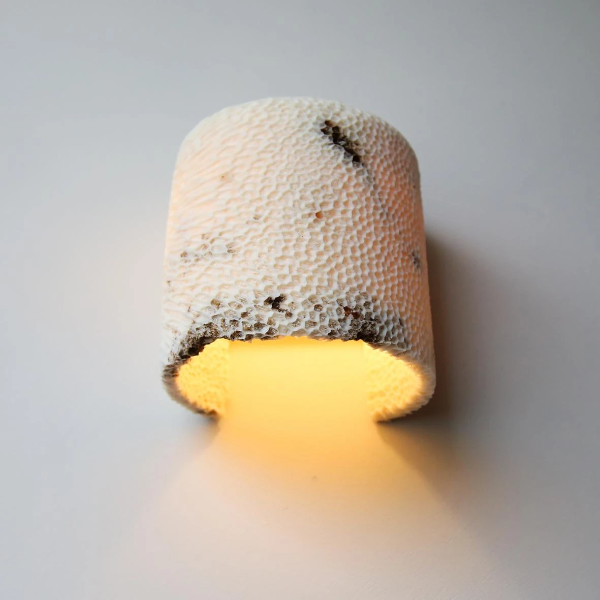This Fossil Coral Brain Dome Wall Sconce (Medium) is a captivating fusion of nature’s wonders and stunning craftsmanship, destined to bring a unique aesthetic warmth and etherial glow to your space. Ethically sourced and delicately handcrafted by local artisans of the Marovo Lagoon, these precious Fossil Coral pieces are transformed into contemporary collectables by artist Matt Woodfield, becoming the perfect addition to both minimal, modern and contemporary spaces, as well as eclectic art spaces, immersing any room in an ethereal glow and awe-inspiring elegance. Our Fossil Coral bespoke pieces are collected ethically on land, ensuring the preservation of live coral. Fossil Coral is the result of millions of years of natural processes, where the remains or impressions of coral colonies undergo mineral replacement, faithfully retaining the shape and structure of the original coral. Rest assured that our products are never created from live coral, allowing you to embrace the captivating beauty of Fossil Coral while supporting sustainable practices and the protection of our precious marine ecosystems.