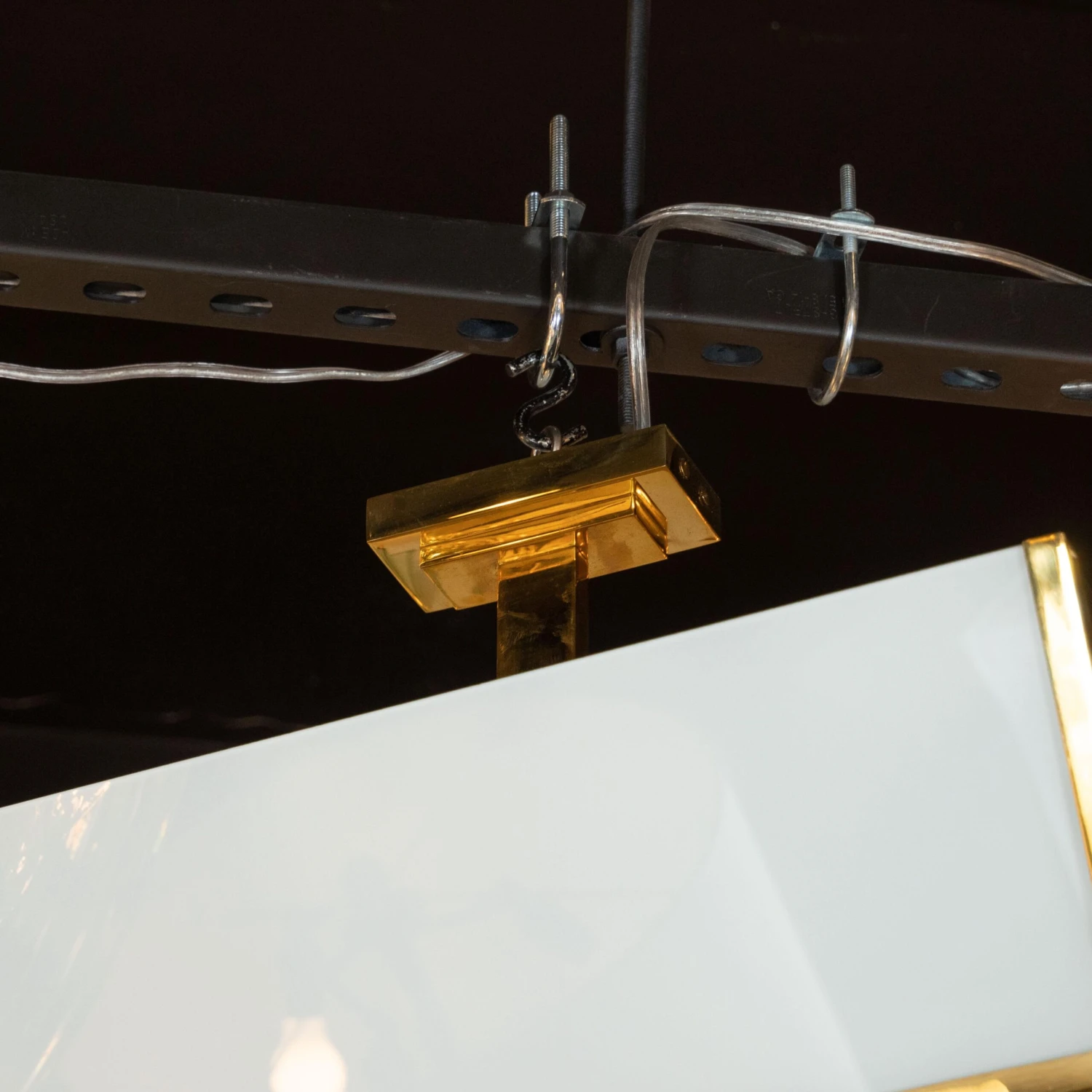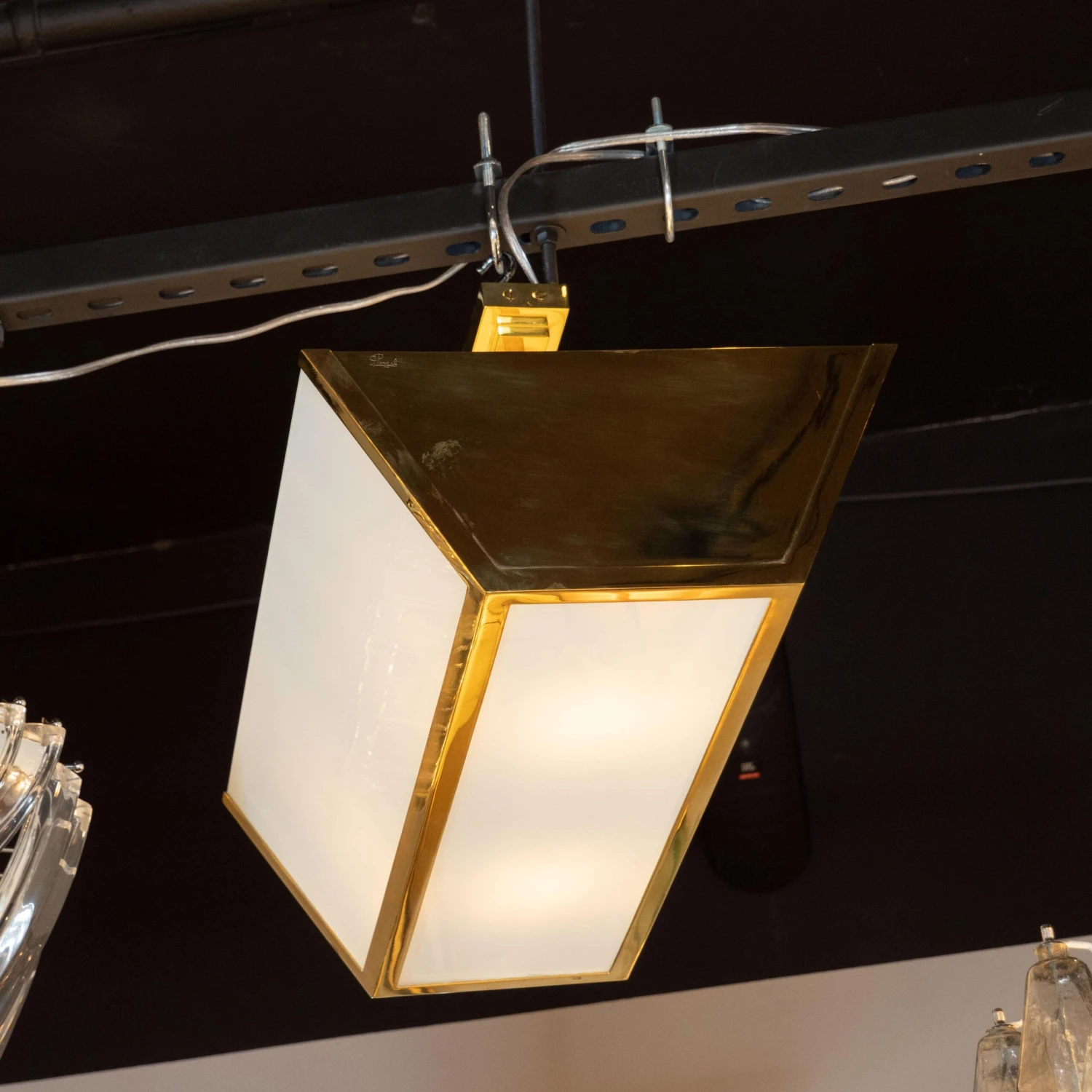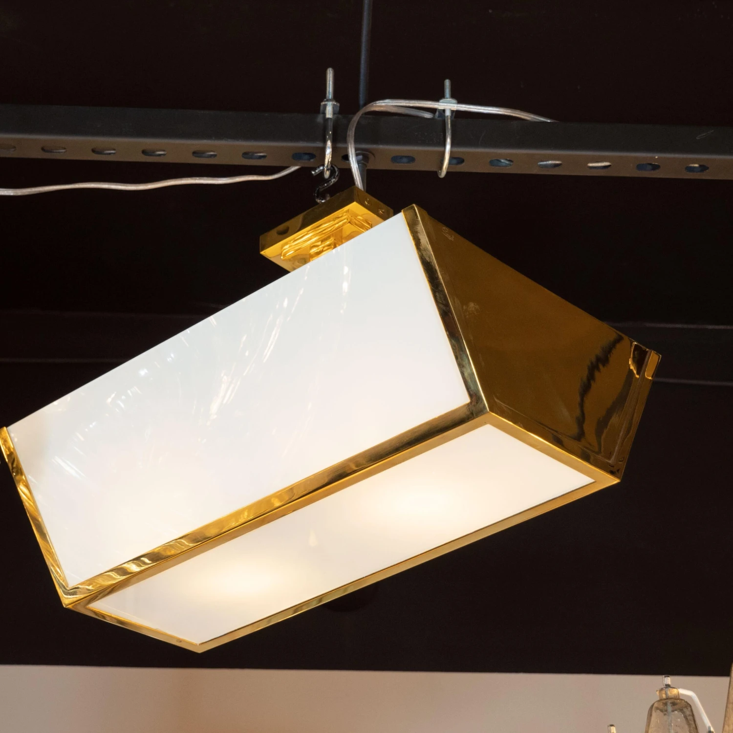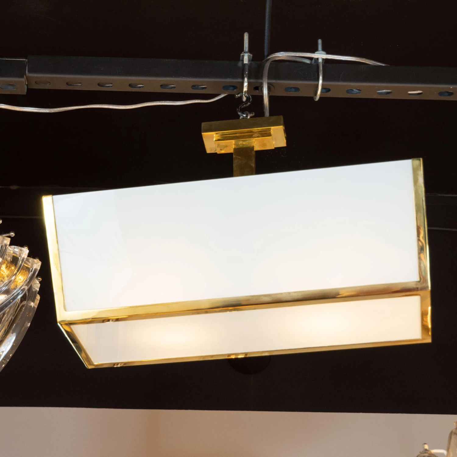 Jean Perzel has been one of the most renowned lighting ateliers in Paris for more than 80 years. This though, is the real deal-original and stunning fixture from circa 1935. With white glass shades housed in a polished brass frame with solid brass sides, this chandelier represents the perfect marriage of luxurious materials and great design. Its austere pentagonal form showcases the architectonic lines of Art Deco refined to their essence. Signed Perzel. The chandelier has been designed to accommodate two Edison bulbs, providing up to 200 watts each. It has been polished and newly rewired to American standards. Excellent condition. We have a pair available for $8475.
