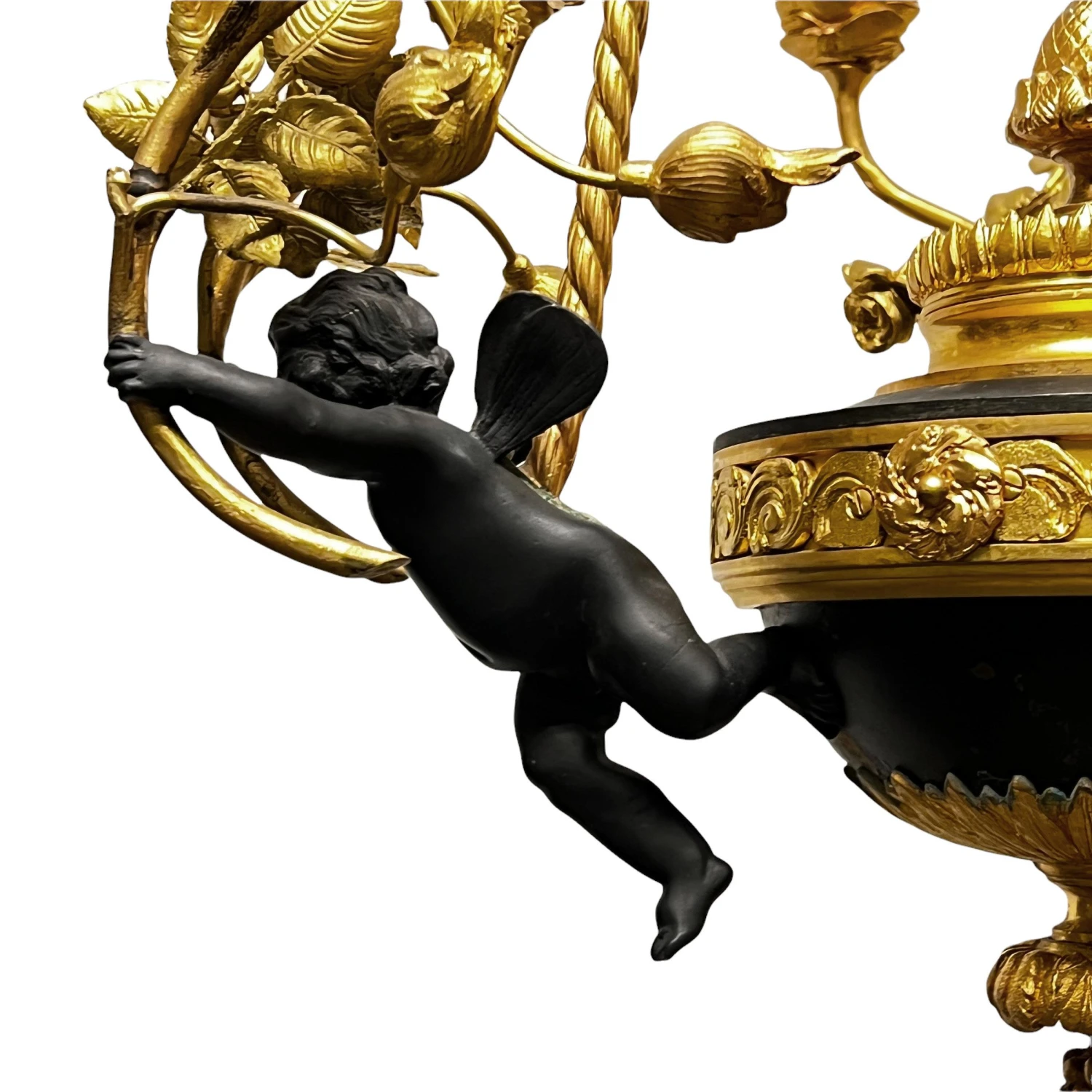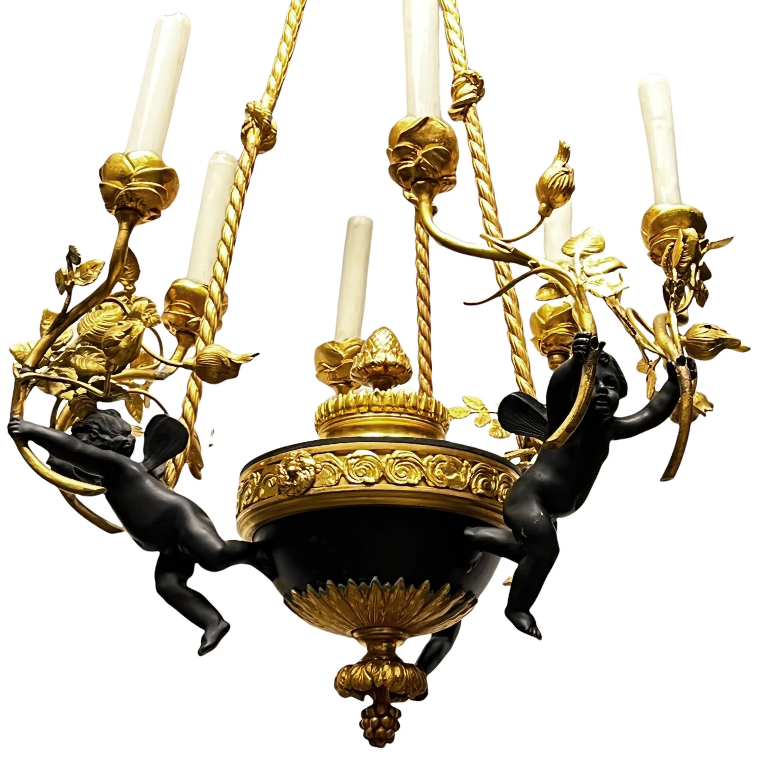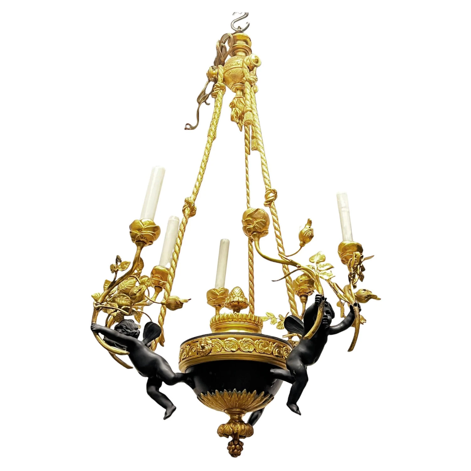 Very fine quality French turn of the century Louis XVI style patinated bronze six-light putti motif chandelier.