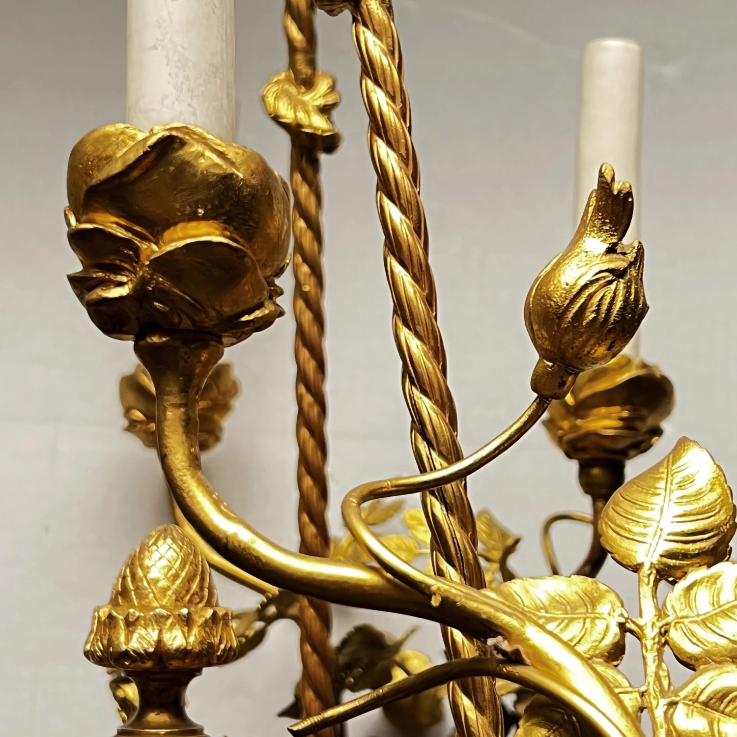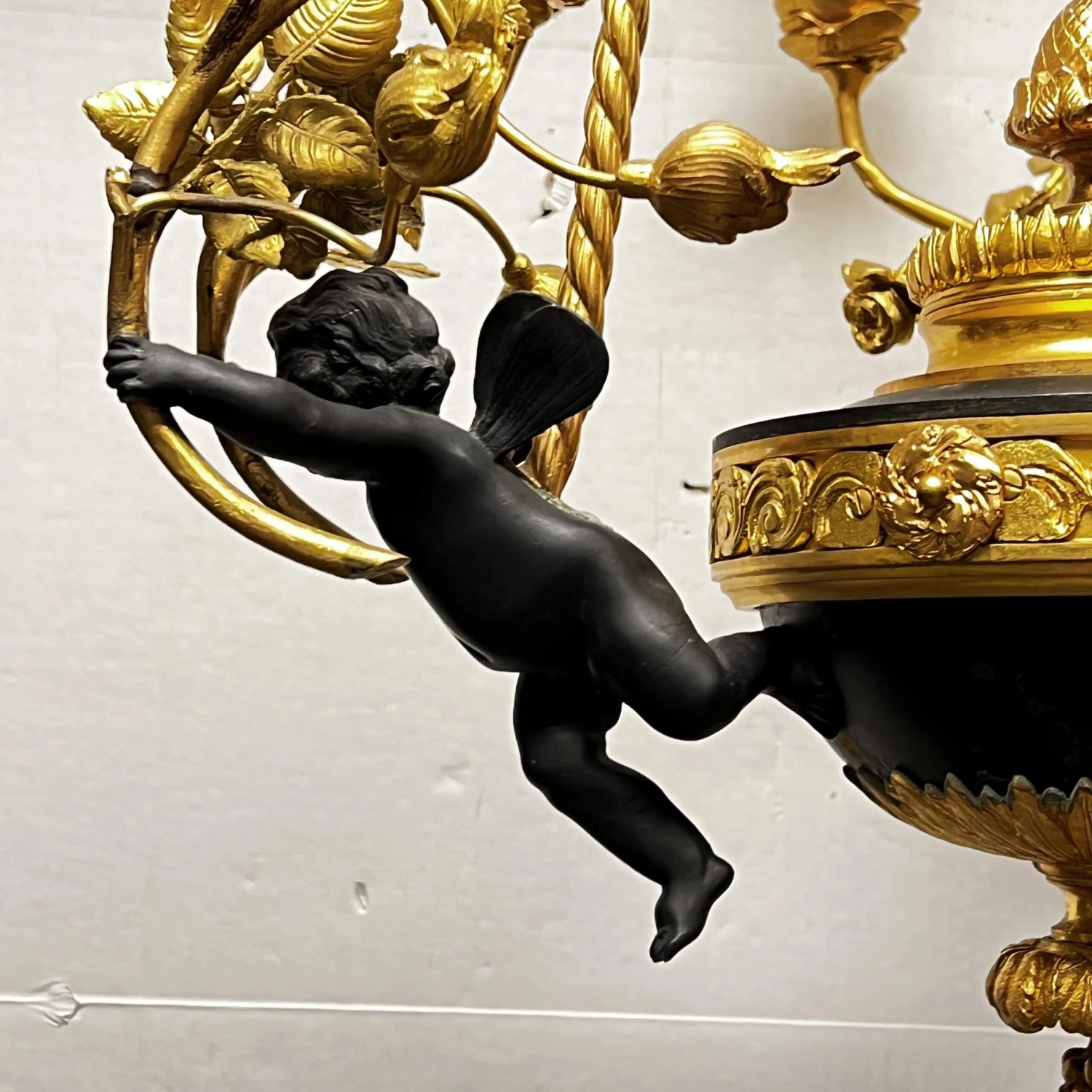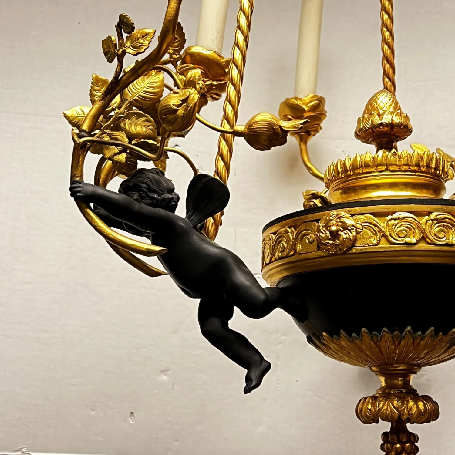 Very fine quality French turn of the century Louis XVI style patinated bronze six-light putti motif chandelier.