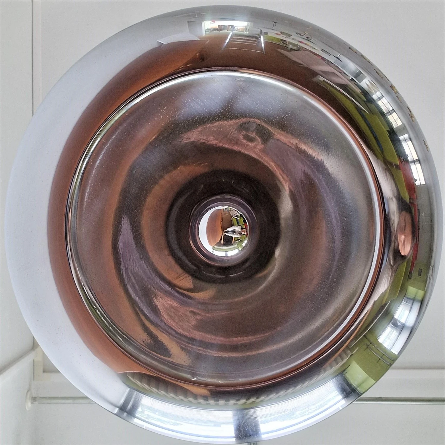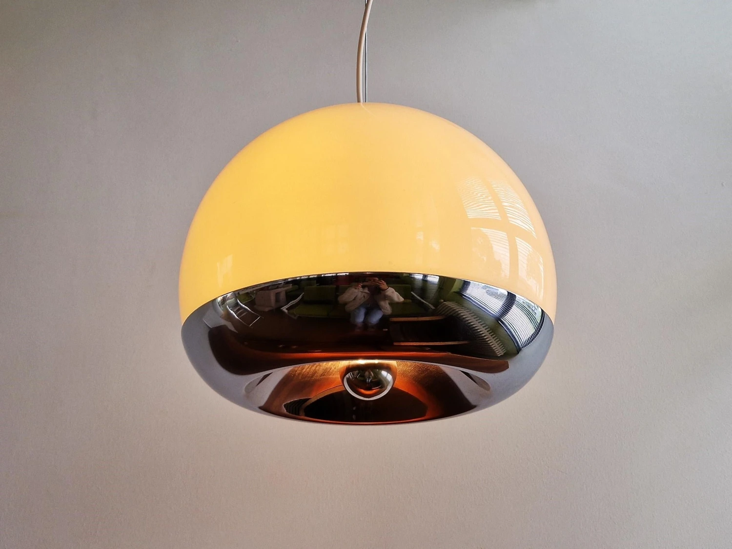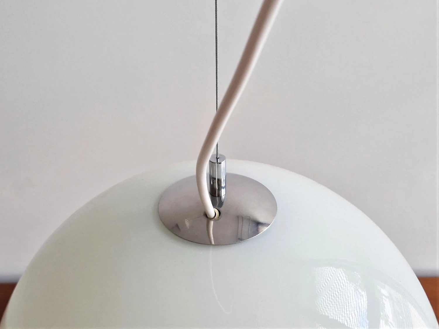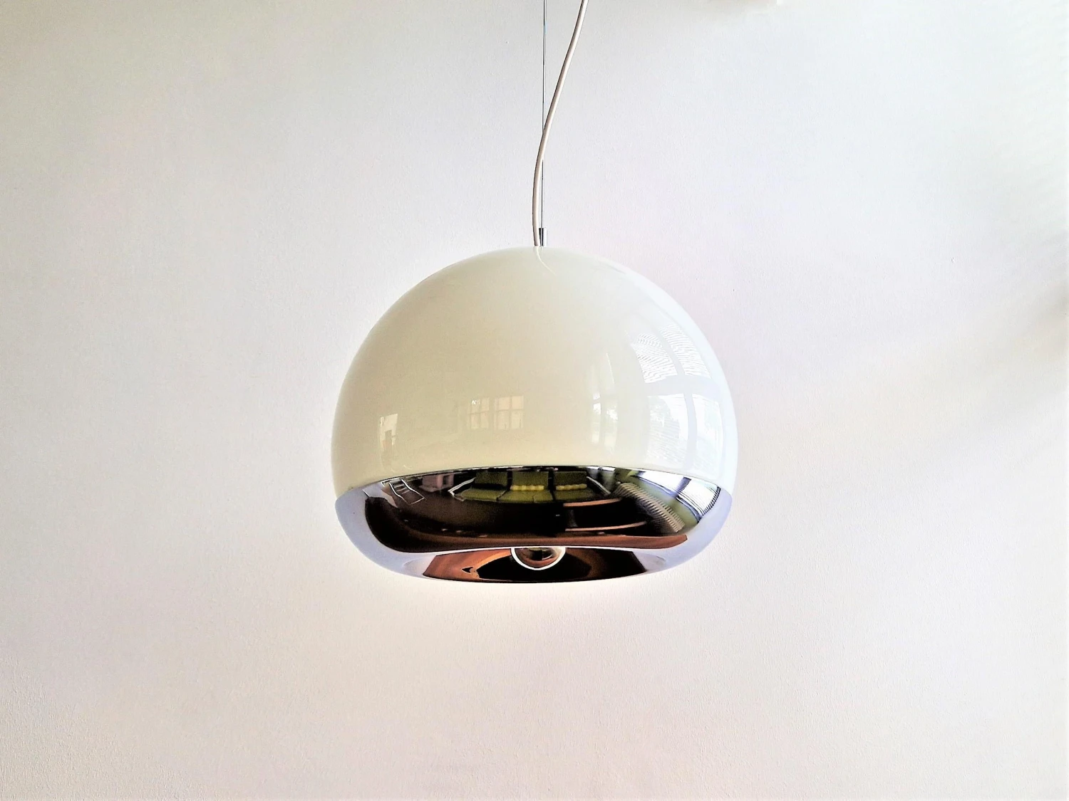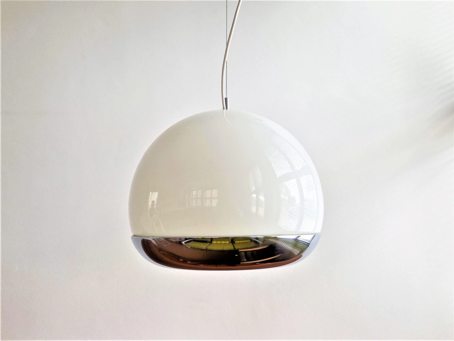 This beautiful pendant lamp was a production based on a project by the architects De Martini, Falconi & Fois for Reggiani. It consist out of a white opaline glass bowl that holds 2 lightbulbs, with a chromed metal bottom part that holds a single bulb (mirrored bulb looks best we think). The lamp has a steel wire that holds the lamp to help carry the weight, A true eyecatcher and a beautiful warm light in your room when lit. The lamp is in a very good condition, with minor signs of age and use.
