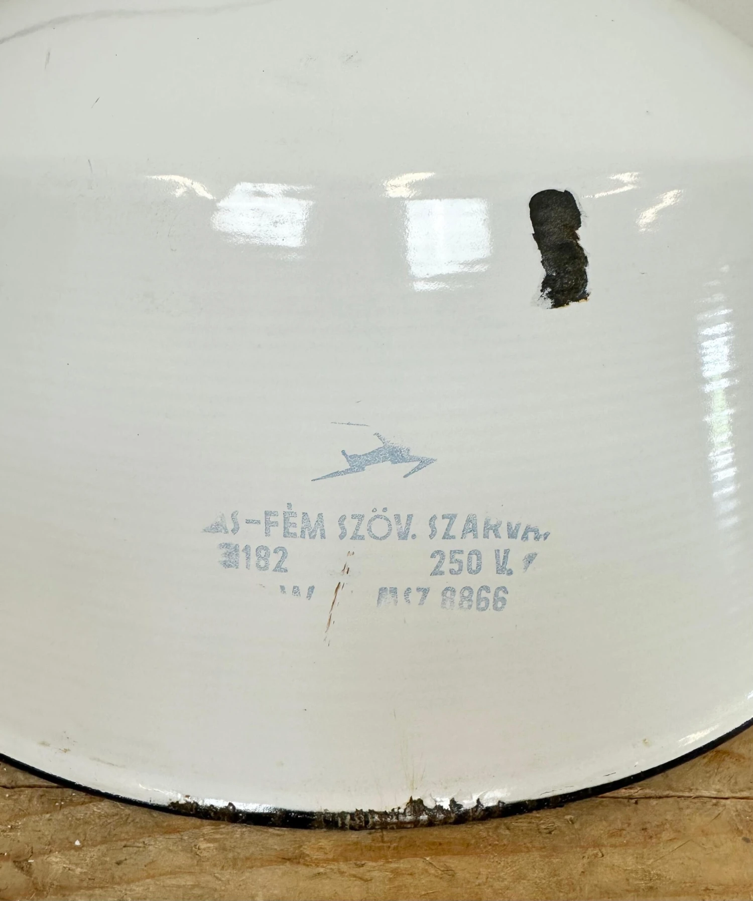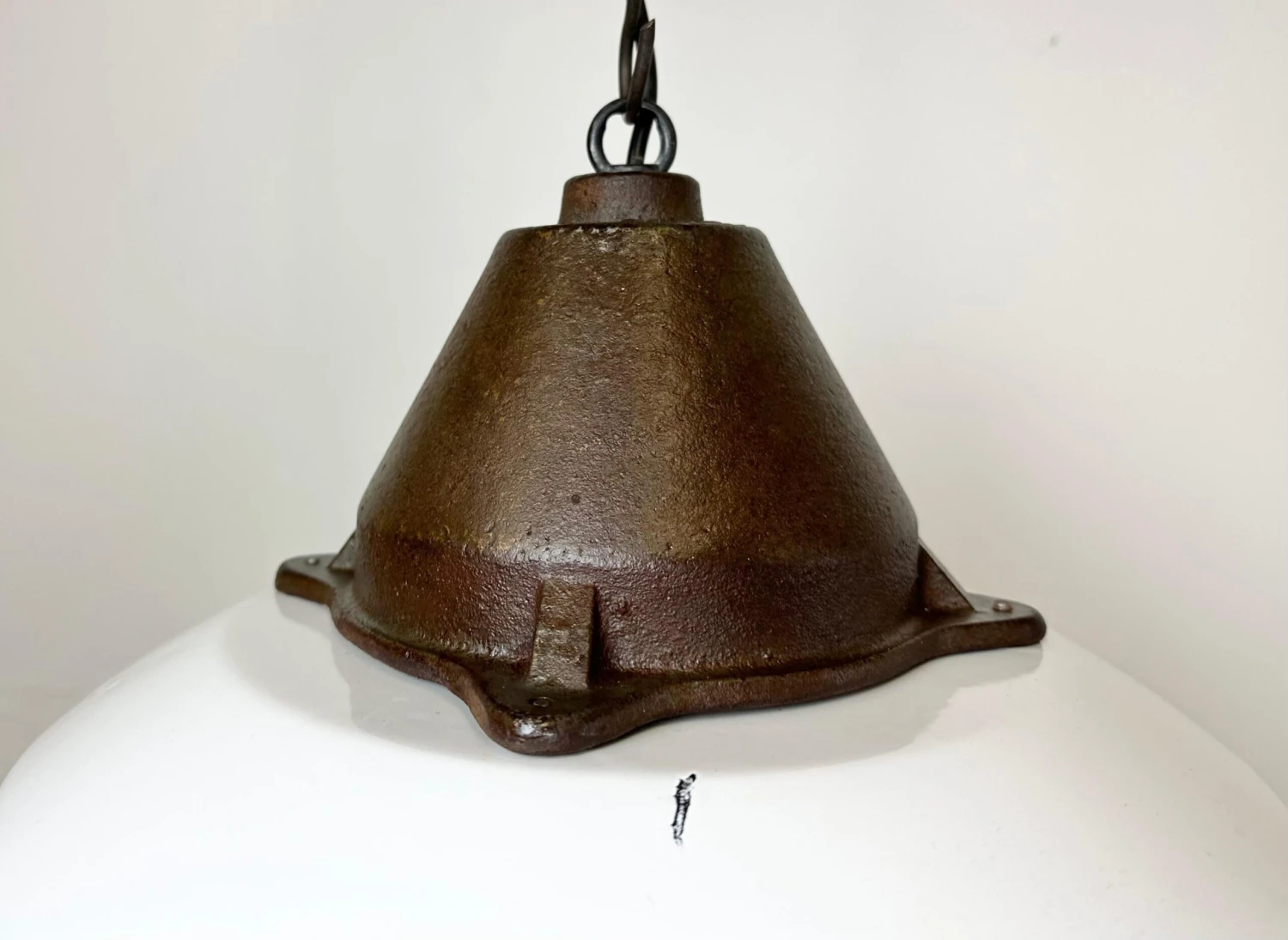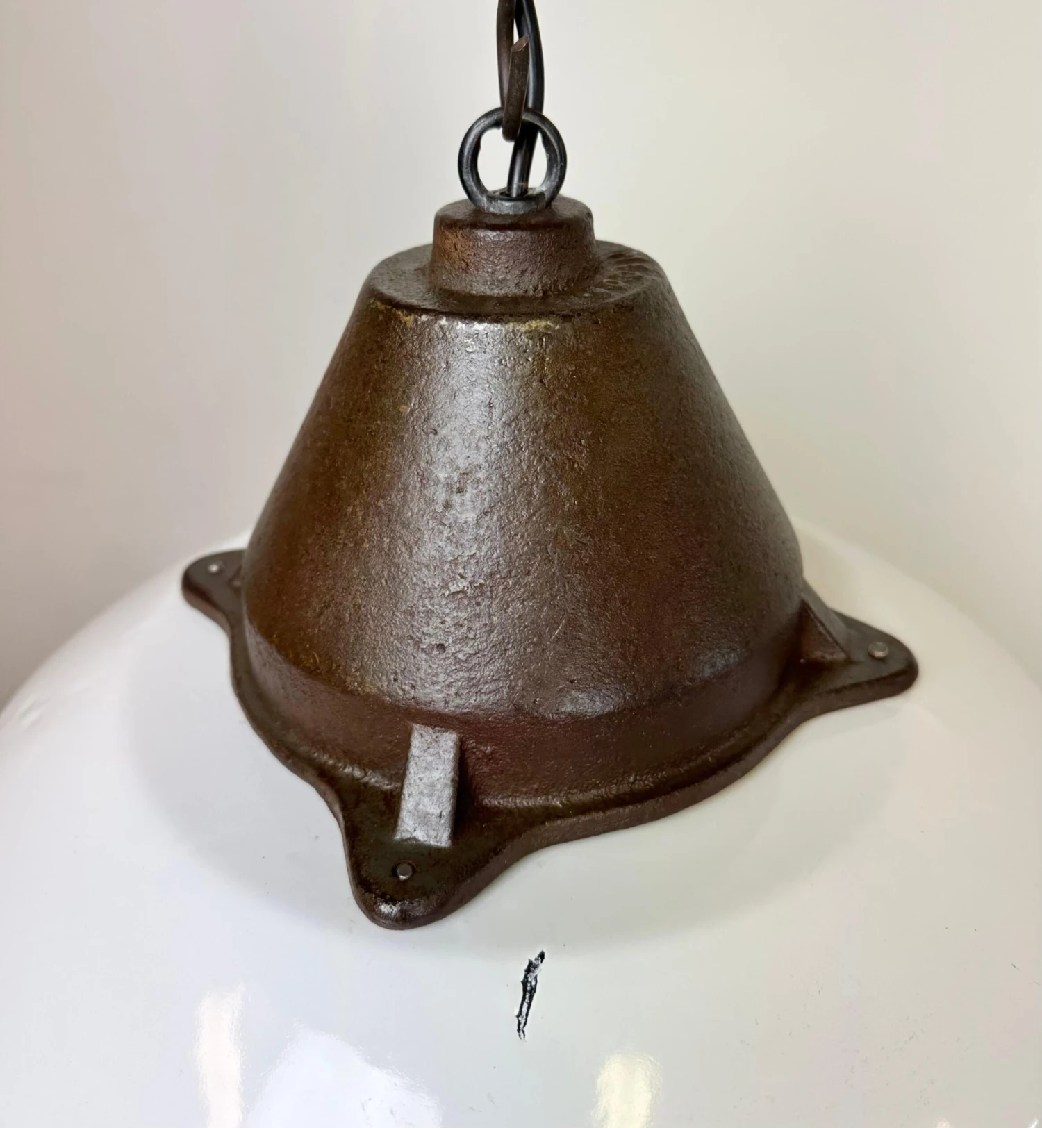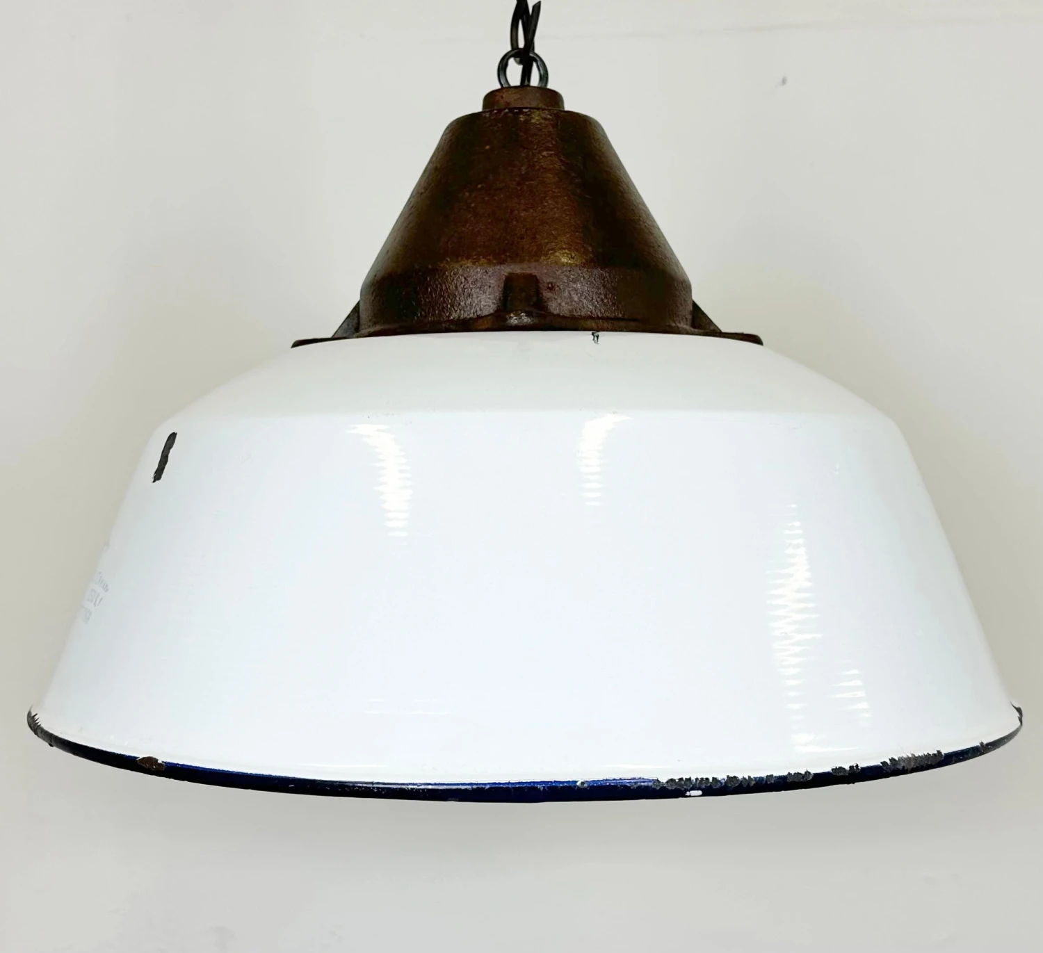 Industrial hanging lamp manufactured by Szarvasi Vas – FĂ©m in Hungary during the 1960s. It features a white enamel shade, white enamel interior and a cast iron top. New porcelain socket requires E 27/ E26 light bulbs. New wire. The diameter of the lamp is 41 cm. The weight of the lamp is 3.8 kg.