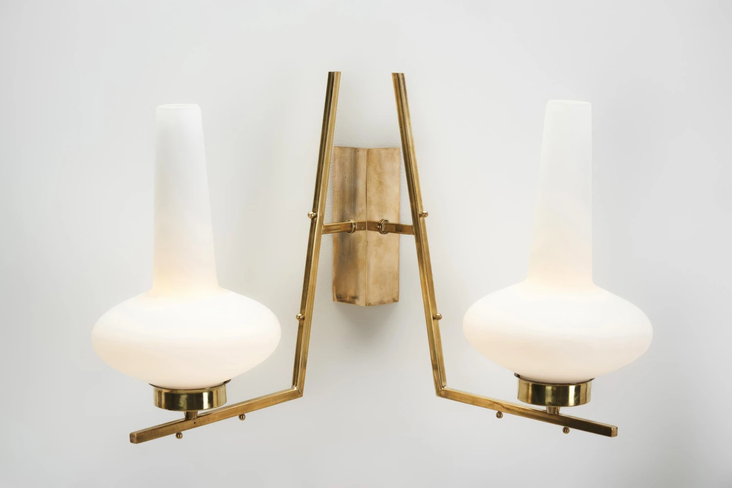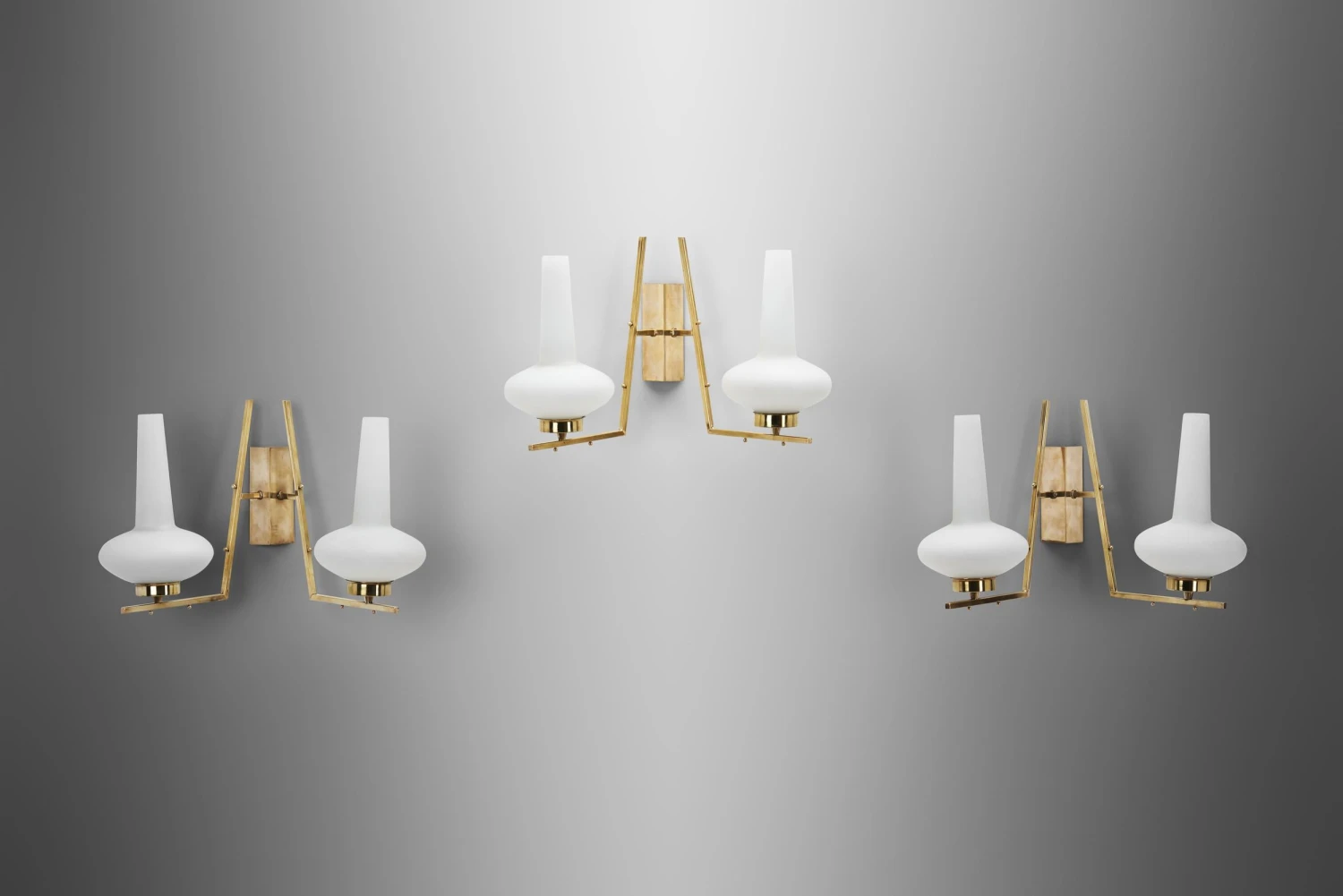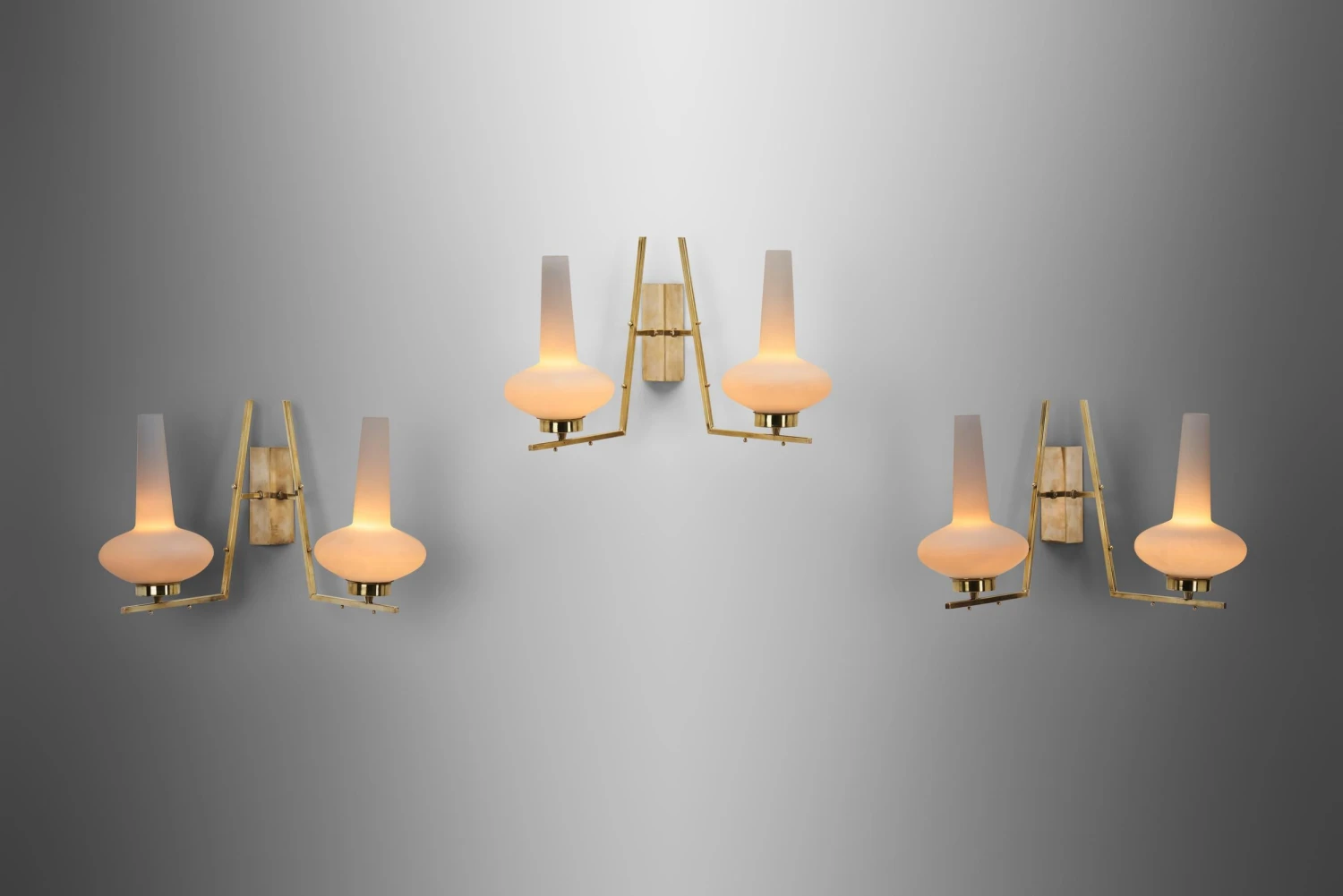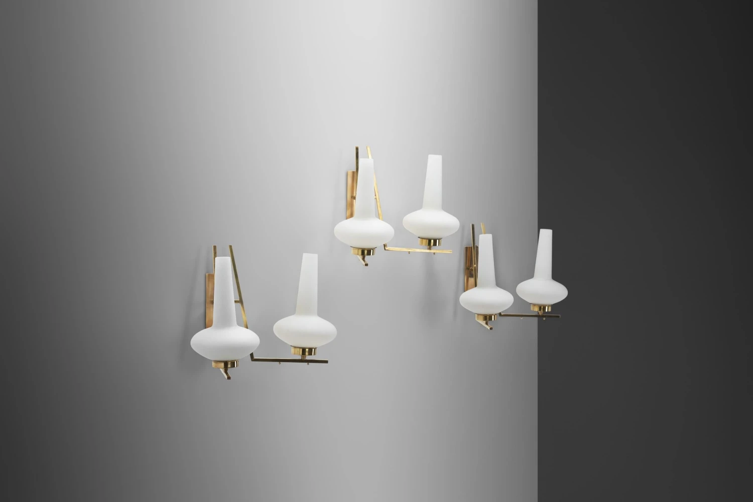 The allure of Italian midcentury lighting still endures, thanks to the timeless inventiveness of models such as these wall lamps. The design is individualistic, balancing the lamps on the border between art and design – if there is one at all -. With a form that recalls the Art Deco movement, these wall lamps combine a brass structure with a characteristic opal glass shade. The shades’ shape resembles that of traditional oil lamps’, with a collar and a so-called chimney. The shape is enhanced, with a more pronounced base and neck. As the light sources are placed near the base of the shades, when lit, the glass showcases its many colours with an ombre effect. Whether turned on or off, the opal shades provide great contrast to the patinated brass structures. The sleek, straight lines of the backplates and arms create interesting angles. The lines are decorated with small spheres that pop against the smooth surfaces and provide an element of whimsy. Italian midcentury designers merged culture, industry, and Italian identity, when bringing Italian lighting to the highest level of excellence. Exemplified by these lamps, they created high style avant-garde in both forms and groundbreaking technologies, making significant contribution to the story of Italian design, while bringing lighting to the highest expression of modernism.