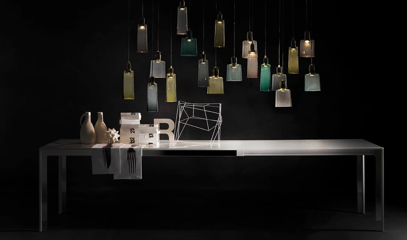 In the MUN lamps, the steady leading light meets no obstacles by the limpid transparency of our Pure manufacturing; it is harmoniously guided by our Pleated finishing; it supports the fluctuating and Baroque sinuosities of the Twist surface. Different sparkle effects, better personalized through colours suggested with a palette of six evocative and refined tones: lead, cameo, aquamarine, rose quartz, angora and baltic.