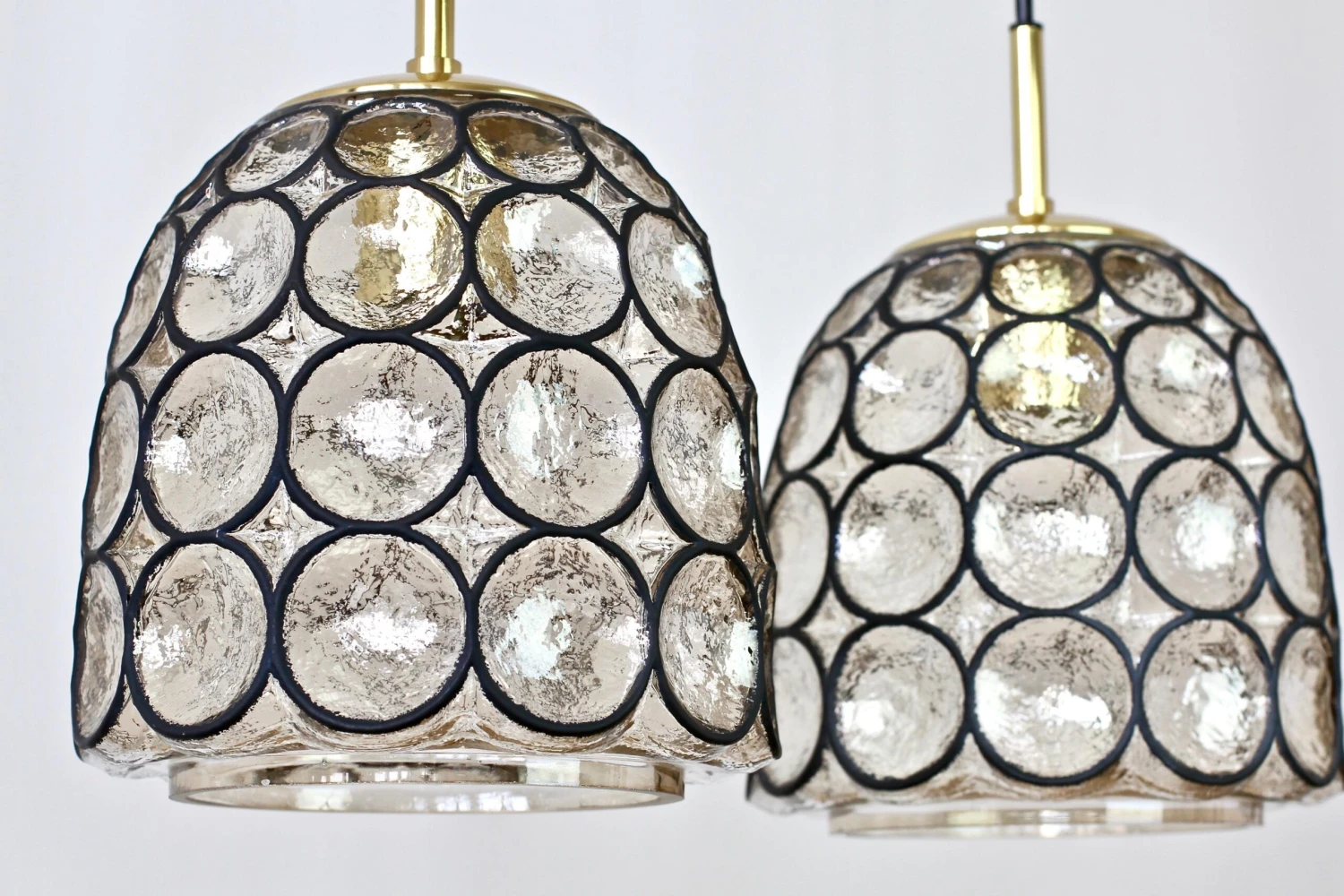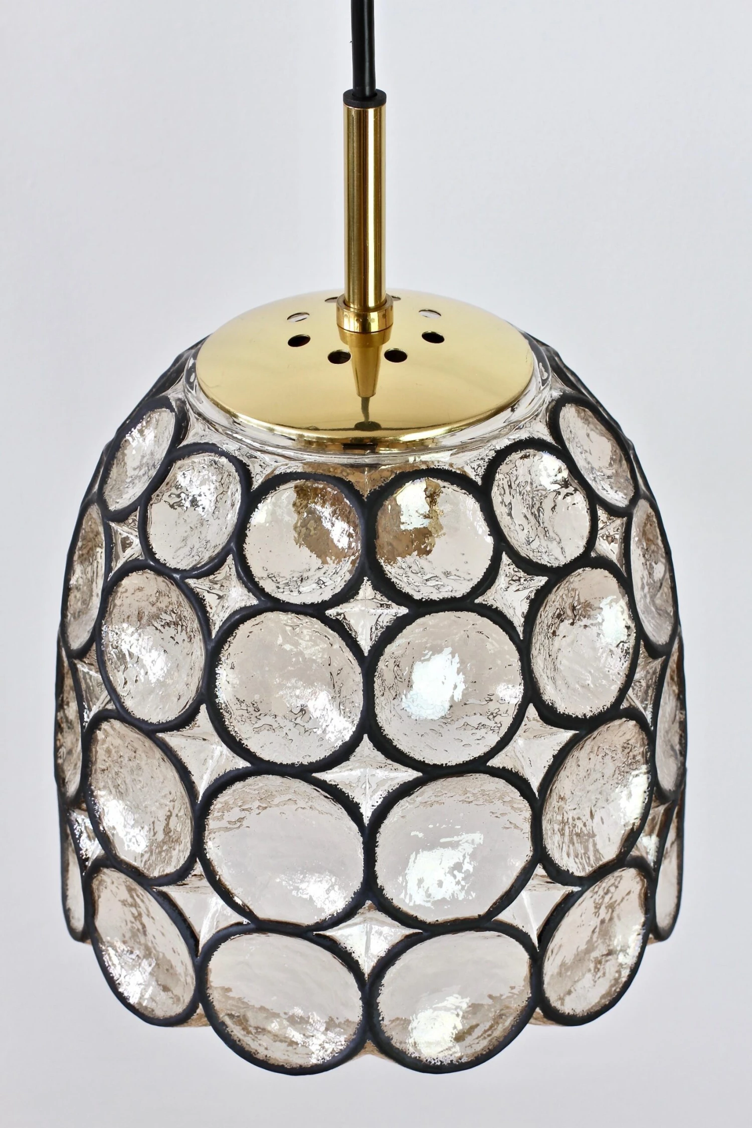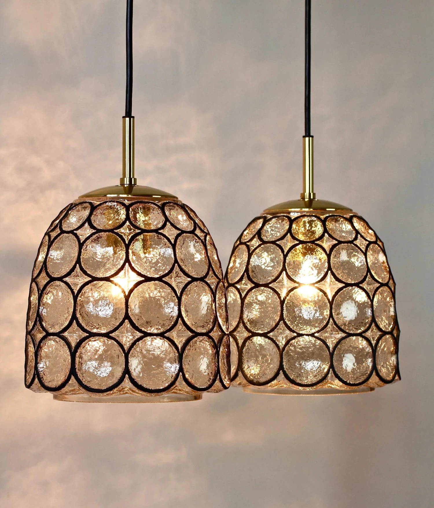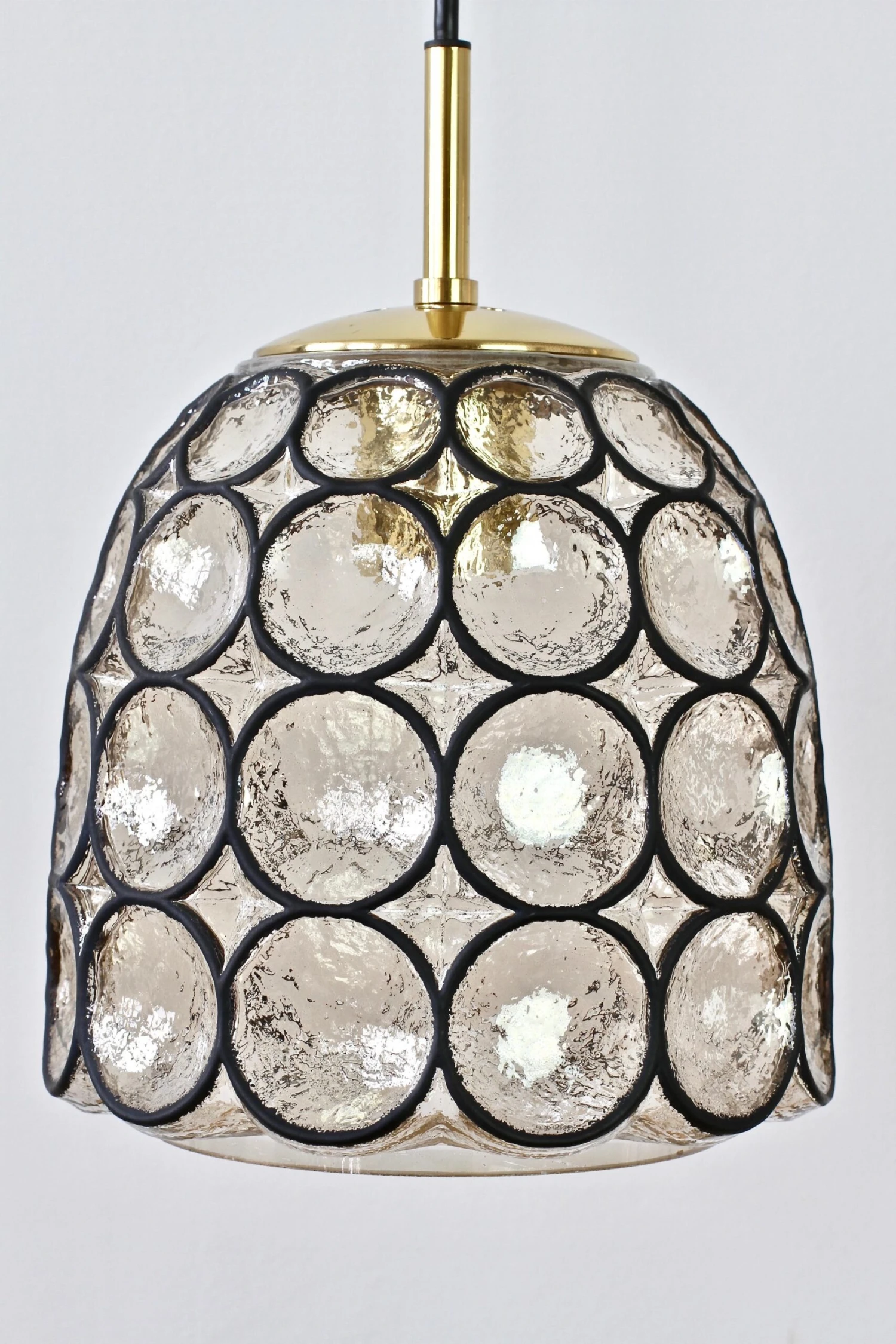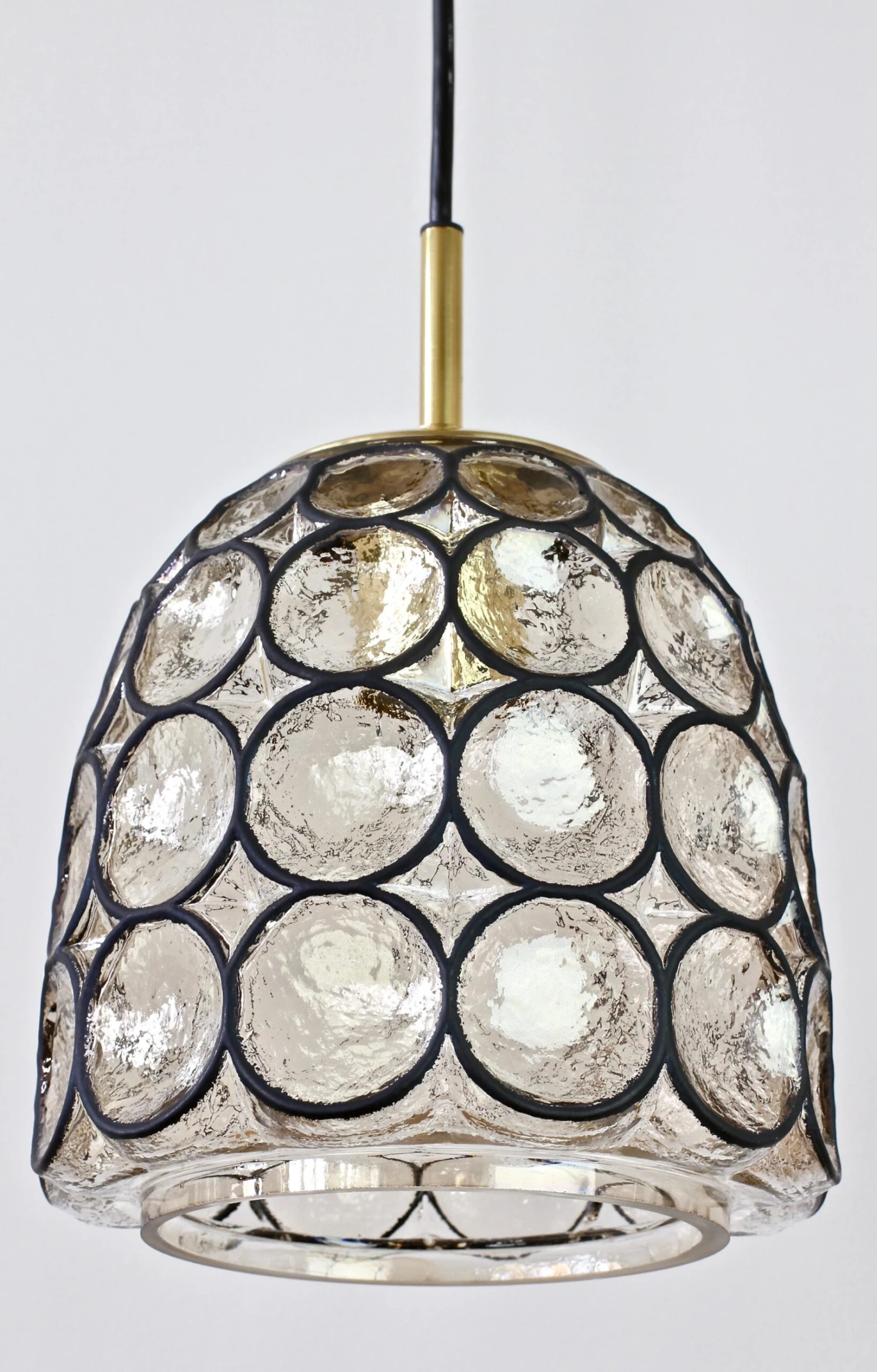 Limburg Glashütte one of a set of three of « iron » rings bell pendant lamps / lights / lanterns with polished brass hardware. Minimal, geometric and simply shaped small hanging ceiling light fixture made in Germany, circa 1965. The honeycombed textured bubble glass bulges slightly inwards of the black « Iron » coated rings keeping the lamp’s simple and minimalistic form whilst helping to contribute to the light’s pleasing bell shape, Classic midcentury vintage lighting design by Glashutte Limburg.
