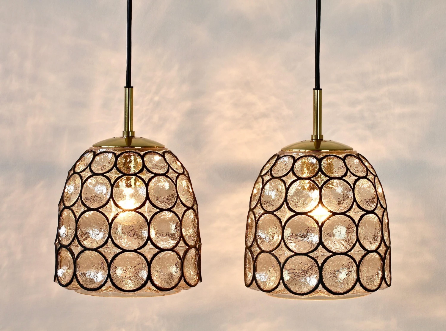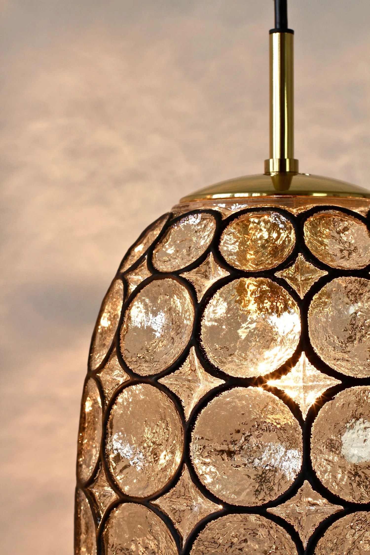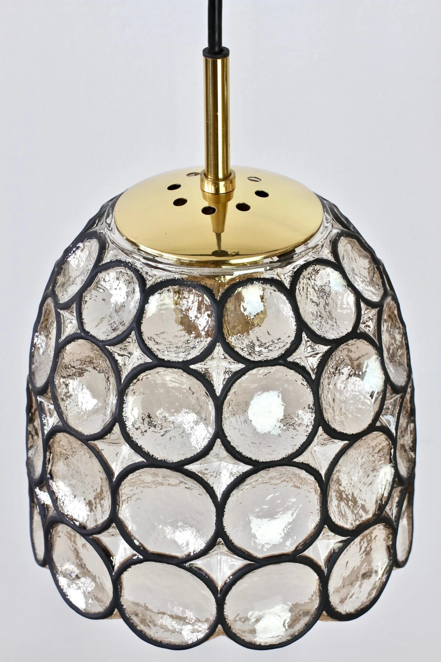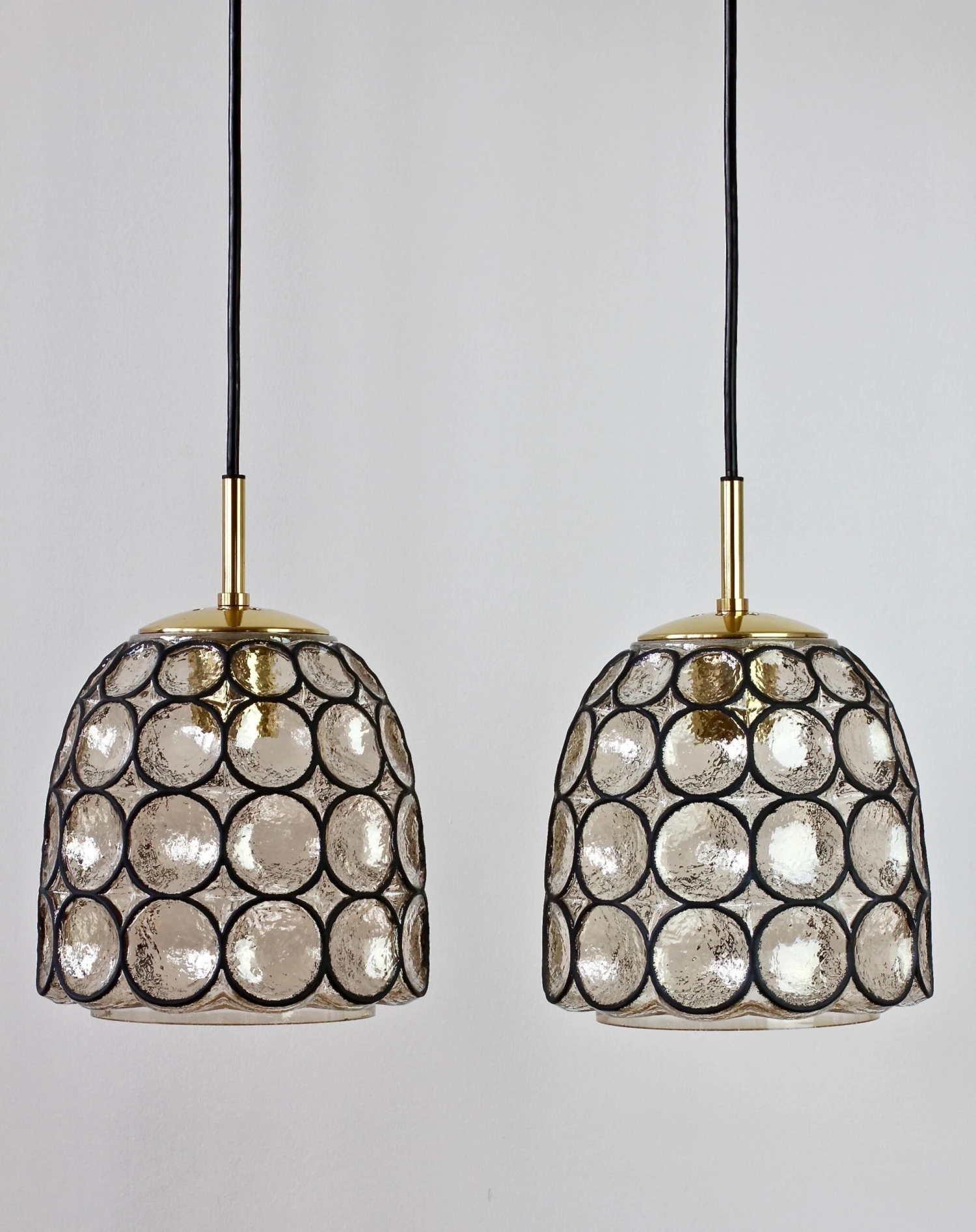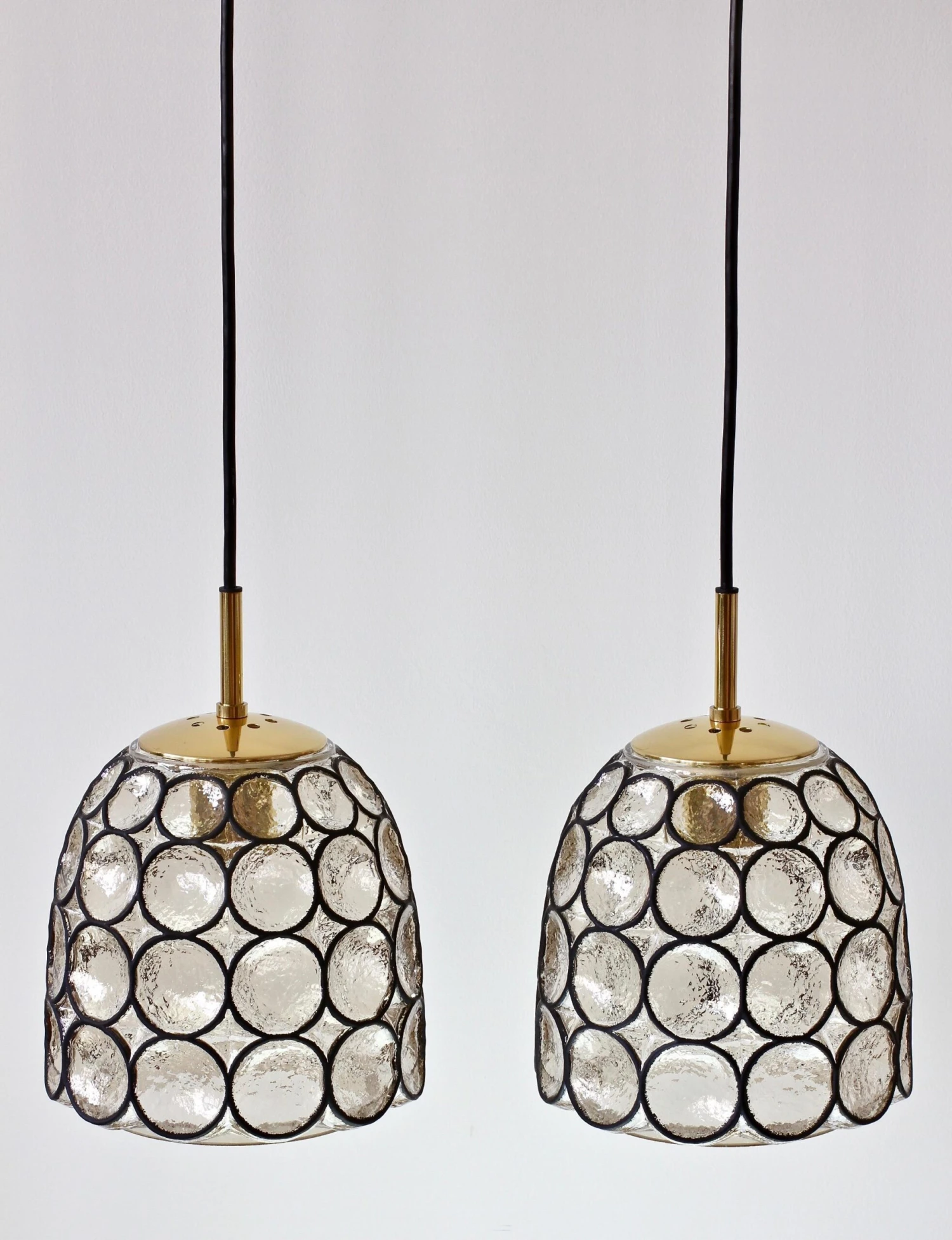 Limburg Glashütte one of a set of three of « iron » rings bell pendant lamps / lights / lanterns with polished brass hardware. Minimal, geometric and simply shaped small hanging ceiling light fixture made in Germany, circa 1965. The honeycombed textured bubble glass bulges slightly inwards of the black « Iron » coated rings keeping the lamp’s simple and minimalistic form whilst helping to contribute to the light’s pleasing bell shape, Classic midcentury vintage lighting design by Glashutte Limburg.