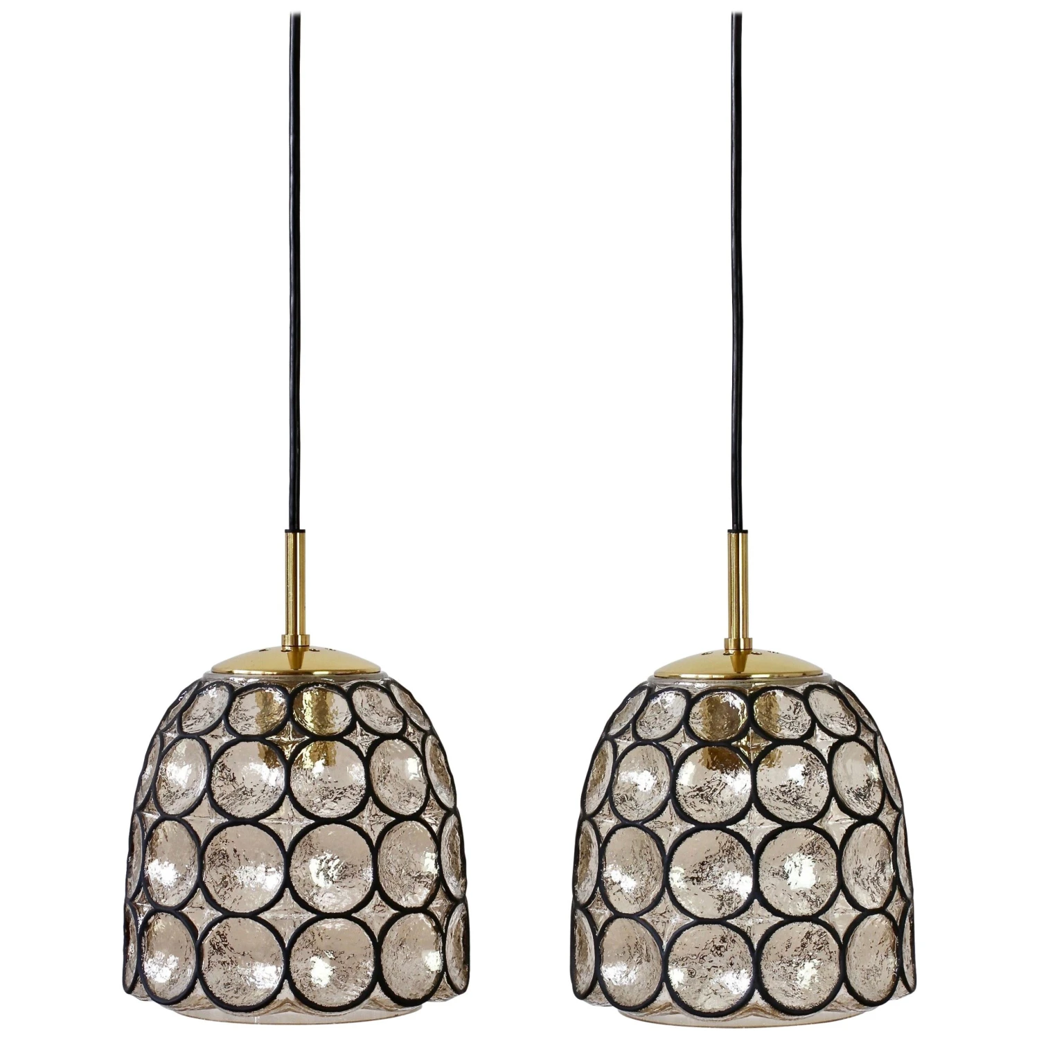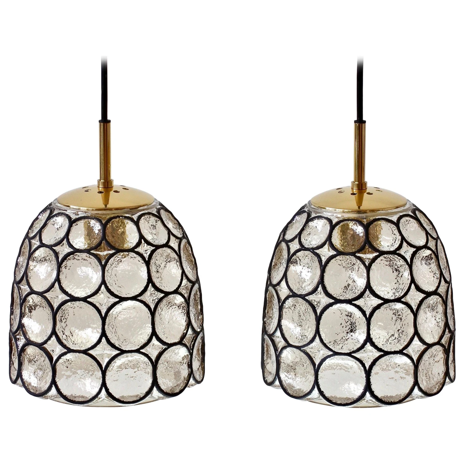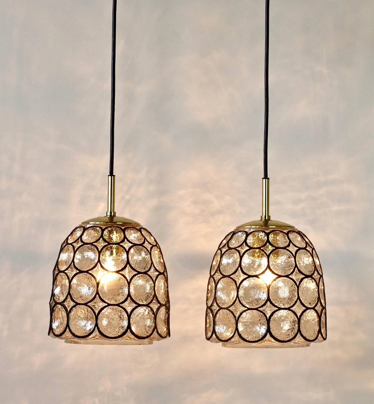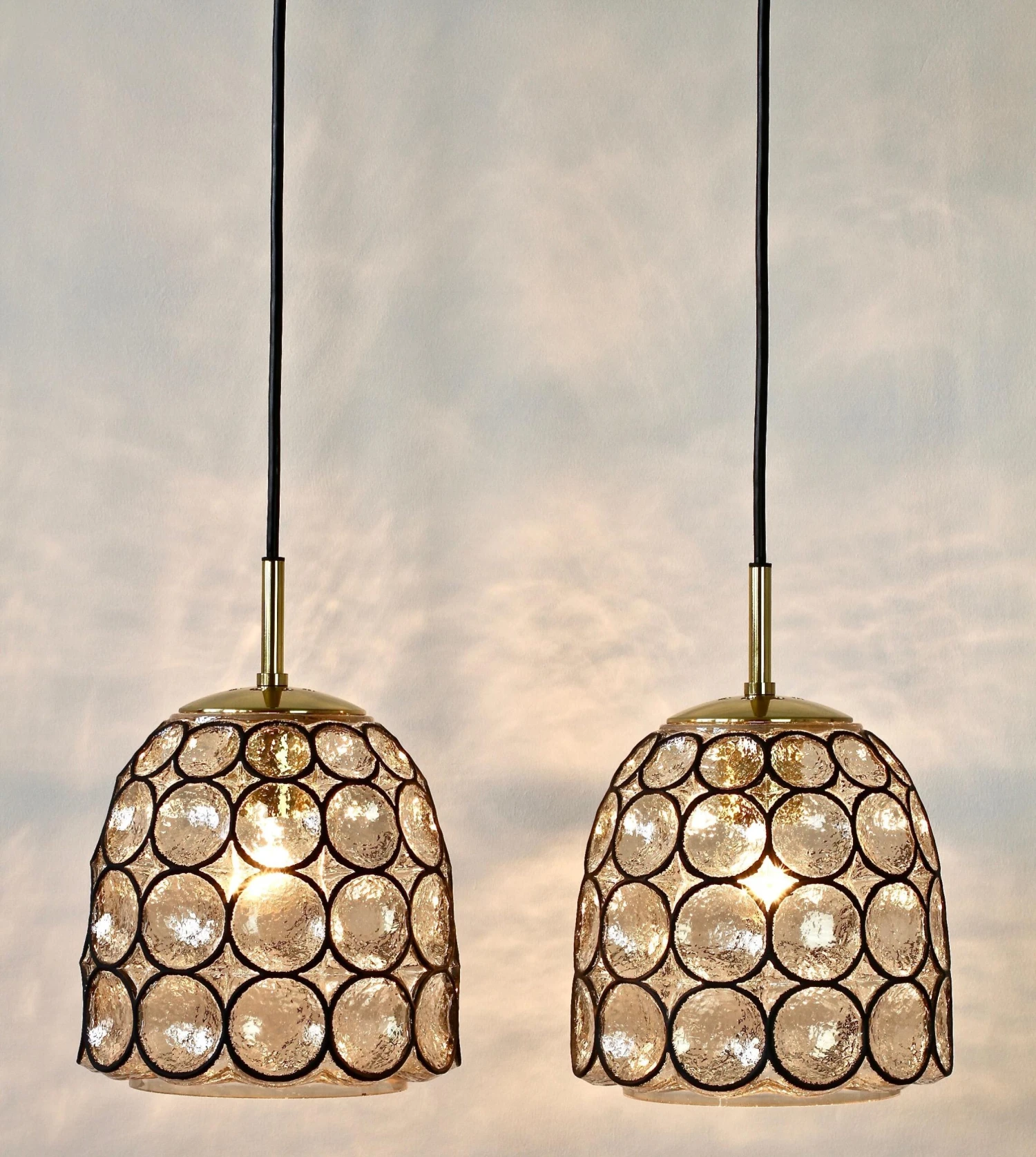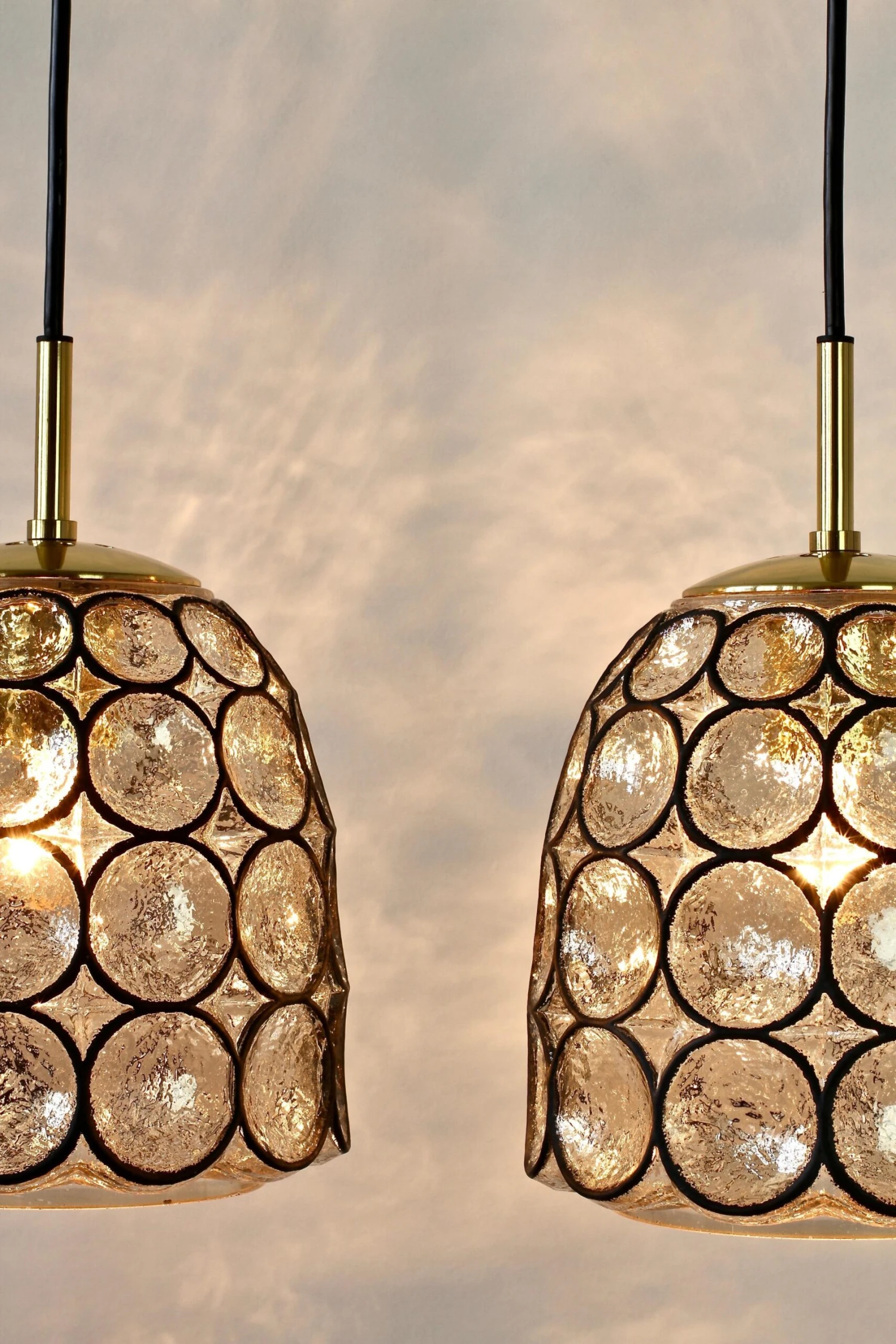 Limburg Glashütte one of a set of three of « iron » rings bell pendant lamps / lights / lanterns with polished brass hardware. Minimal, geometric and simply shaped small hanging ceiling light fixture made in Germany, circa 1965. The honeycombed textured bubble glass bulges slightly inwards of the black « Iron » coated rings keeping the lamp’s simple and minimalistic form whilst helping to contribute to the light’s pleasing bell shape, Classic midcentury vintage lighting design by Glashutte Limburg.