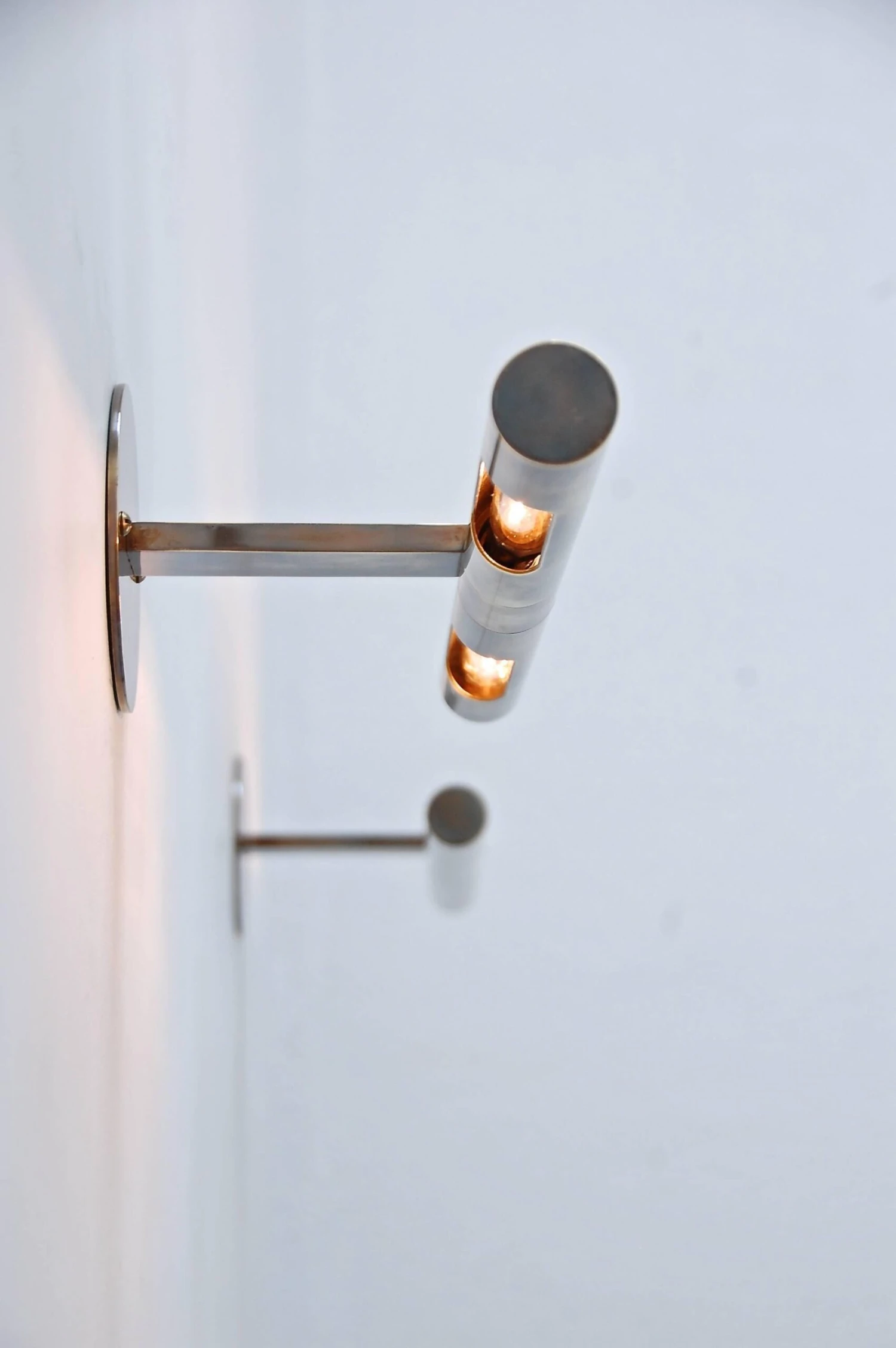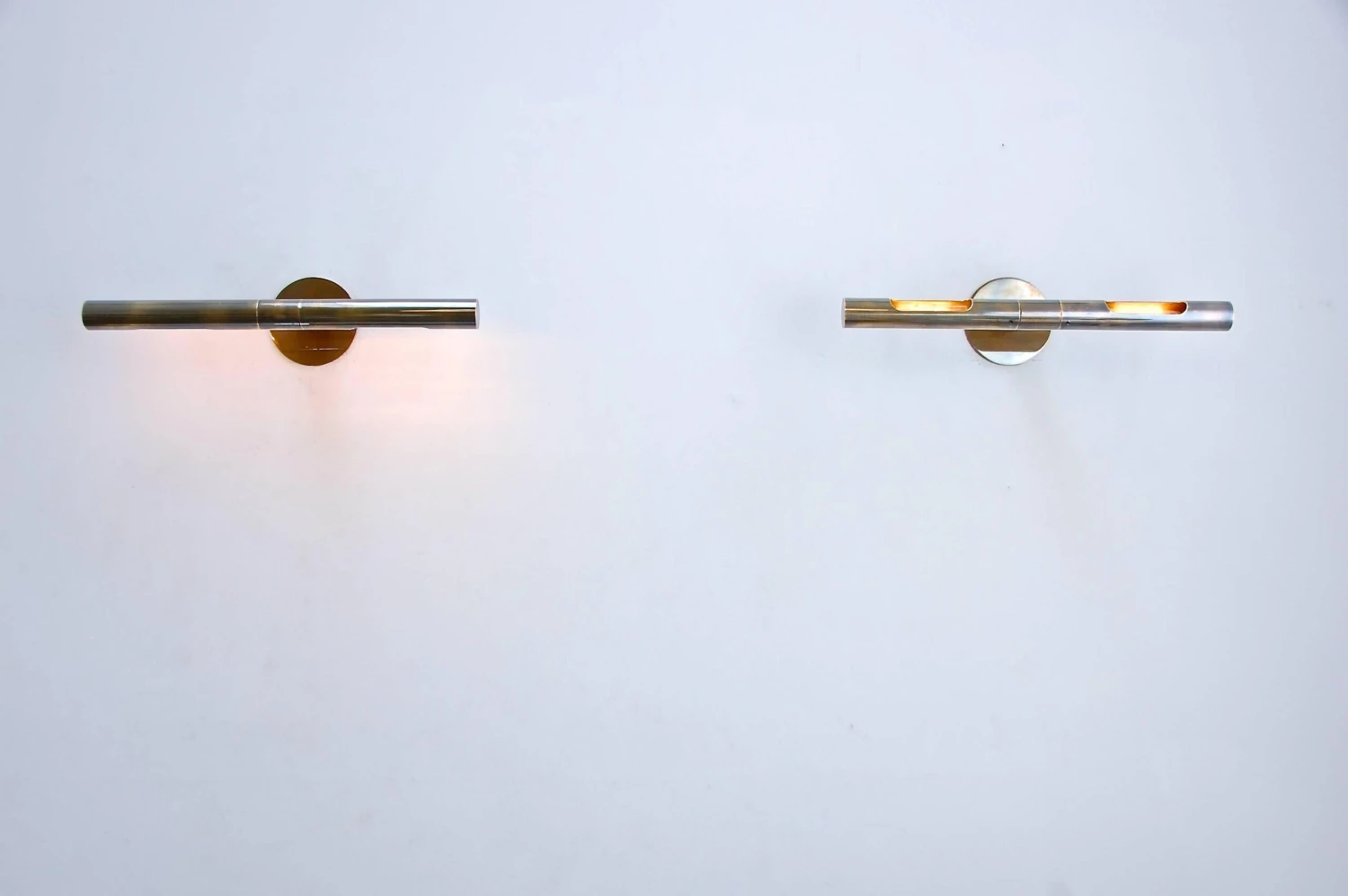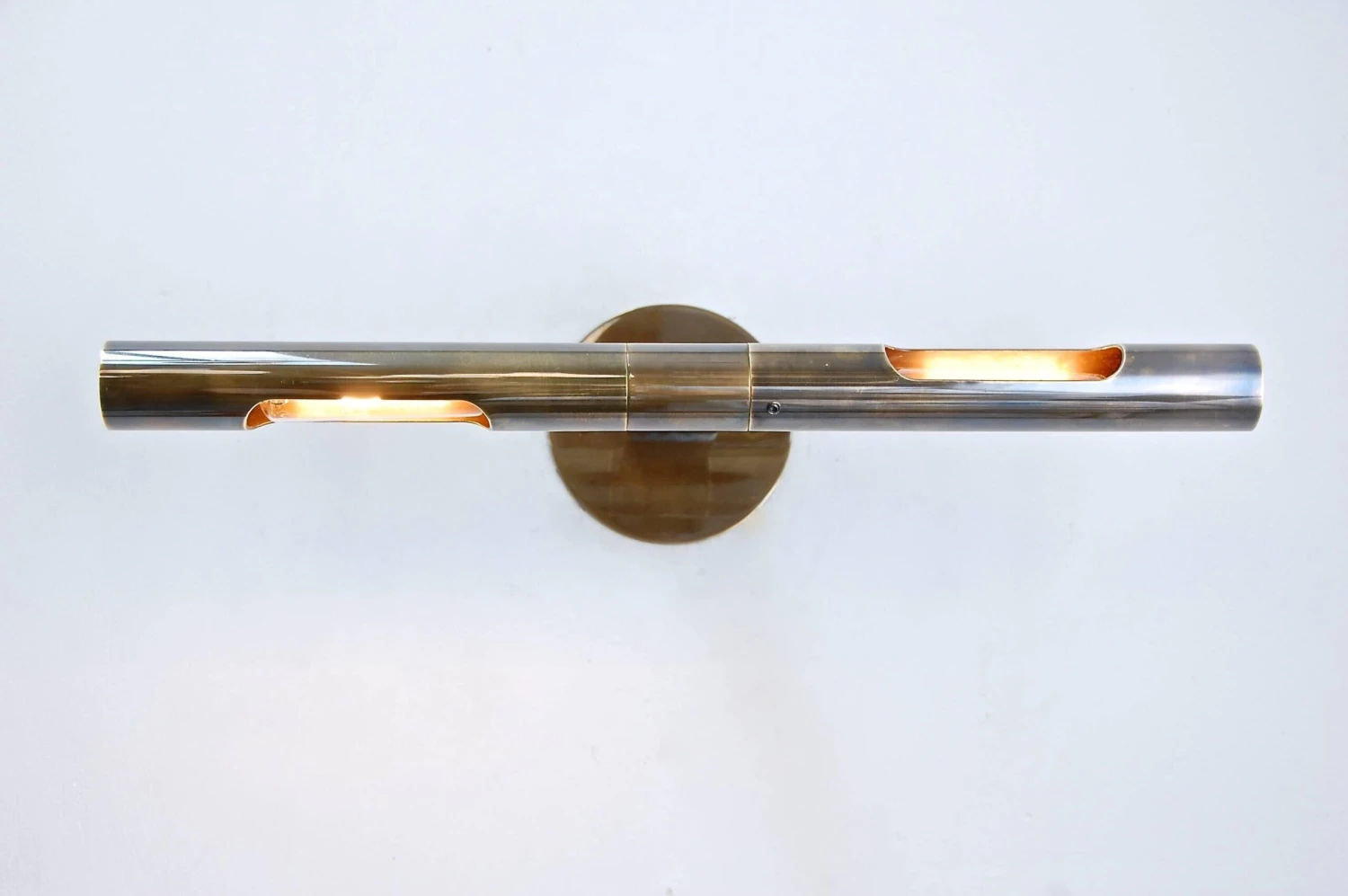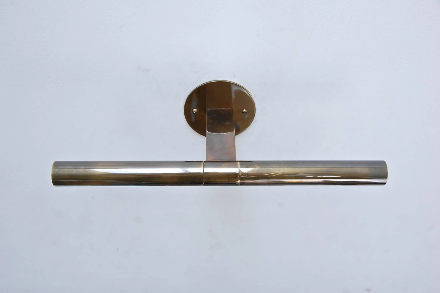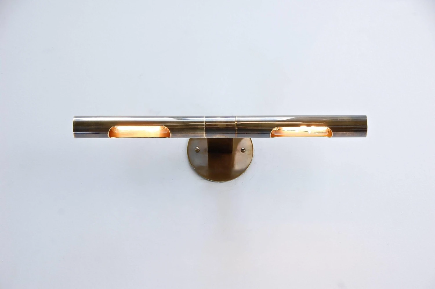 Superbly crafted linear wall sconce designed by Lumfardo Luminaires to feature artwork and/or objets d’art. Each shade is independent and can be directed individually. Patina un-lacquered brass, different finishes are available.
