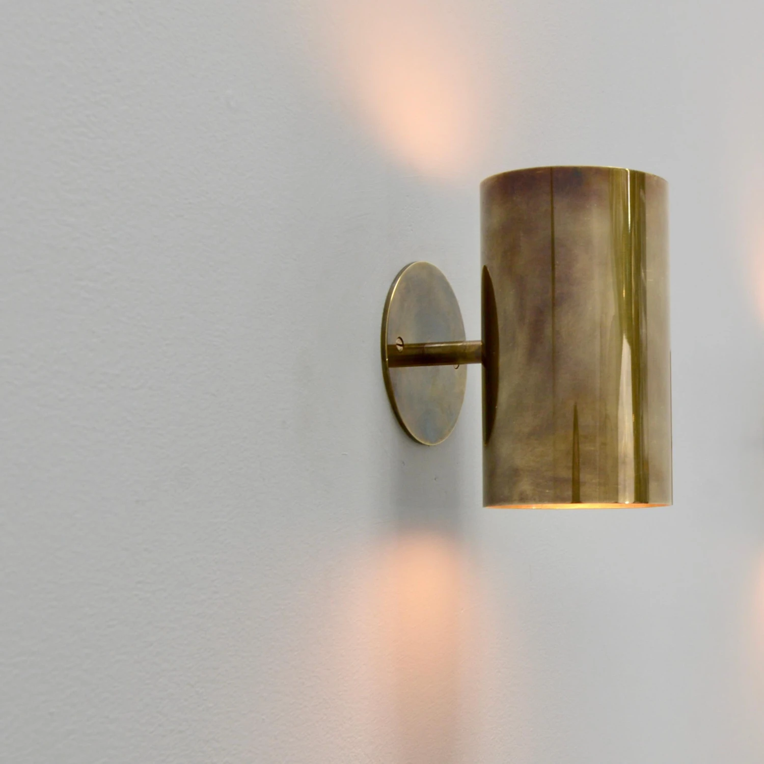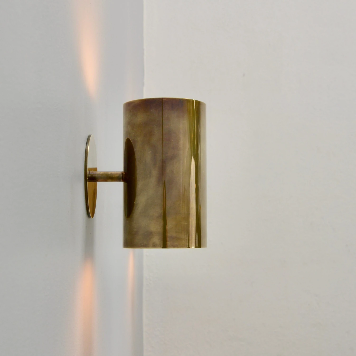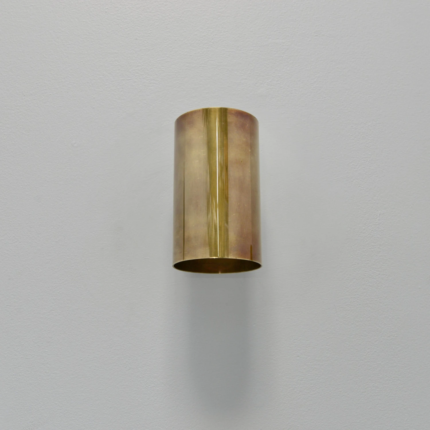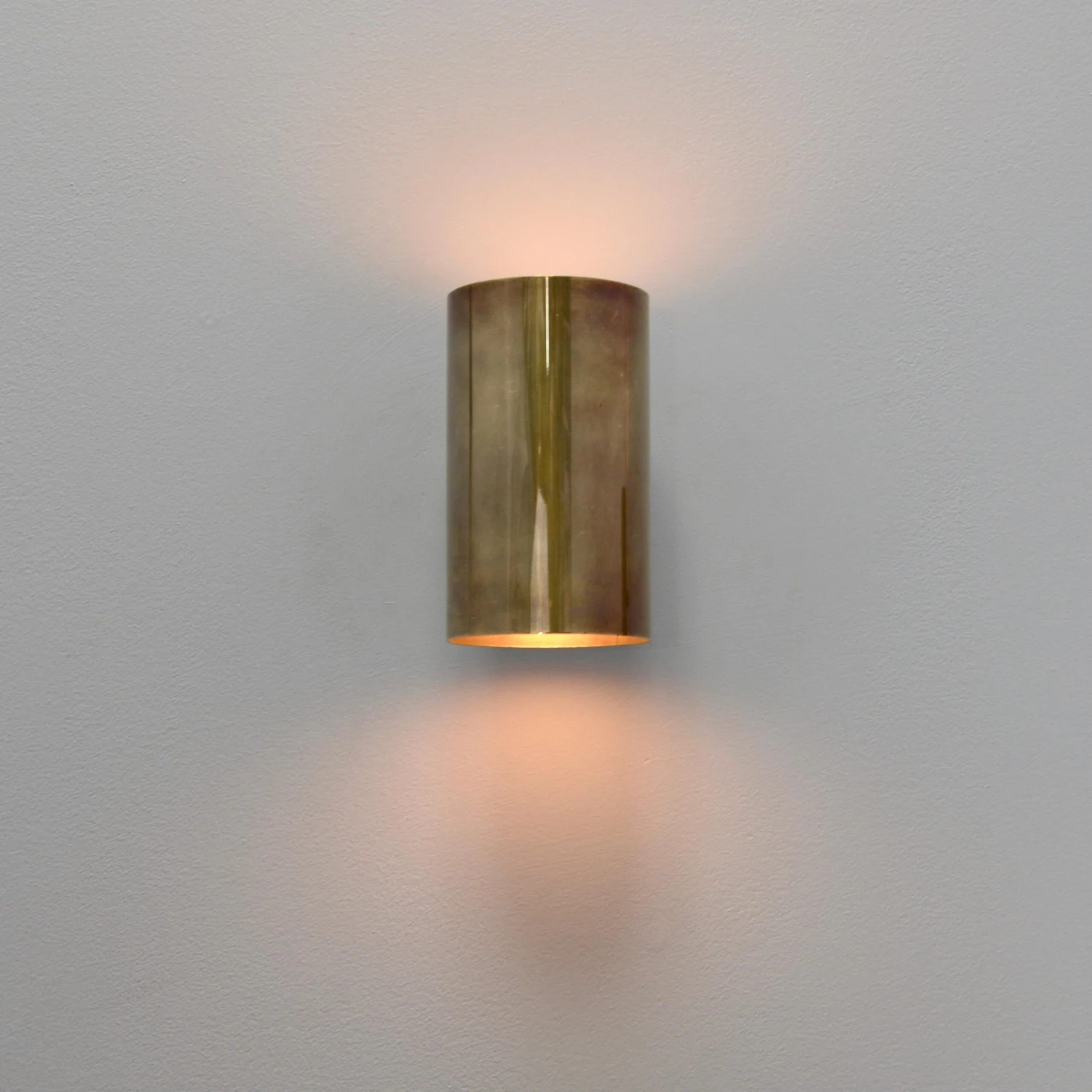 The stunning LUte sconce by Lumfardo Luminaires is an up and down fixed cylindrical wall sconce in unlacquered patinated brass or unlacquered gold finish. An all brass fixture, with illumination emitting from the top and from the bottom of the cylinder, the Lub FX Sconce is made in the USA and is part of our contemporary collection. Multiples available for order. Can be wired for use anywhere in the world. (2) E26 medium based lightbulbs included with order.