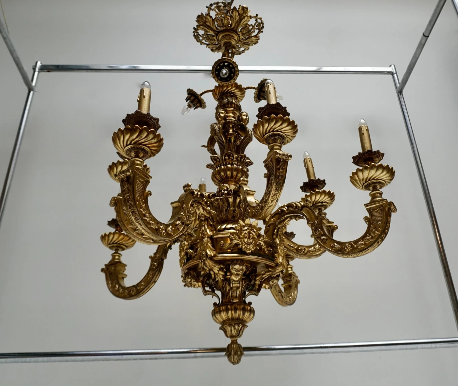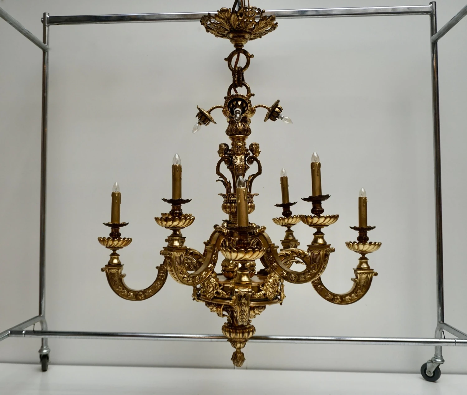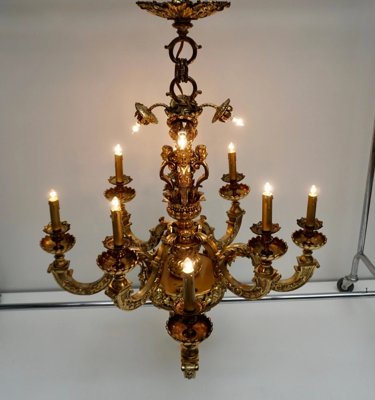 A spectacular and important bronze chandelier, a so called “Lustre Mazarin”, of superb quality, with 8 arms and above these, 4 lights and in the middle of the balluster 4 heads on scrolls , and underneath 4 angel-heads. The chandelier dates from the end of the 18th-beginning of the 19th century, its origin is France.