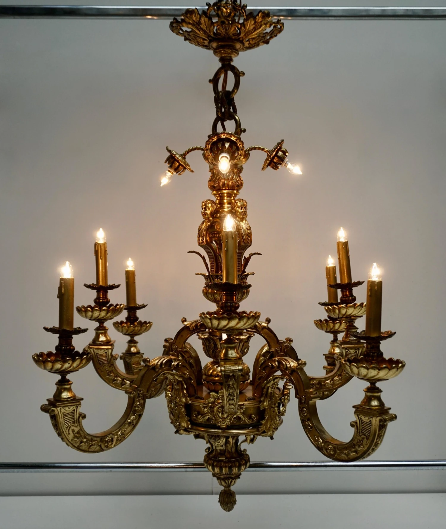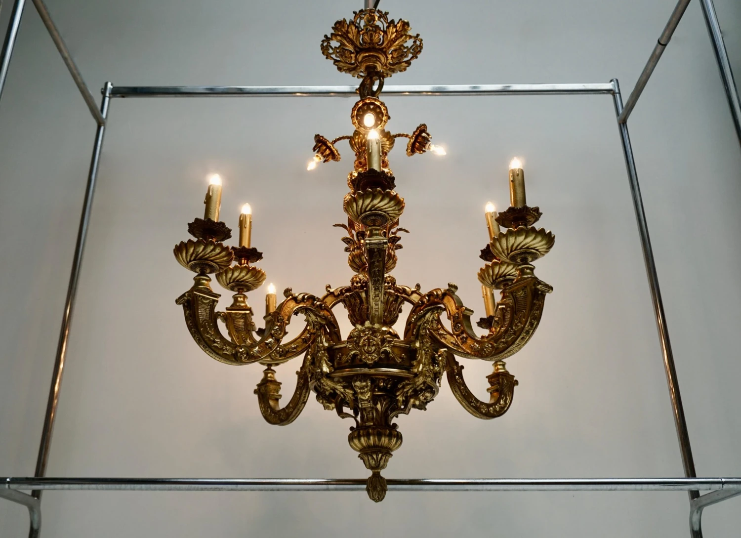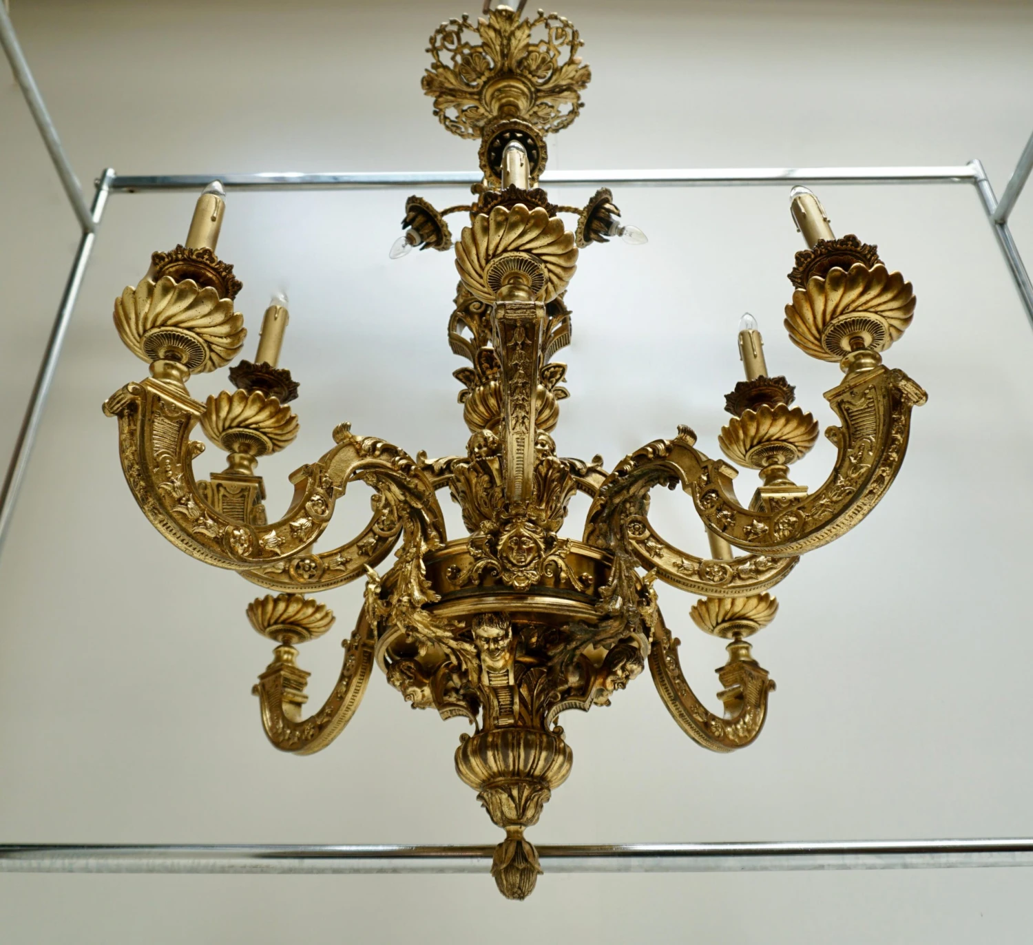 A spectacular and important bronze chandelier, a so called “Lustre Mazarin”, of superb quality, with 8 arms and above these, 4 lights and in the middle of the balluster 4 heads on scrolls , and underneath 4 angel-heads. The chandelier dates from the end of the 18th-beginning of the 19th century, its origin is France.