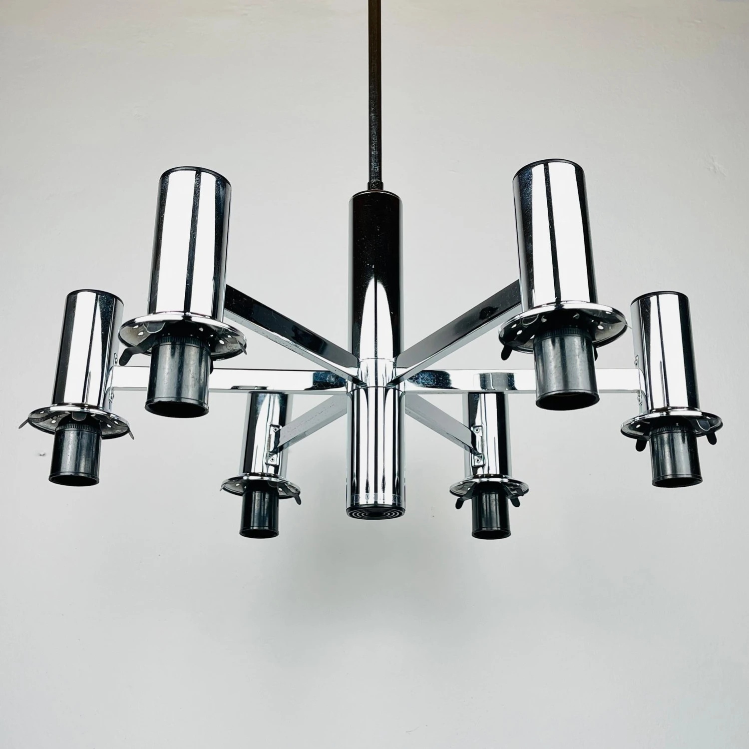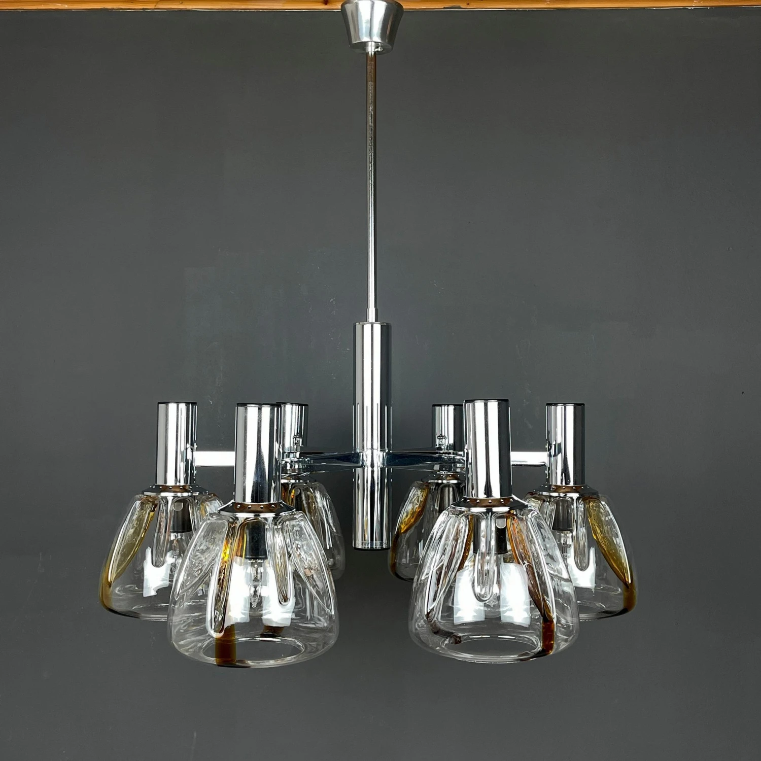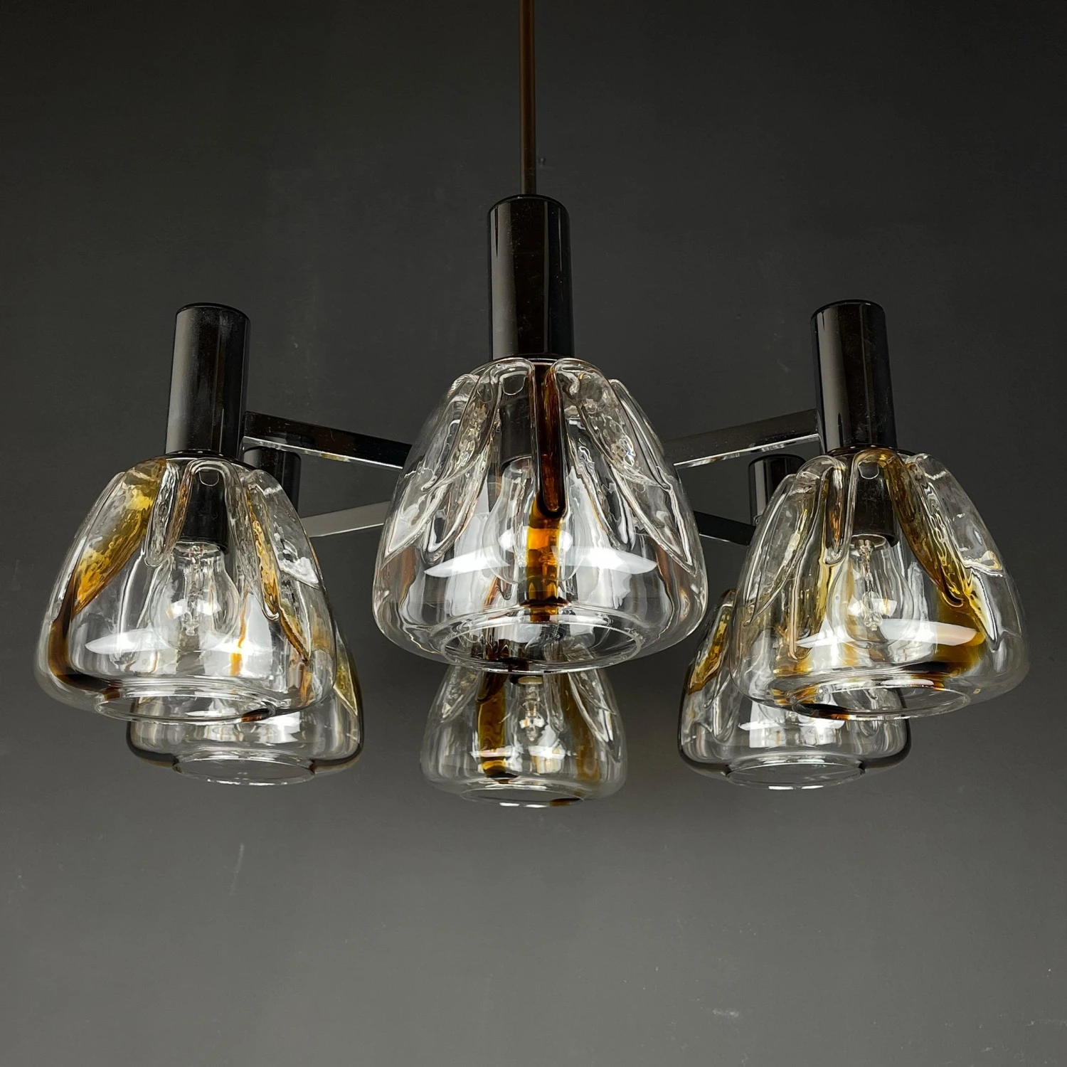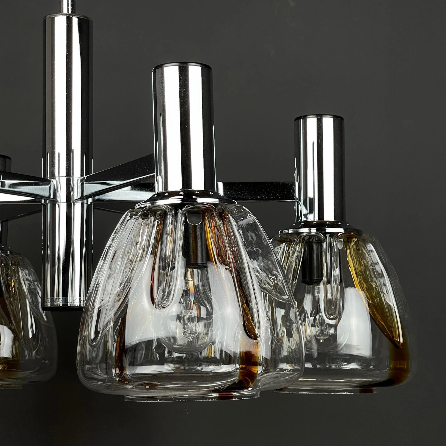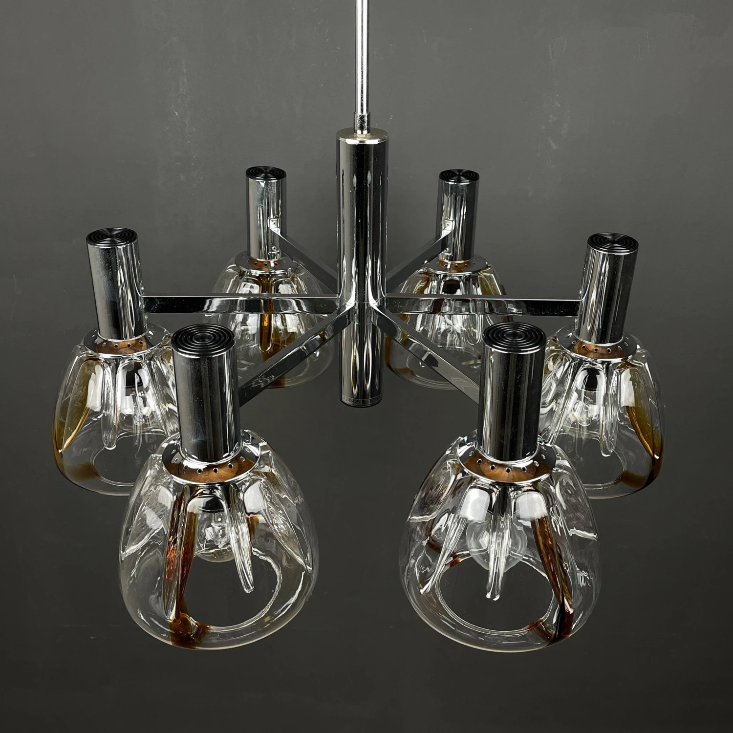 The very unusual chandelier by Targetti Sankey made in Italy in the 1980s. The combination of Murano glass lampshades and metal construction gives this lamp an unusual look. Allows you to place it in a wide variety of designer interiors. The chandelier is in very good vintage condition. Suitable for all countries in the world. The wiring has been checked and replaced by a professional electrician. Requires 6x E27 bulbs. The lamp has an original label. One of the 6 holders is missing one tab for attaching the glass shade. But this does not affect the quality of the fastening of the glass shade.