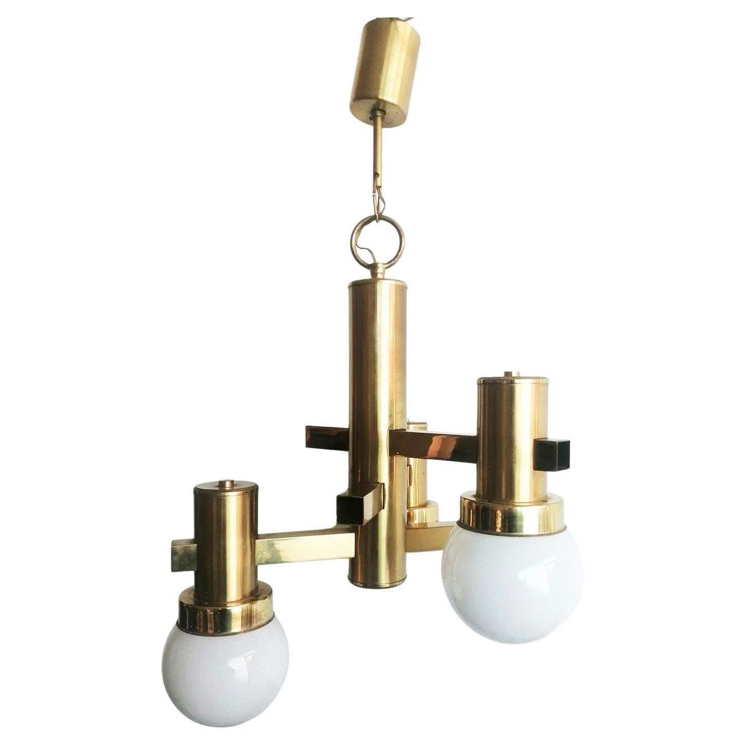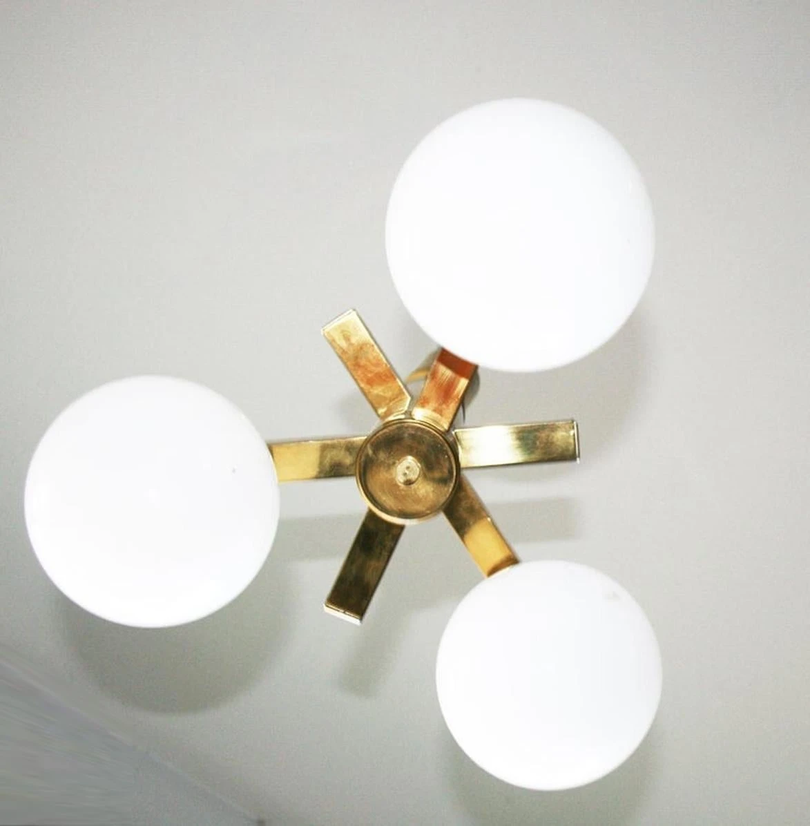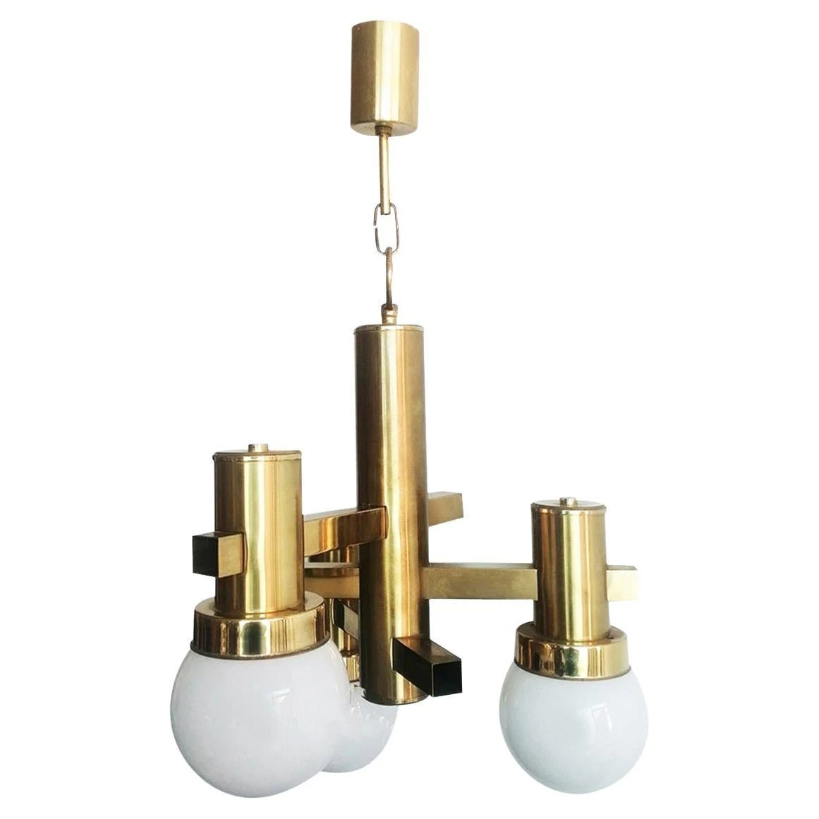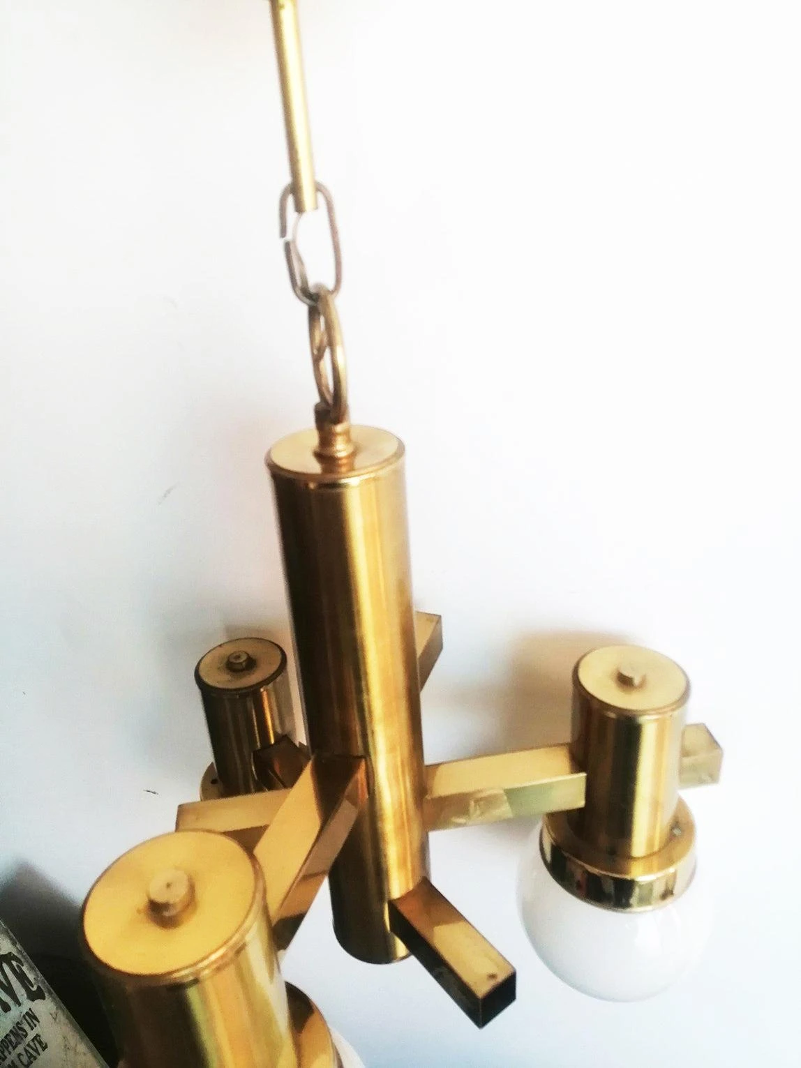 Made of golden brass-type metal, it is a lamp with geometric pieces very dle Space age style and Sciolari lamps and other European Midcentury manufacturers. It is finished with 3 Round tulips and opal glass