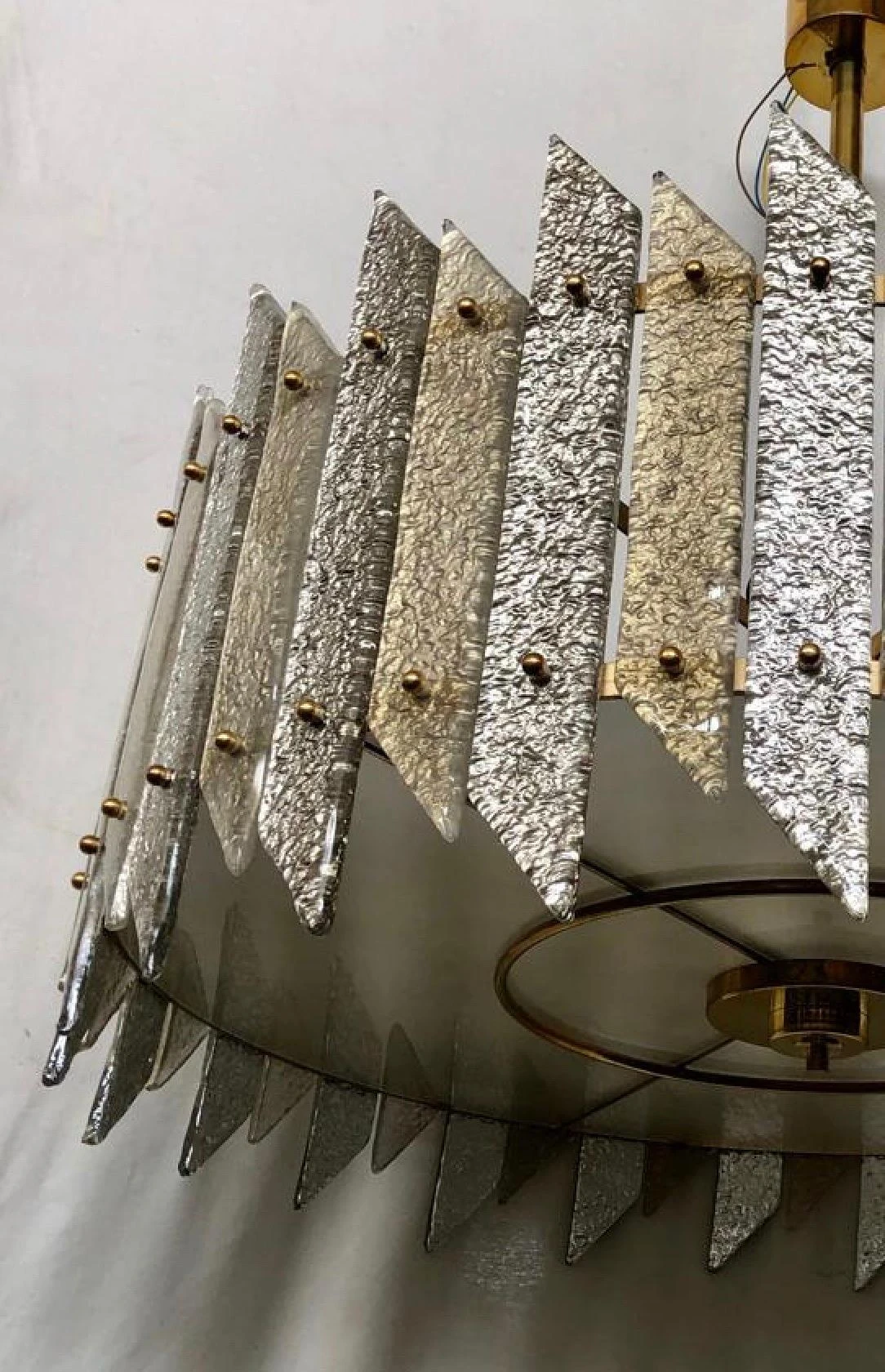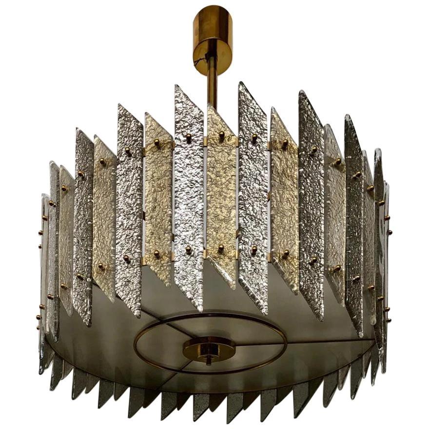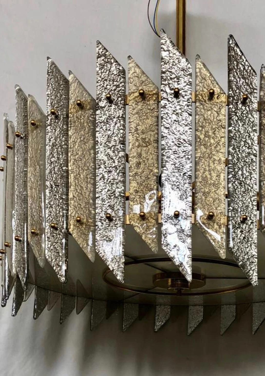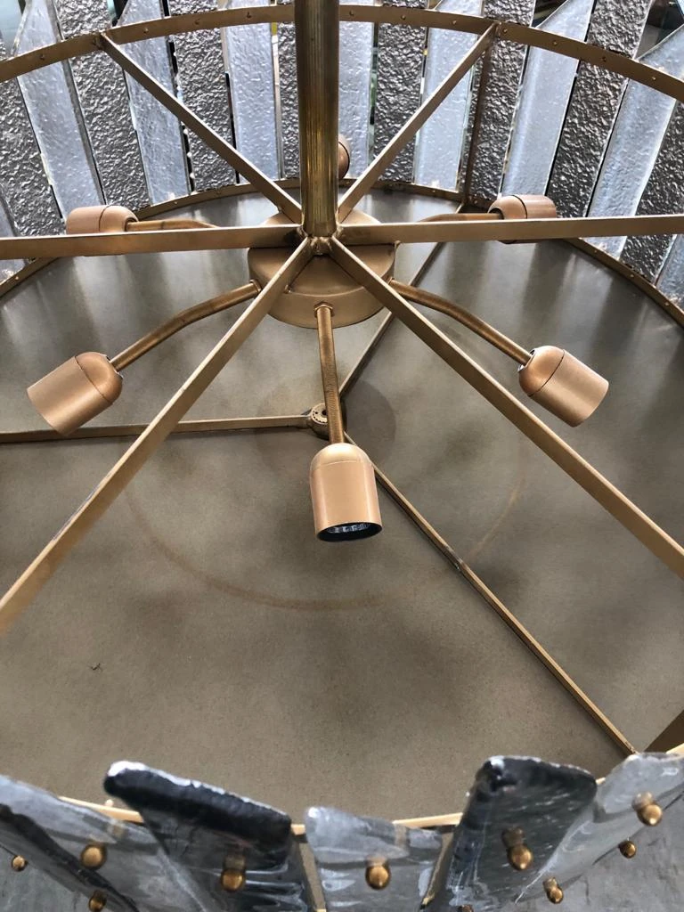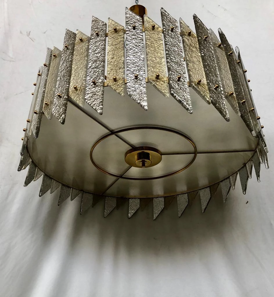 Its structure is round and made of iron colored in gold, with specially cut and colored slides positioned all around the perimeter, fixed with brass pin. The glass slides are alternate between a long and a short one. There are also brass finishes. Below, to close the drum there is a round glass also sandblasted and stopped with brass finishes. Above it is attached to the ceiling by a brass tube with a nice canopy. The shape is that of a flattened drum. A sort of very elegant ceiling light.
