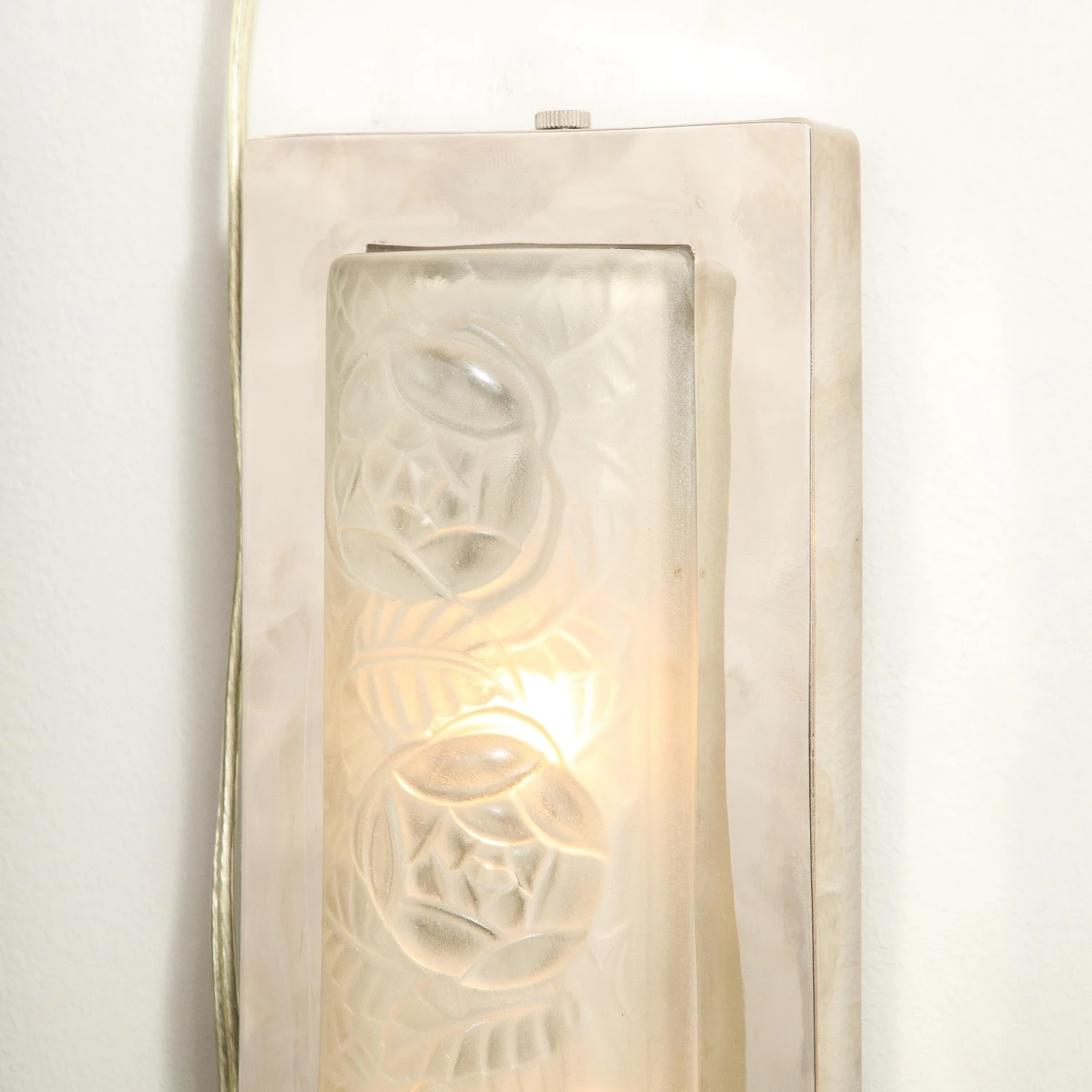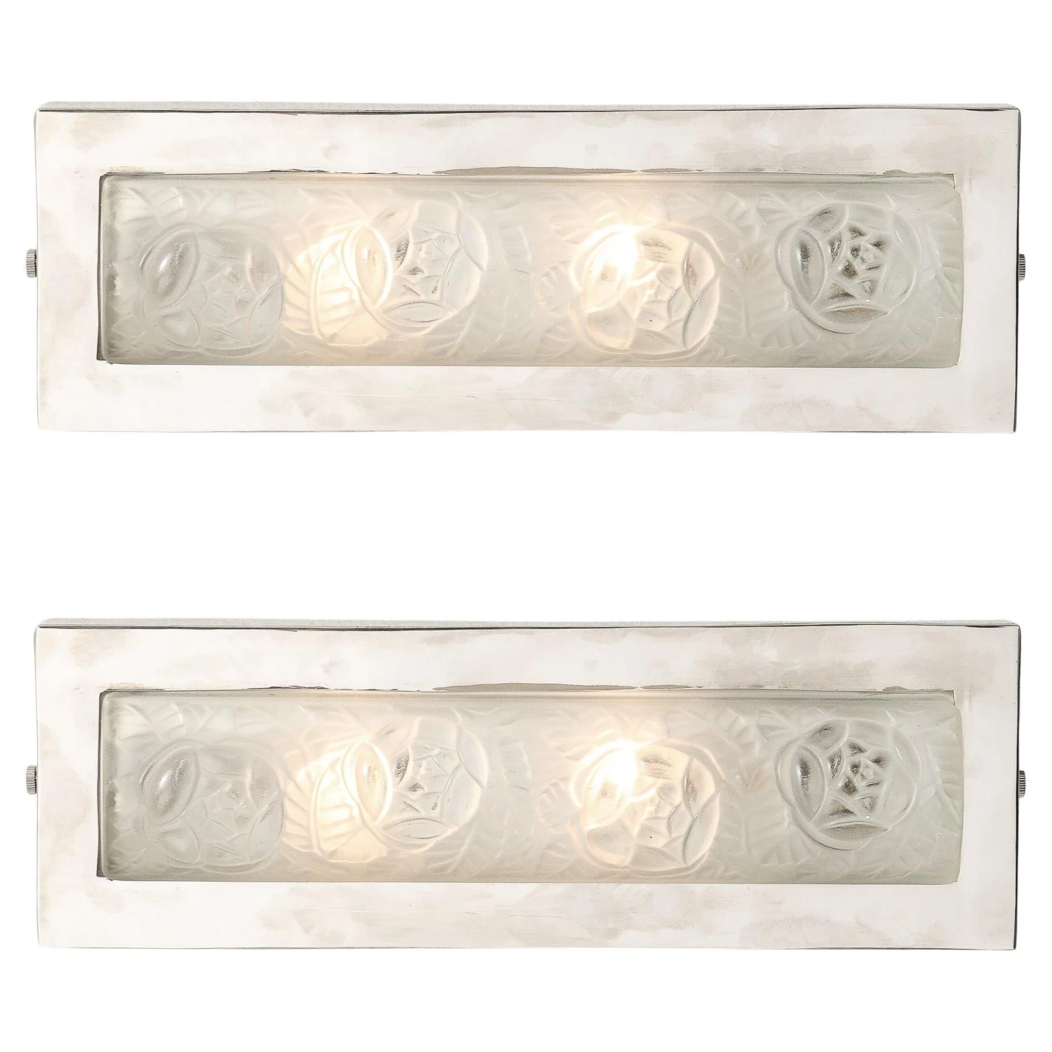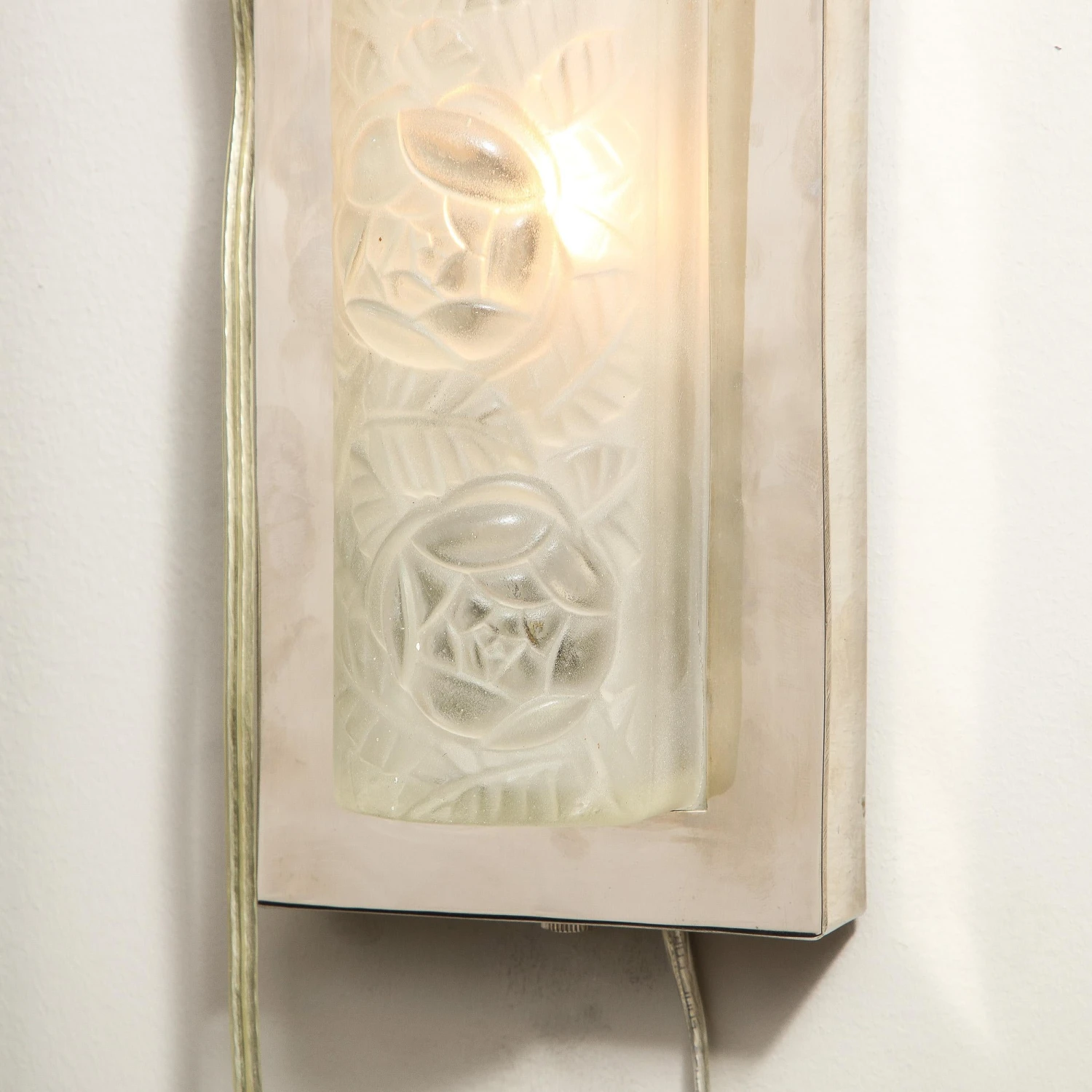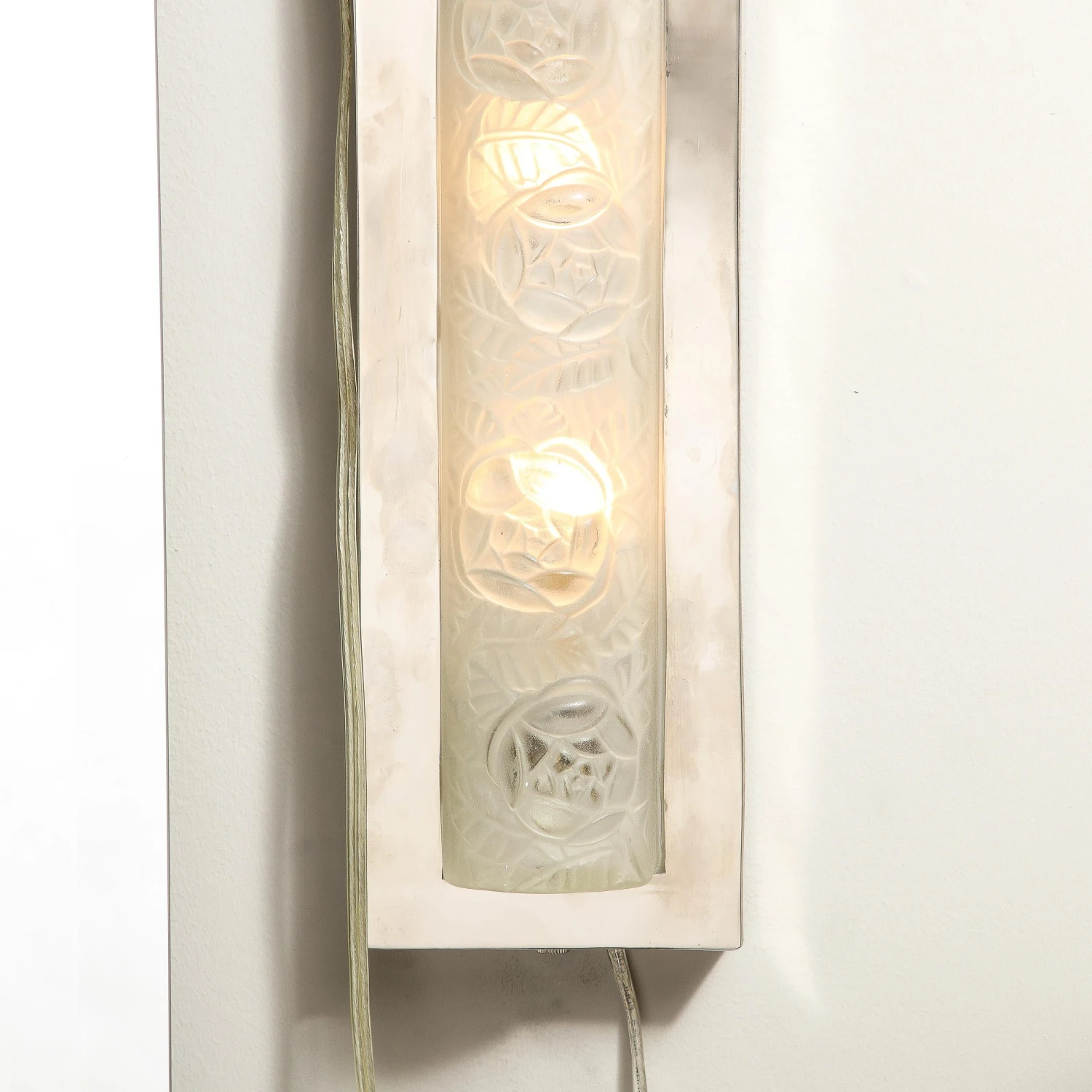This stunning pair of Art Deco vanity lights were realized in France circa 1930. They feature volumetric rectangular bodies with polished chrome surrounds and frosted glass interiors. The frosted glass is decorated with cubist stylized roses in dramatic relief. The delicacy and sweetness of the rose motif is counterbalanced by the hard geometric lines of the sconce bodies, creating an electric and dynamic tension. Their clean modernist lines and beautiful craftsmanship make these vanity lights as versatile as they are aesthetically compelling, blending perfectly with every style of interior from classic Deco to contemporary. They have been newly rewired to American standards and are in excellent vintage condition.