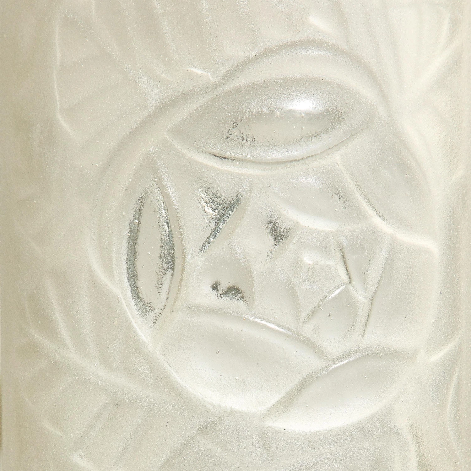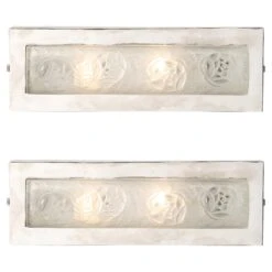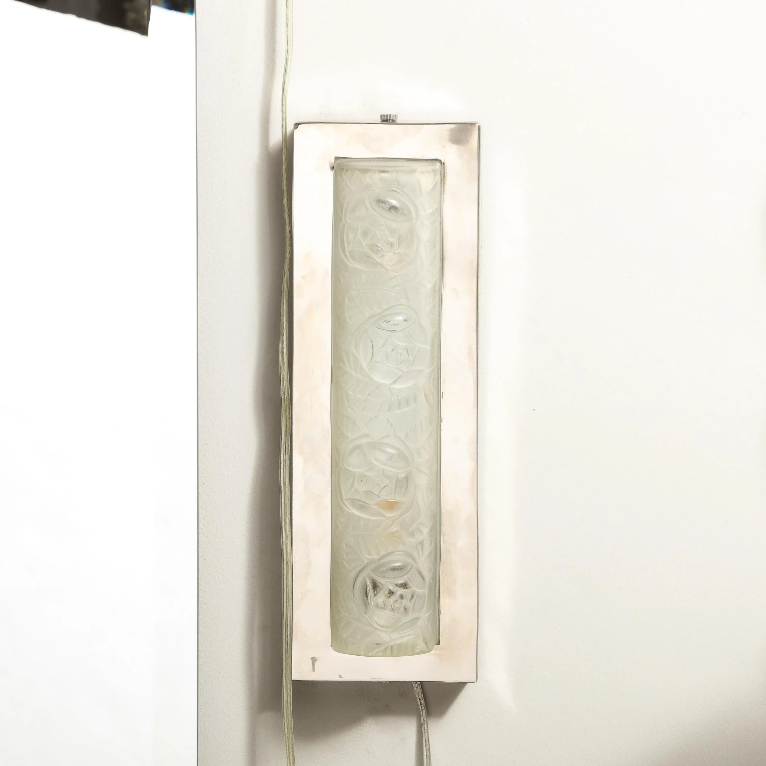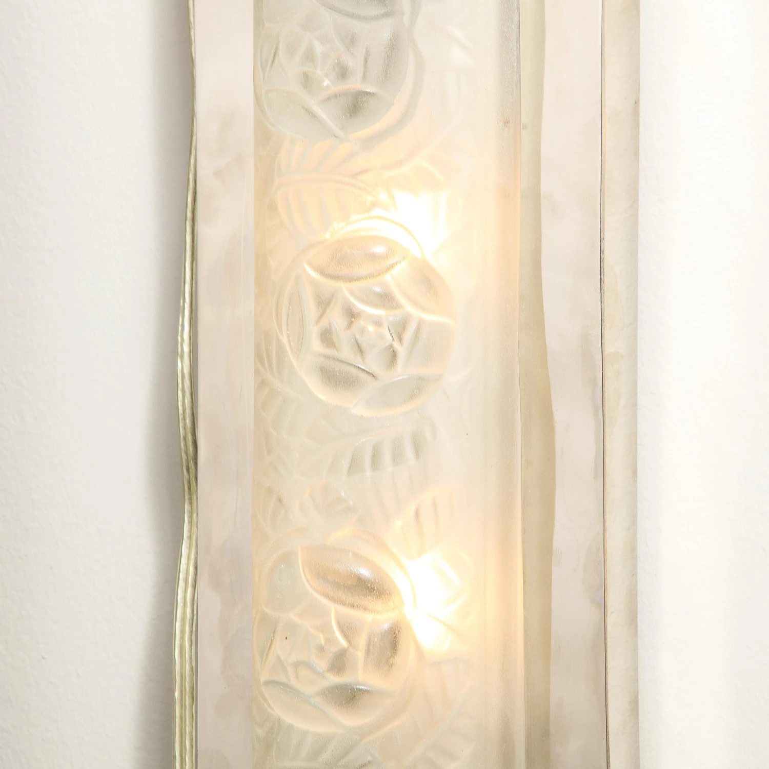 This stunning pair of Art Deco vanity lights were realized in France circa 1930. They feature volumetric rectangular bodies with polished chrome surrounds and frosted glass interiors. The frosted glass is decorated with cubist stylized roses in dramatic relief. The delicacy and sweetness of the rose motif is counterbalanced by the hard geometric lines of the sconce bodies, creating an electric and dynamic tension. Their clean modernist lines and beautiful craftsmanship make these vanity lights as versatile as they are aesthetically compelling, blending perfectly with every style of interior from classic Deco to contemporary. They have been newly rewired to American standards and are in excellent vintage condition.