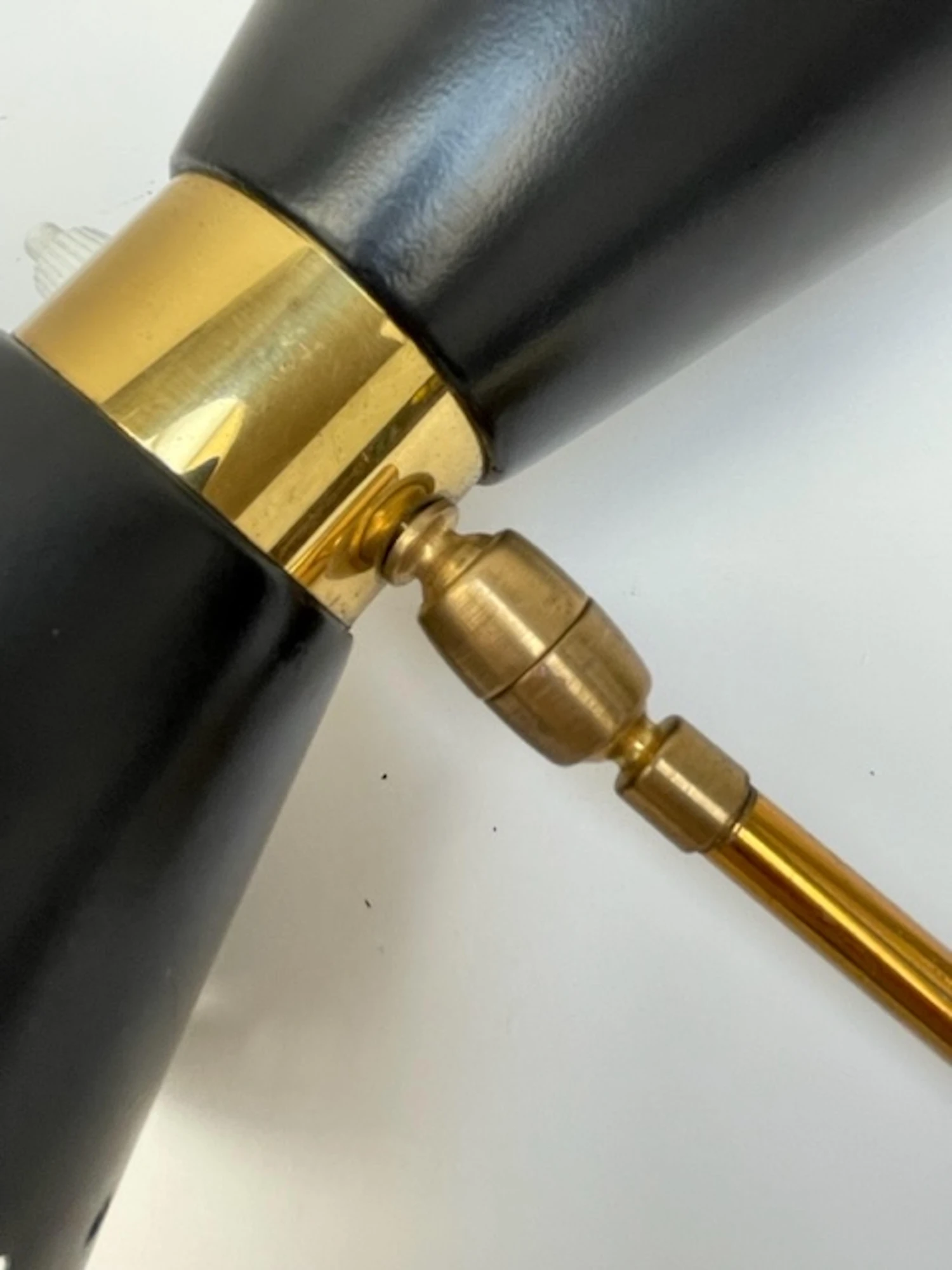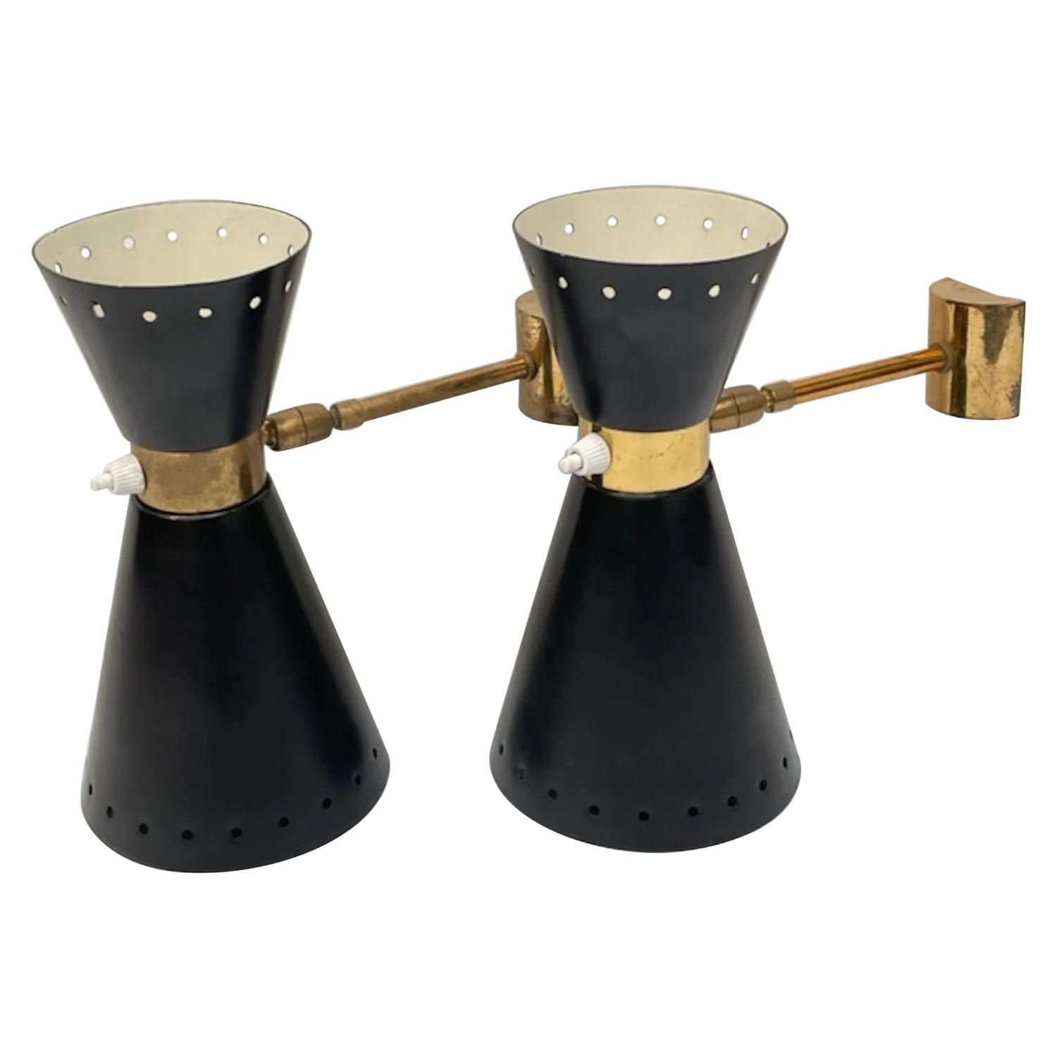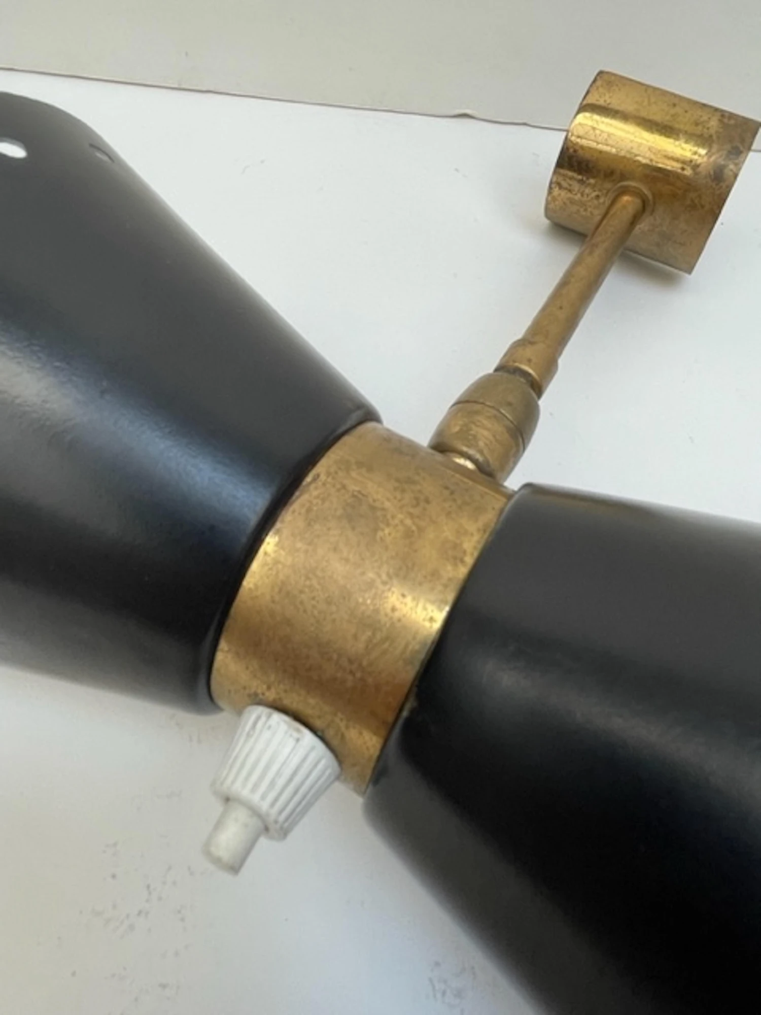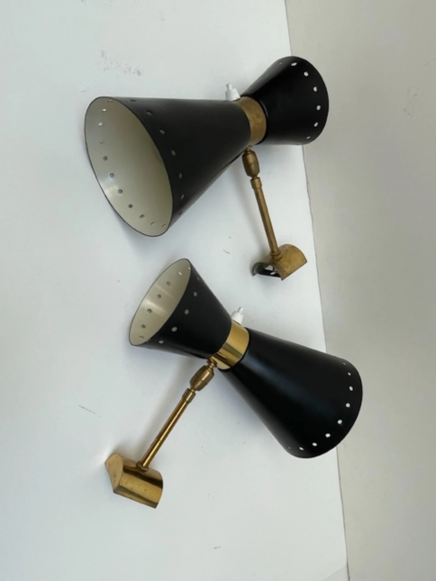 Pair of italian sconces from the 50s. The diffuser is on enameled metale black ouside e white inside. The sconces are orientable thanks to an articulated brass arm to be applied to the wall. This way the light can be directed everyware. Typical italian design from the 50s. The brass parts show signs of oxidation.