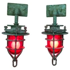 Original marine convoy lights from a ship , with red glass light and protective original solid bronze cage. porcelain socket for one 60/watt light.