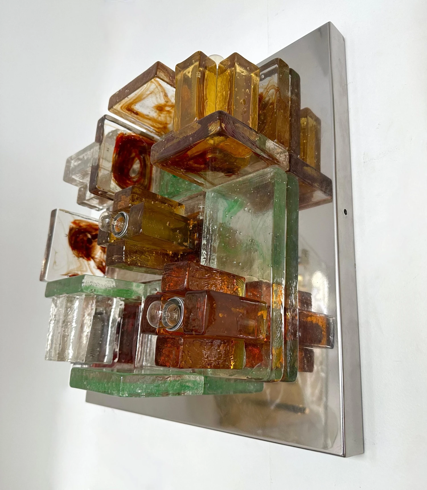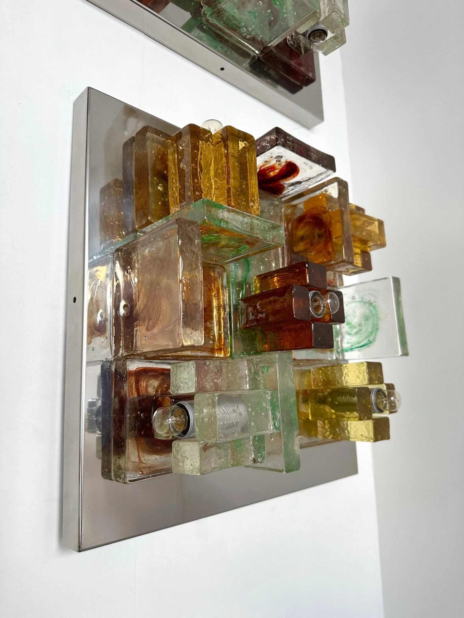 Rare pair of wall lights lamps lightning sconces. Thick hammered bubble colored geometry construction glass cube mounted on a metal stainless steel backplate by the manufacture Poliarte in Verona. Famous italian design like Biancardi and Jordan Arte, Longobard, Venini, Vistosi, La Murrina, Aldo Carlo Nason for Mazzega Murano, Toni Zuccheri for VeArt, Stilnovo, Joe Colombo, Arteluce, Arredoluce, Lumi, Luci, Rggiani, Sciolari, Werner Pantone, Luigi Colani, RAAK, Angelo Lelii, Francesco Bocola, Superstudio, Enrico Tronconi, Mario Bellini, Harvey Guzzini, Luigi Massoni, Martinelli, Pierre Cardin, Fabio Lenci, Gio Ponti, Francesco Buzzi Ceriani, Fontana Arte, Artemide, Arteluce, Arredoluce, Luigi Caccia Dominioni, Willy Rizzo, Mario Sabot, Azucena.