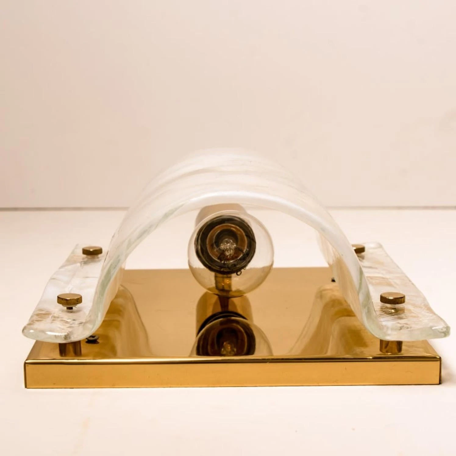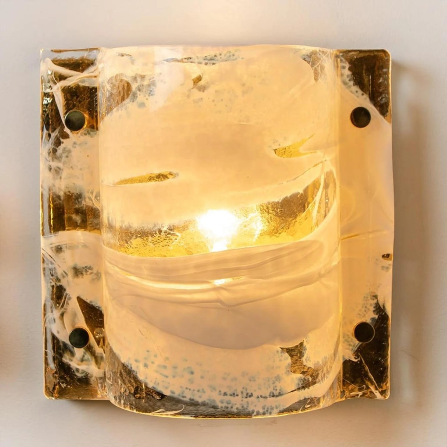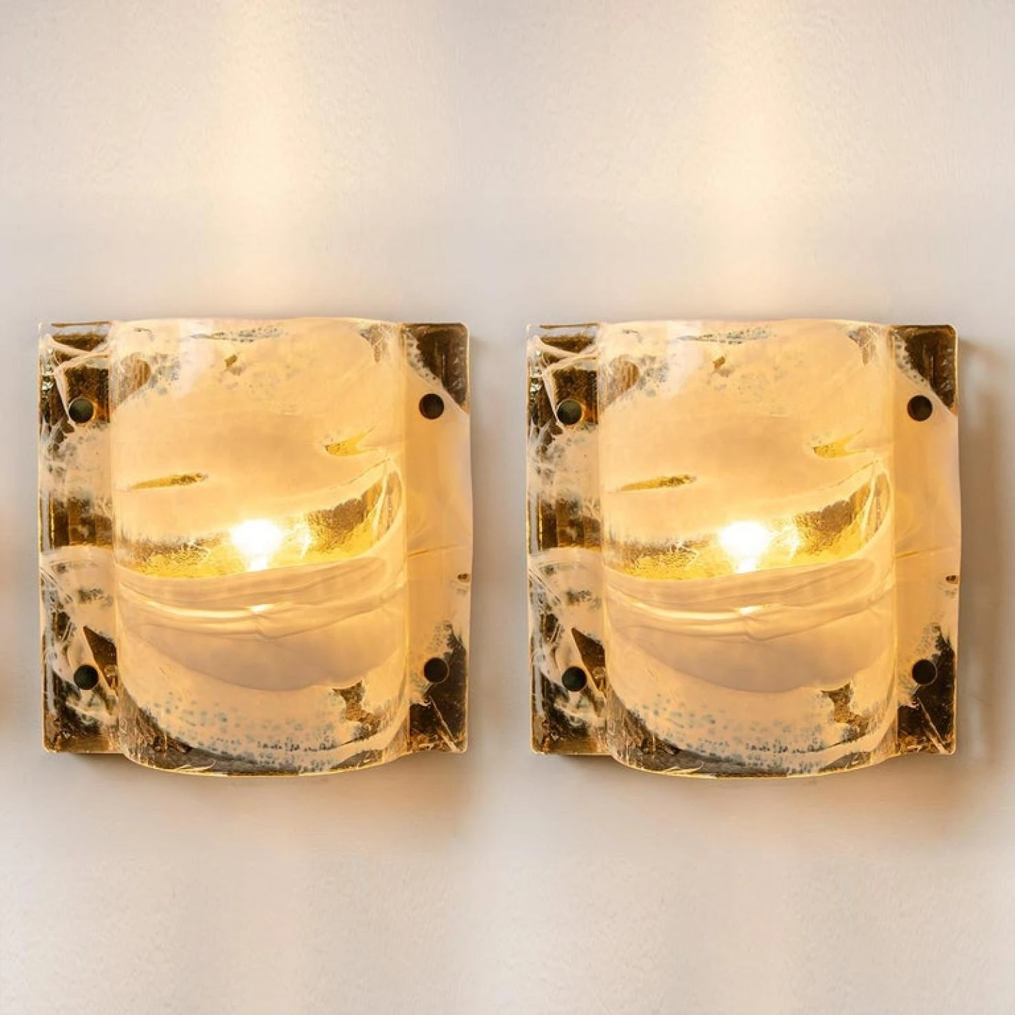 Pair of of elegant J.T. Kalmar sconces featuring thick white and clear swirl glass on a gilded brass base. Minimalistic design executed with a taste for excellence in craftsmanship. Illuminates beautifully.