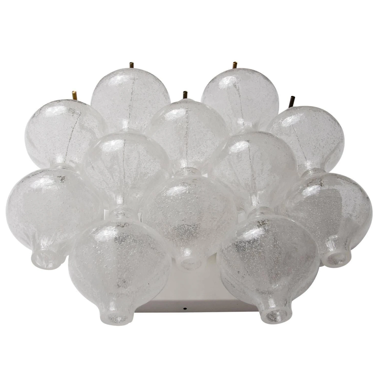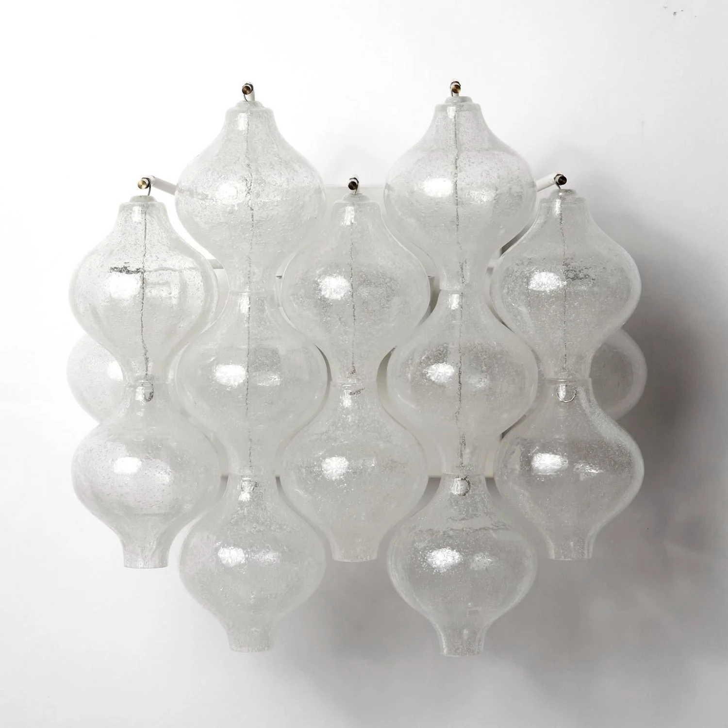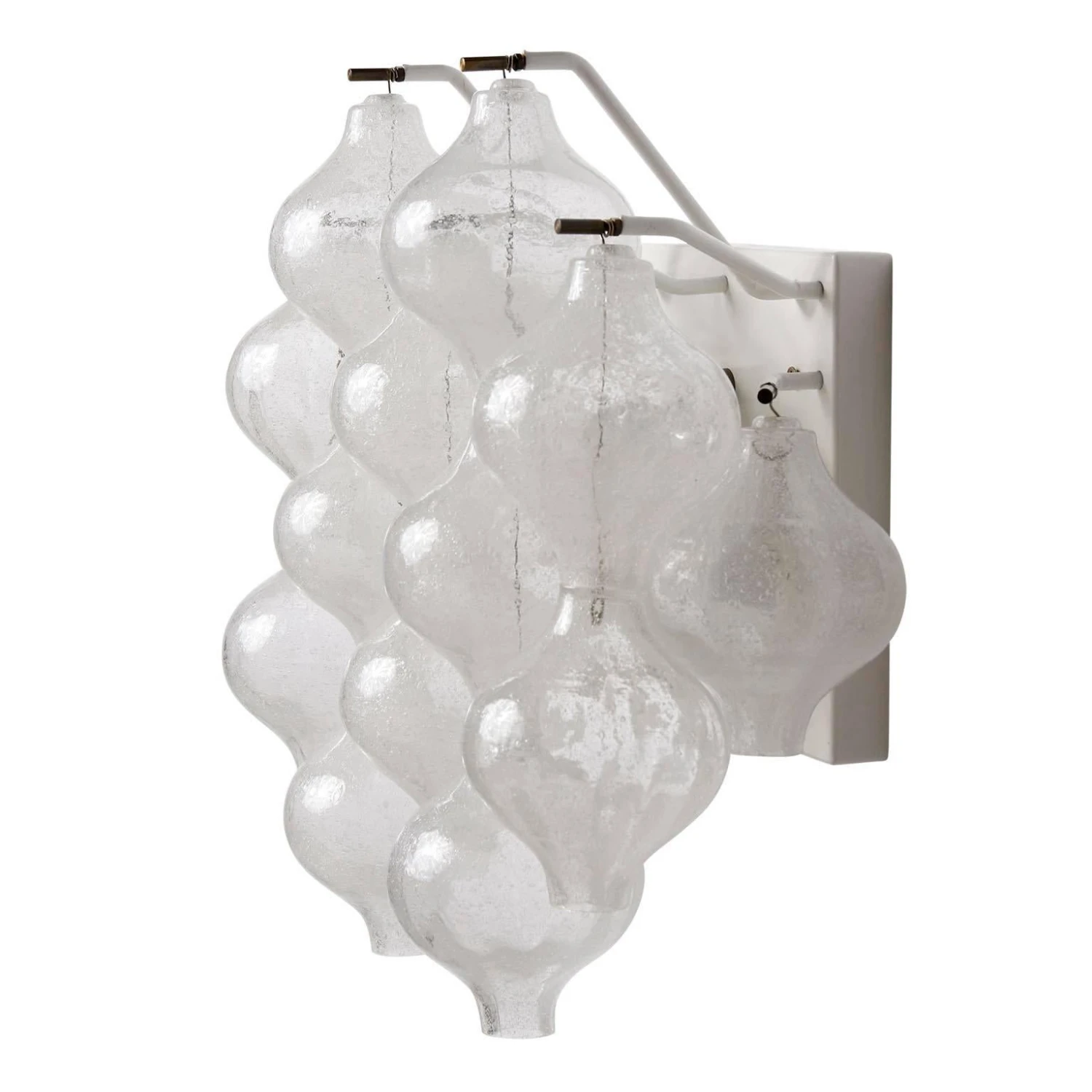 The name Tulipan derives from the tulip shaped handblown bubble glasses. Each glass is handmade and therefore a unique piece. A sconce is made of a white enameled metal frame which holds 14 glass pieces with brass bolts.