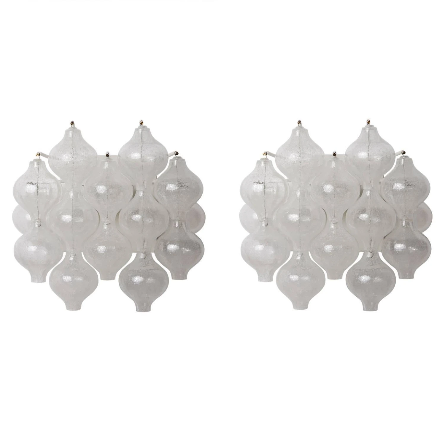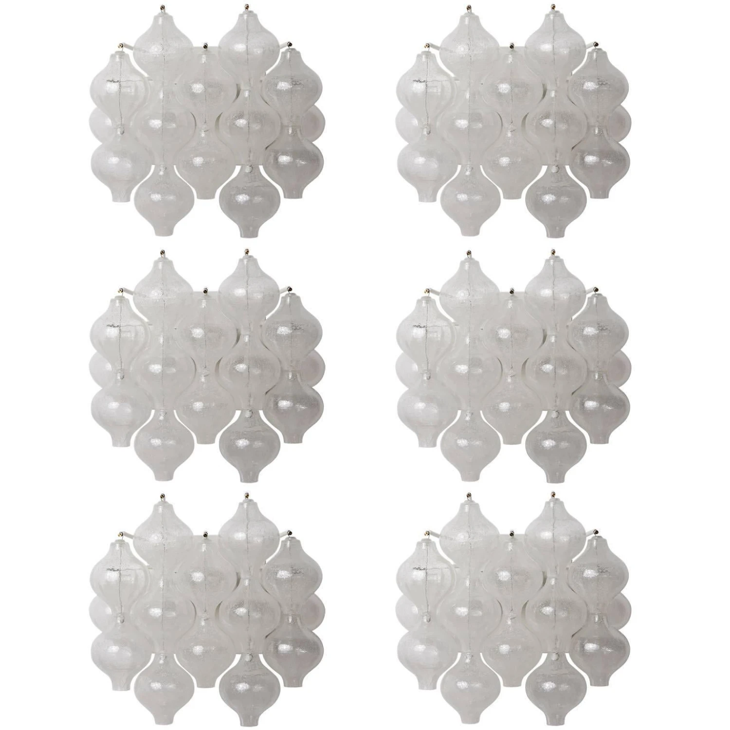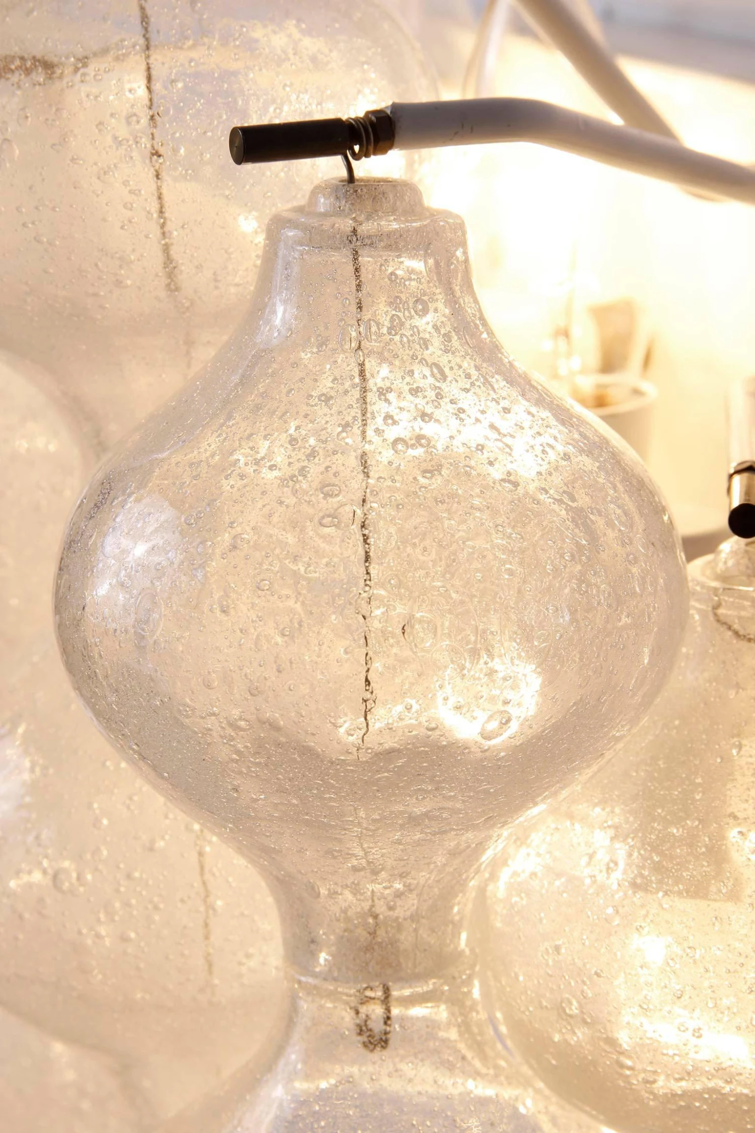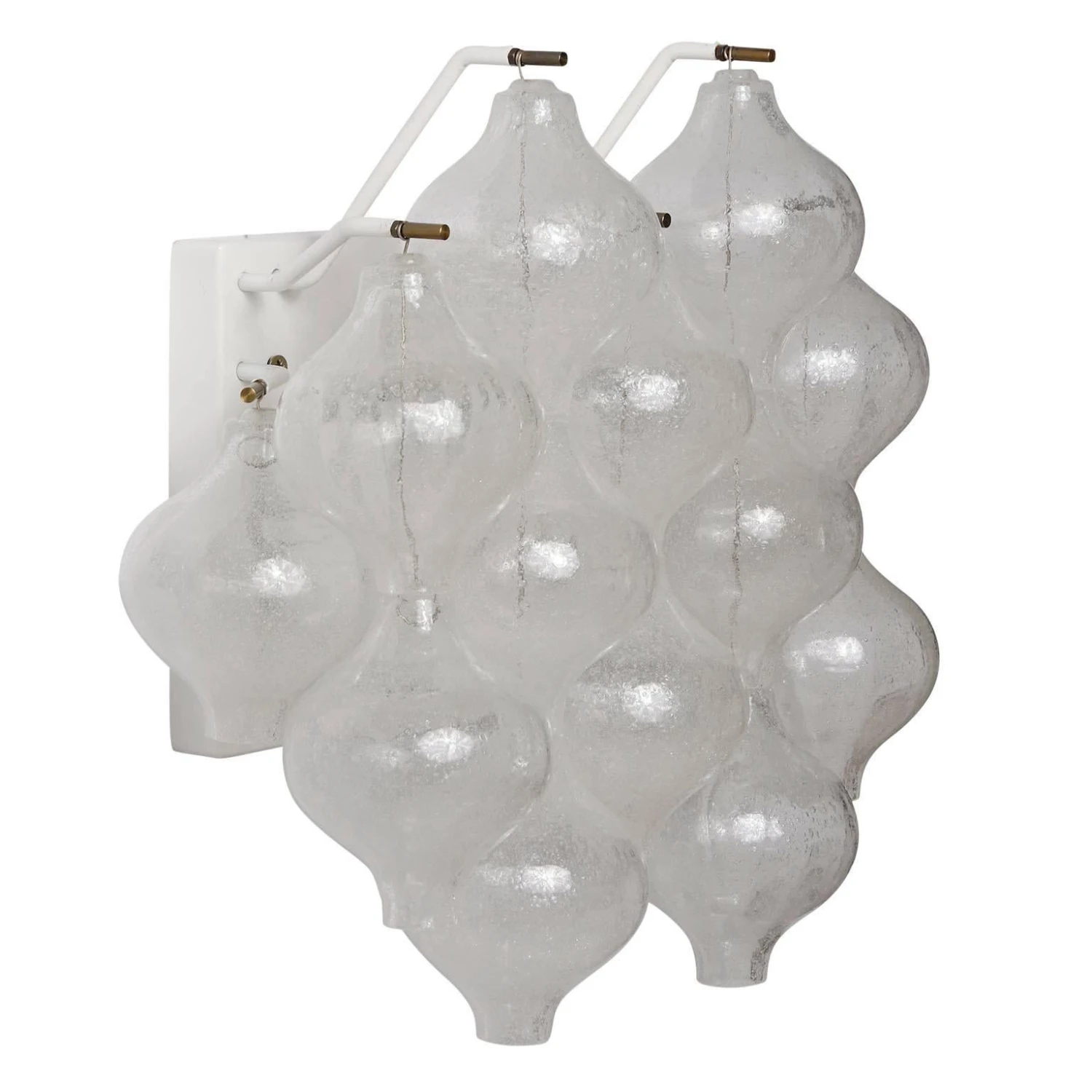 The name Tulipan derives from the tulip shaped handblown bubble glasses. Each glass is handmade and therefore a unique piece. A sconce is made of a white enameled metal frame which holds 14 glass pieces with brass bolts.