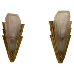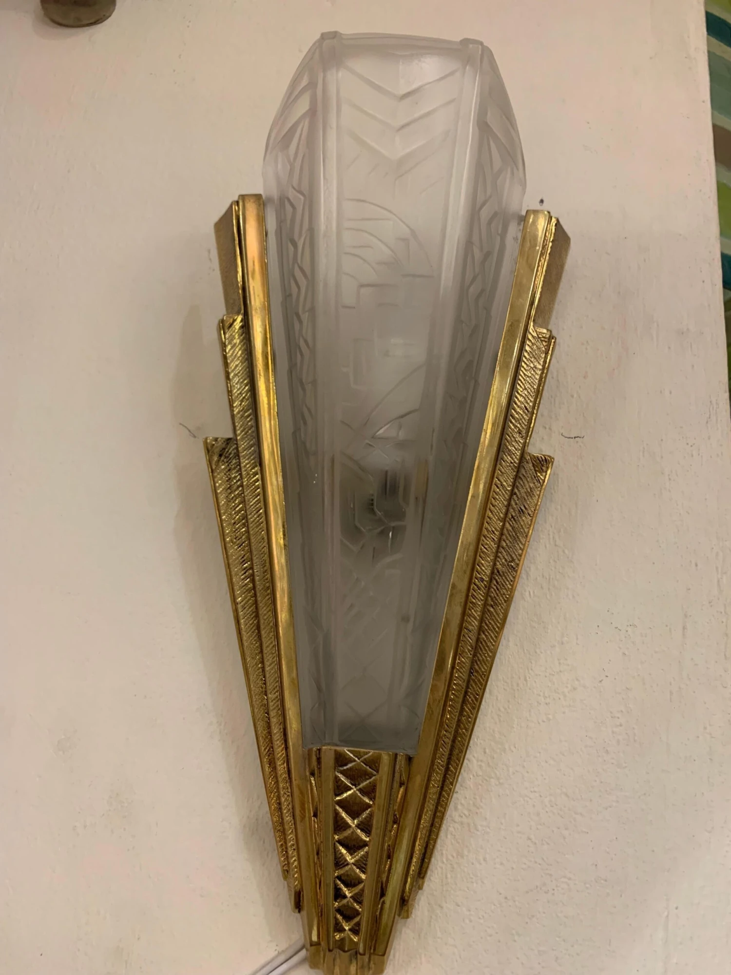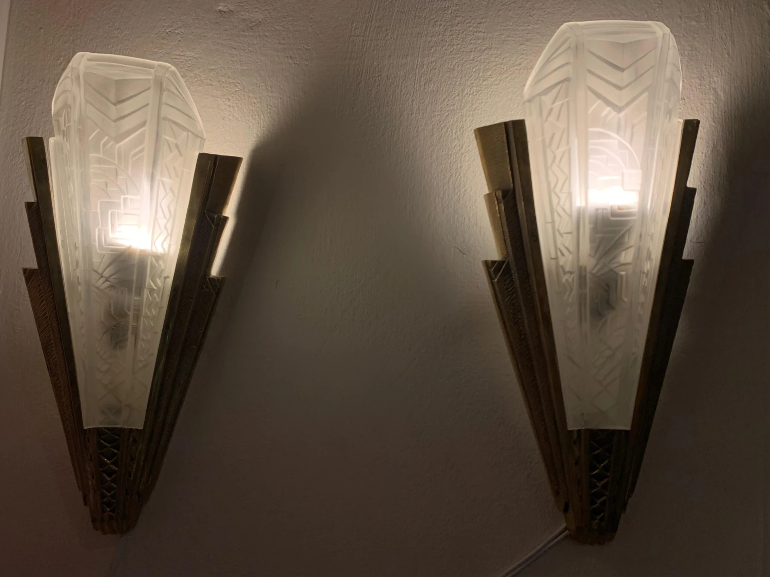 Gorgeous pair of vintage Art Deco sconces signed by Pierre Maynadier. They are in patinated brass and glass that was pressed and molded, typical of the mid-century creations. Both hardware and glass wear geometrical designs, also typical of the mid-century period. These sconces give a beautiful render whether they are lit or turned off.
