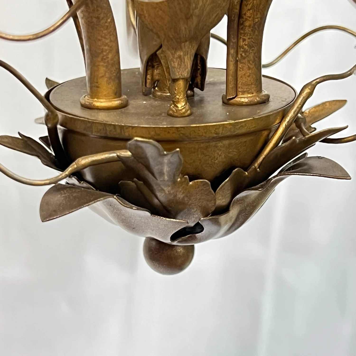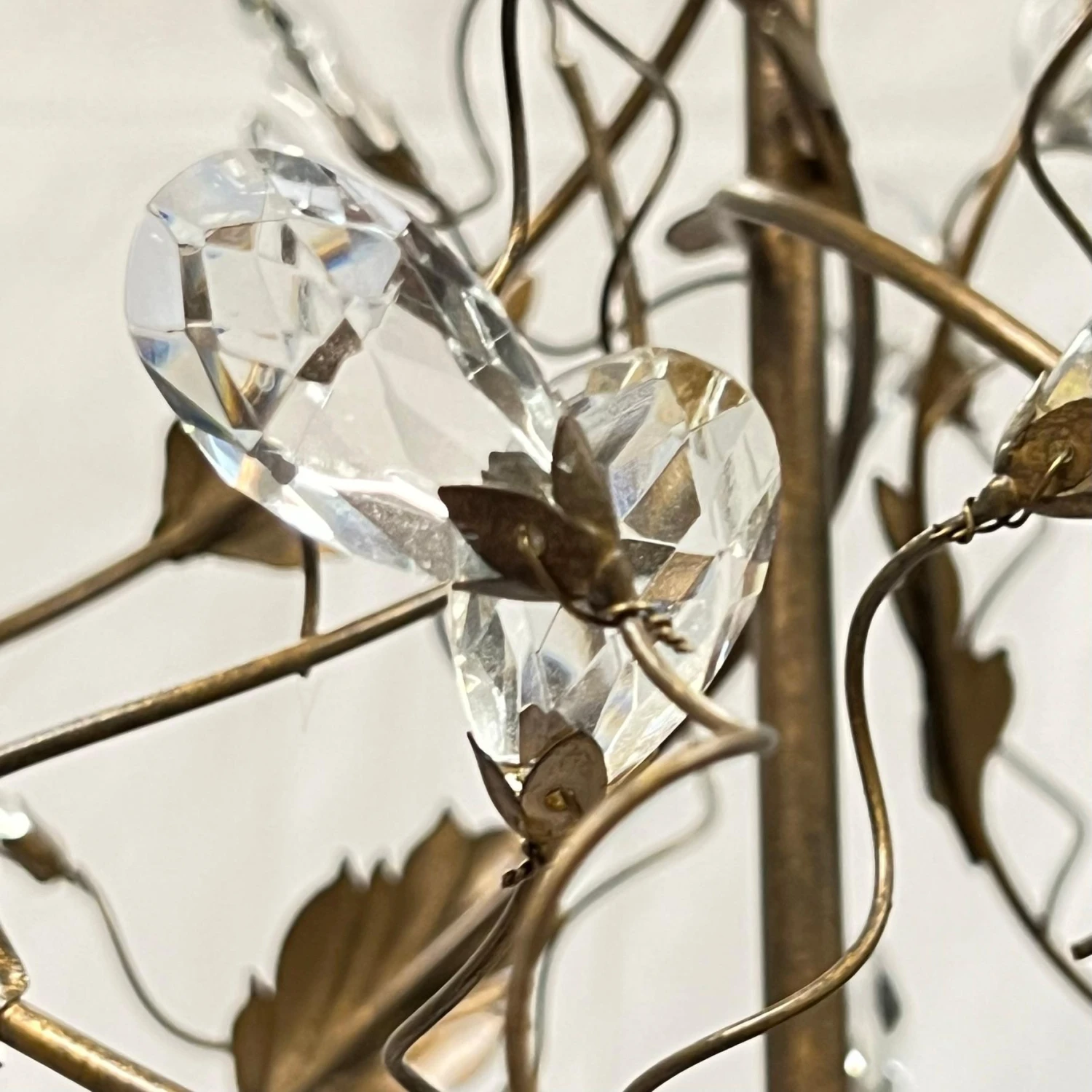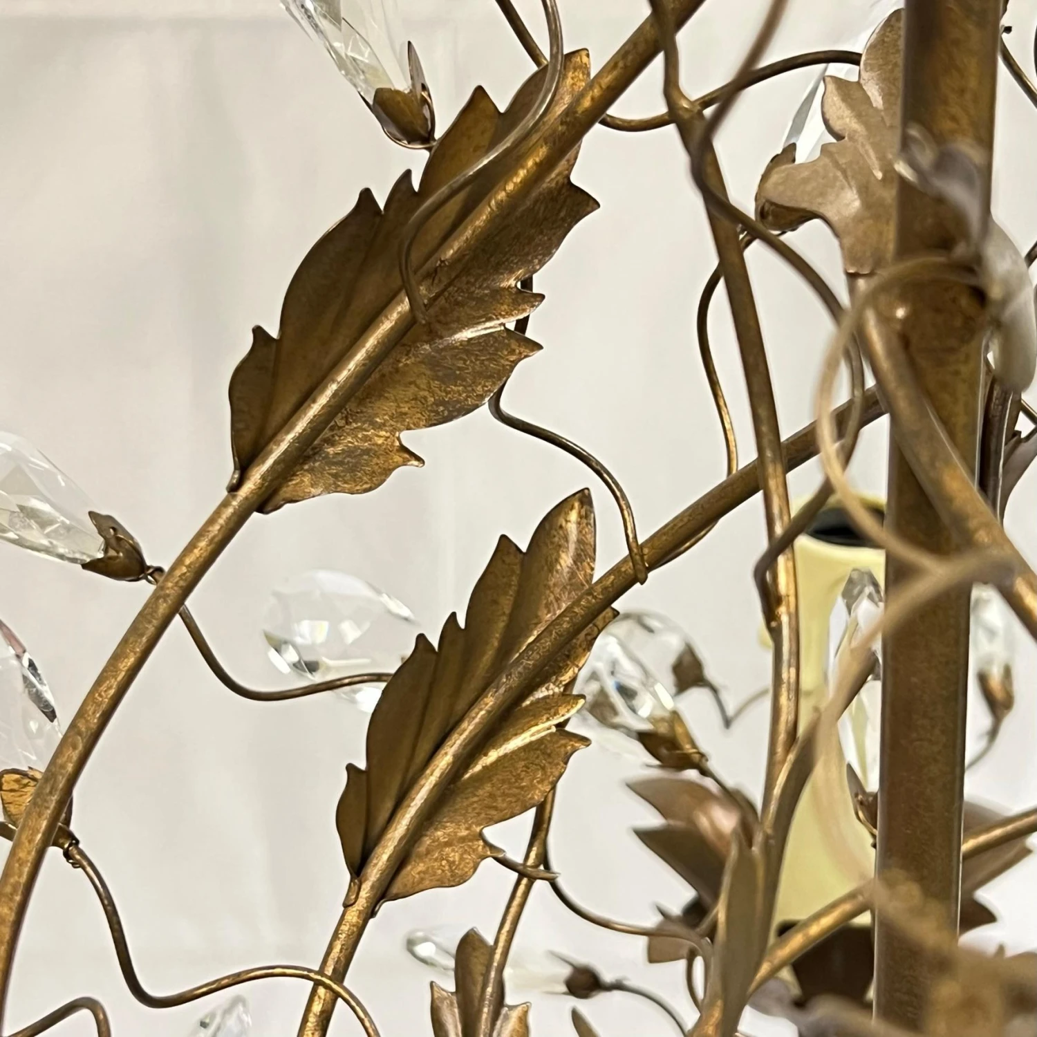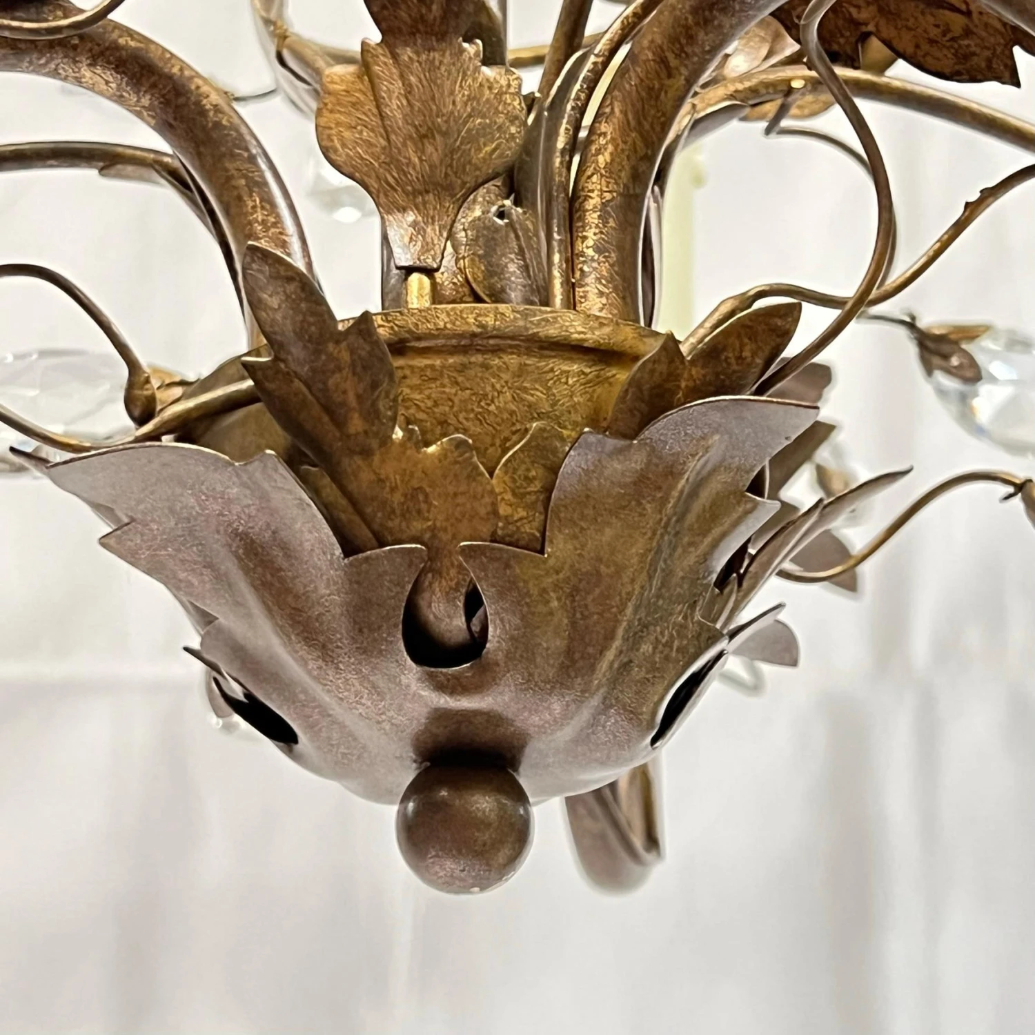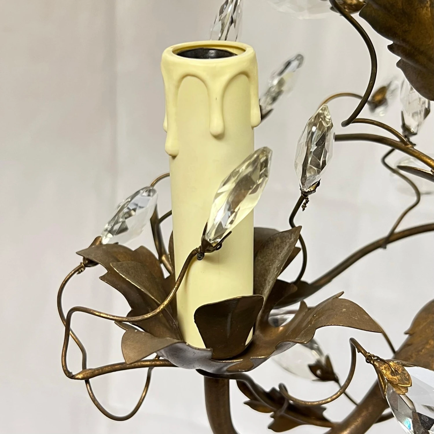 Pair of vintage patinated metal chandeliers in the Louis XV fashion with foliate design and faceted cut glass leaves and three sockets with faux candle covers. Ready for use.