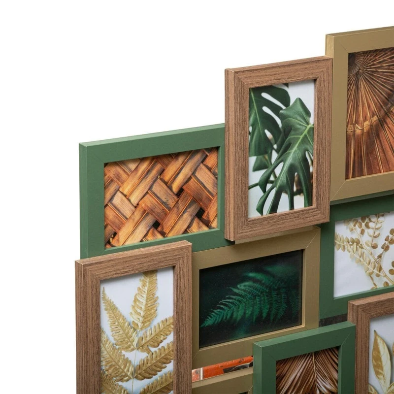 Dans des nuances vertes, naturelles et dorées, ce pêle-mêle convient pour des photos format 10×15 cm.