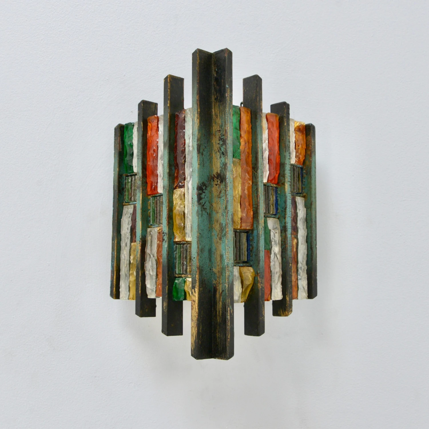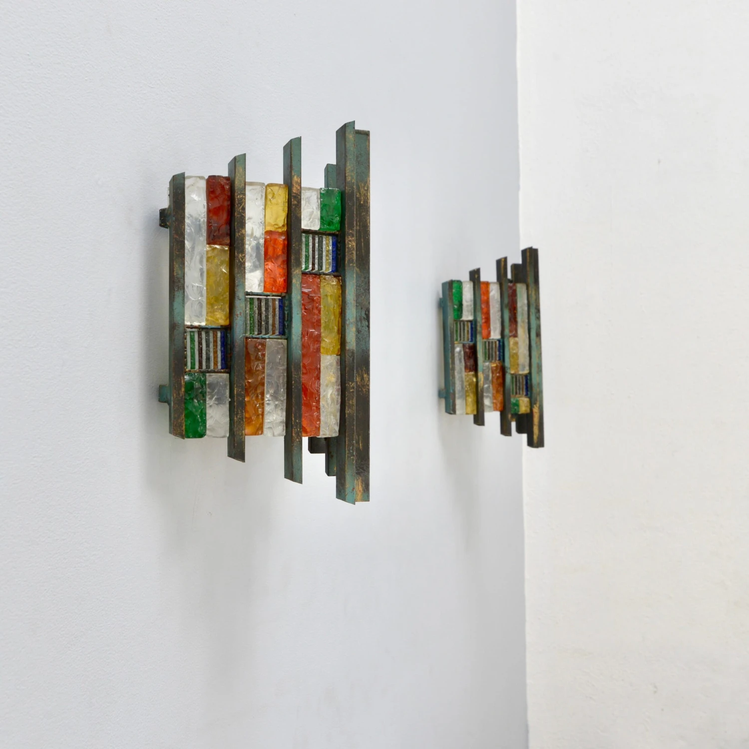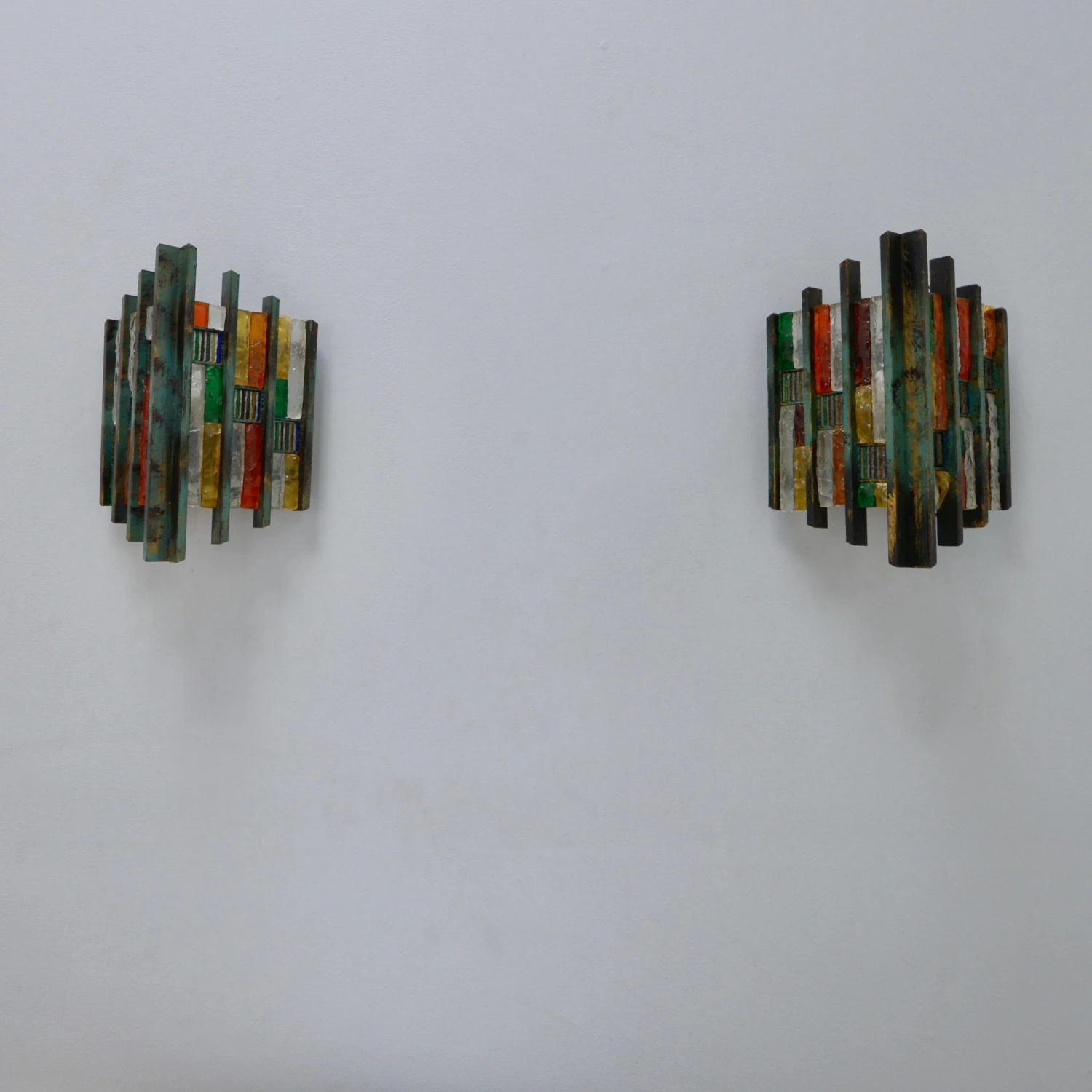 Pair of fantastic Brutalist glass Poliarte sconces from Italy of the 1970s. In multicolored glass and steel in original finish. Wired with a single E-26 medium based socket per sconce. These fixtures can be wired for any worldwide location. Light bulbs included with order. Sold and priced as a pair.