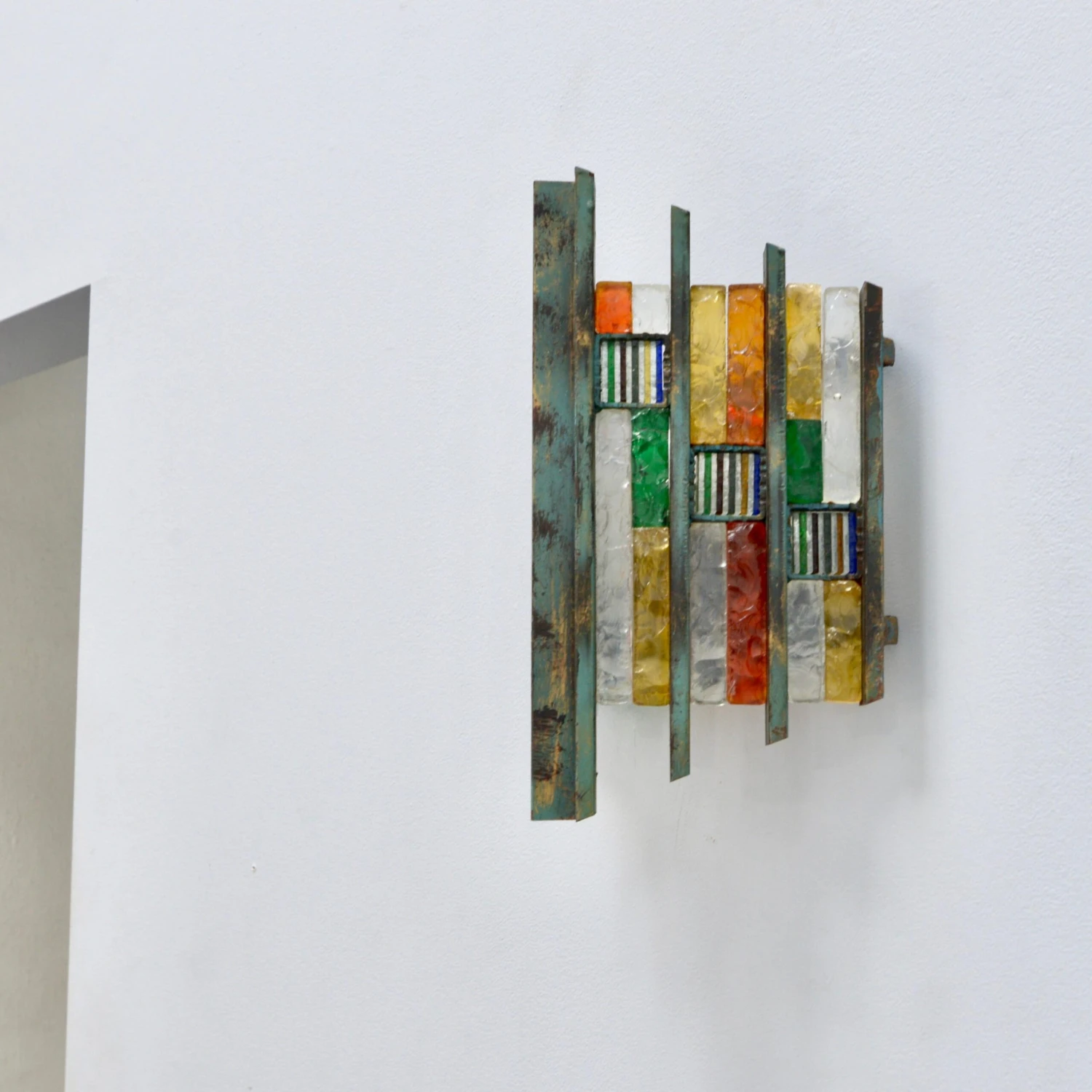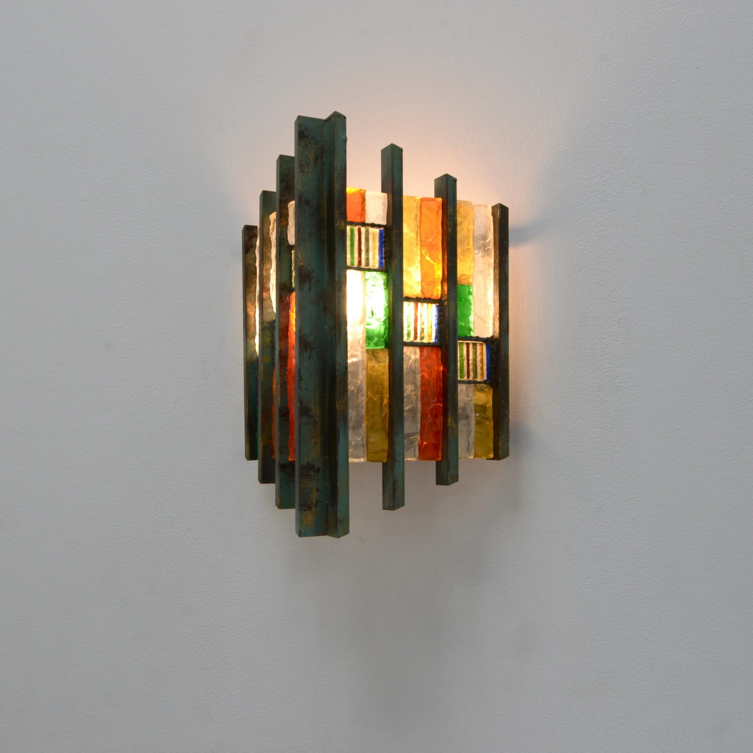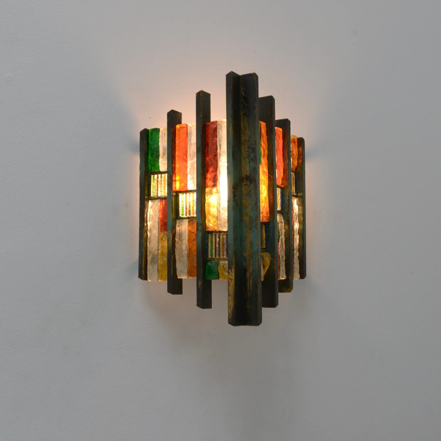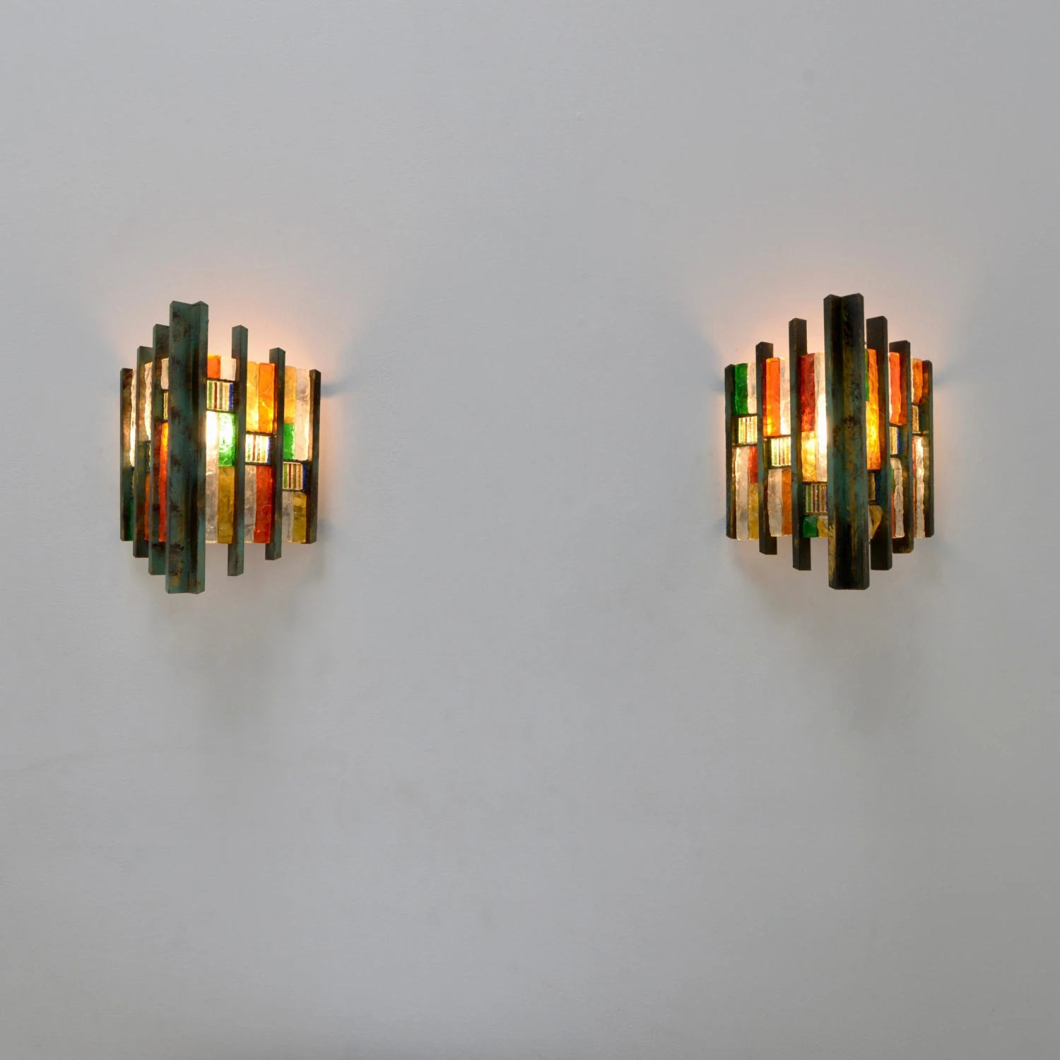 Pair of fantastic Brutalist glass Poliarte sconces from Italy of the 1970s. In multicolored glass and steel in original finish. Wired with a single E-26 medium based socket per sconce. These fixtures can be wired for any worldwide location. Light bulbs included with order. Sold and priced as a pair.