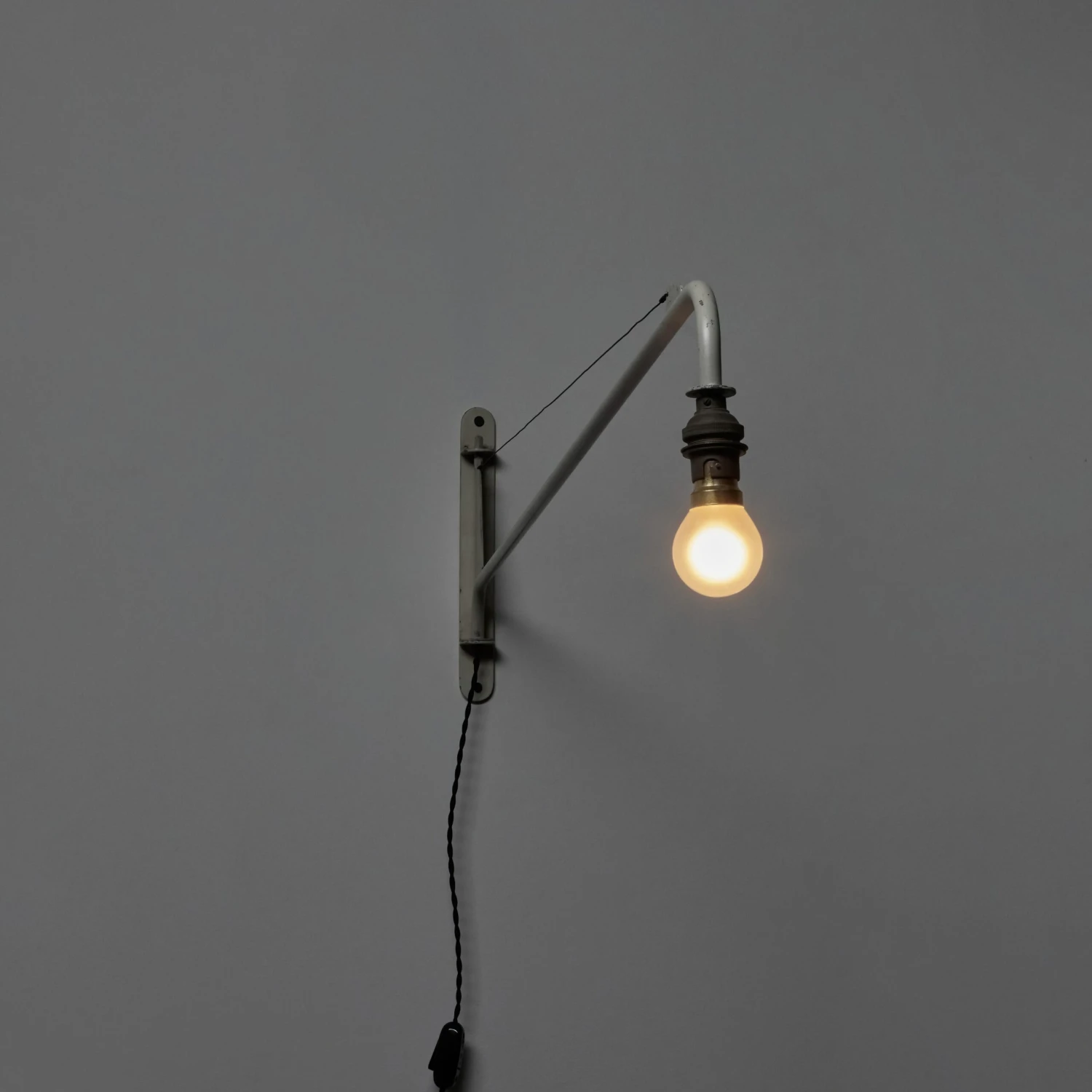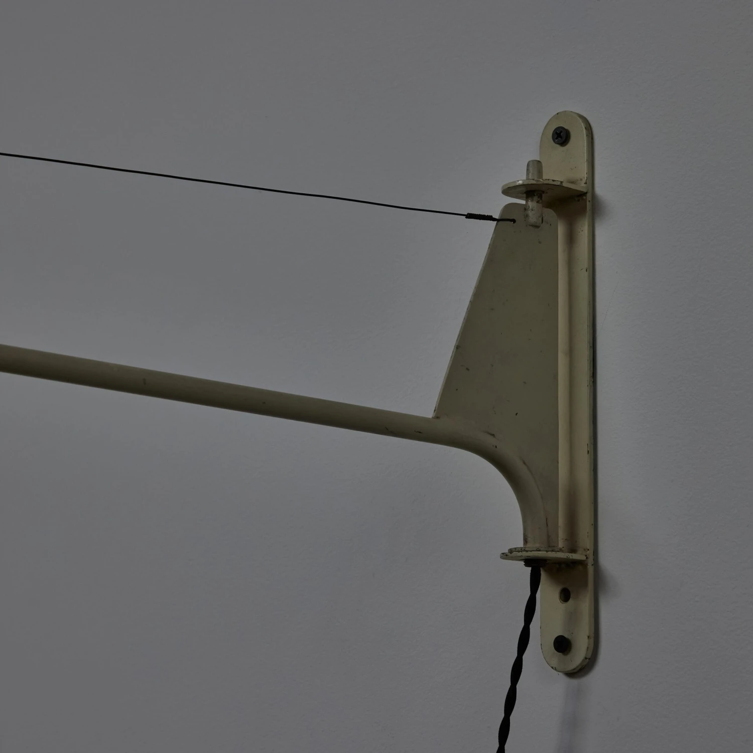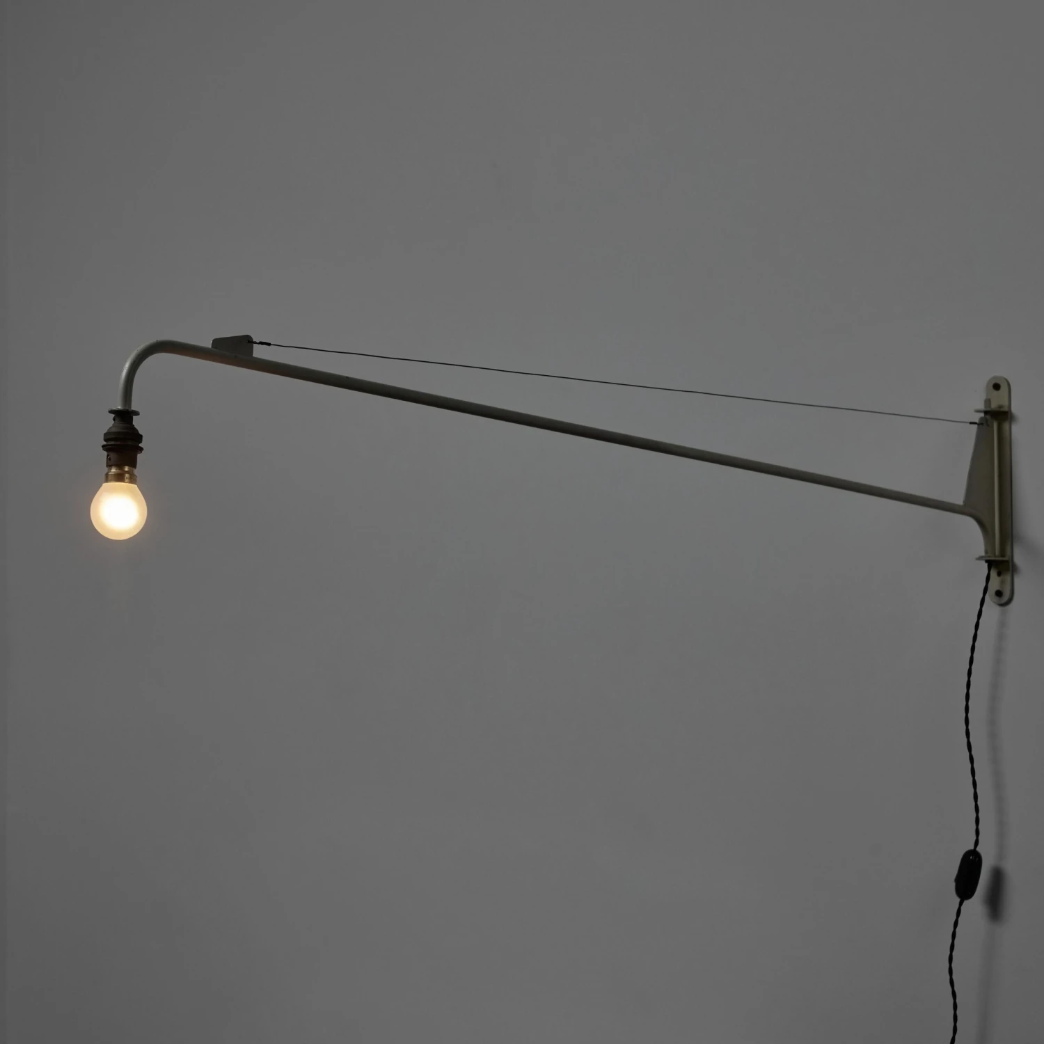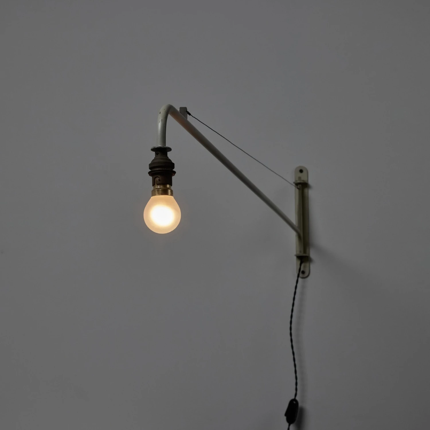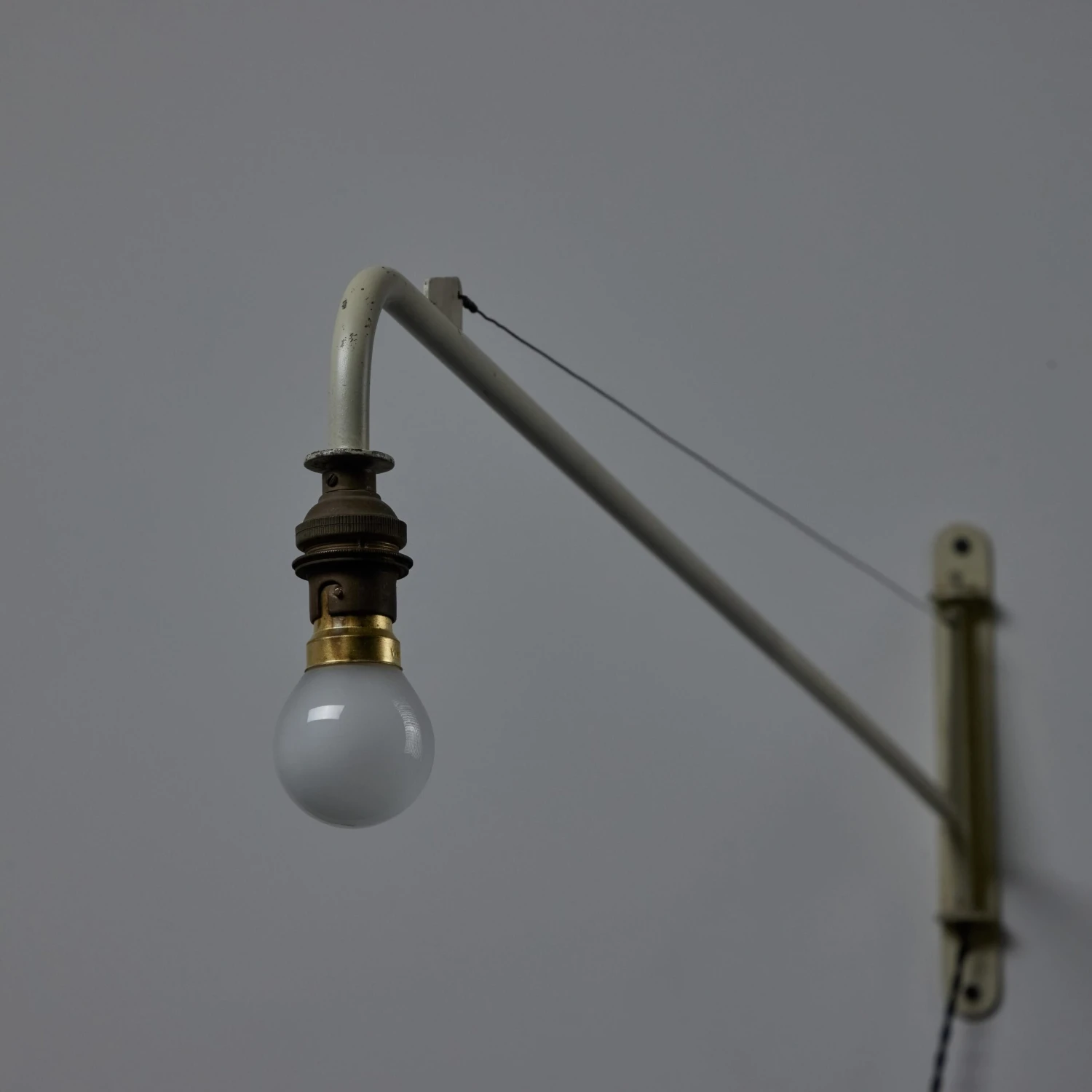 ‘Potence d’Eclairage’ swing jib wall light by Jean Prouve. Designed and manufactured in Italy, circa the 1950s. Truly iconic jib arm wall light by Prouve was at the forefront of the utilitarian swing arm light design. A simple nautical and attractive wall mount construction is displayed in an enameled bone-white finish. The light holds a single bayonet B-22 socket type. We recommend a 20W max b-22 bulb. Bulb provided as a one -time courtesy.